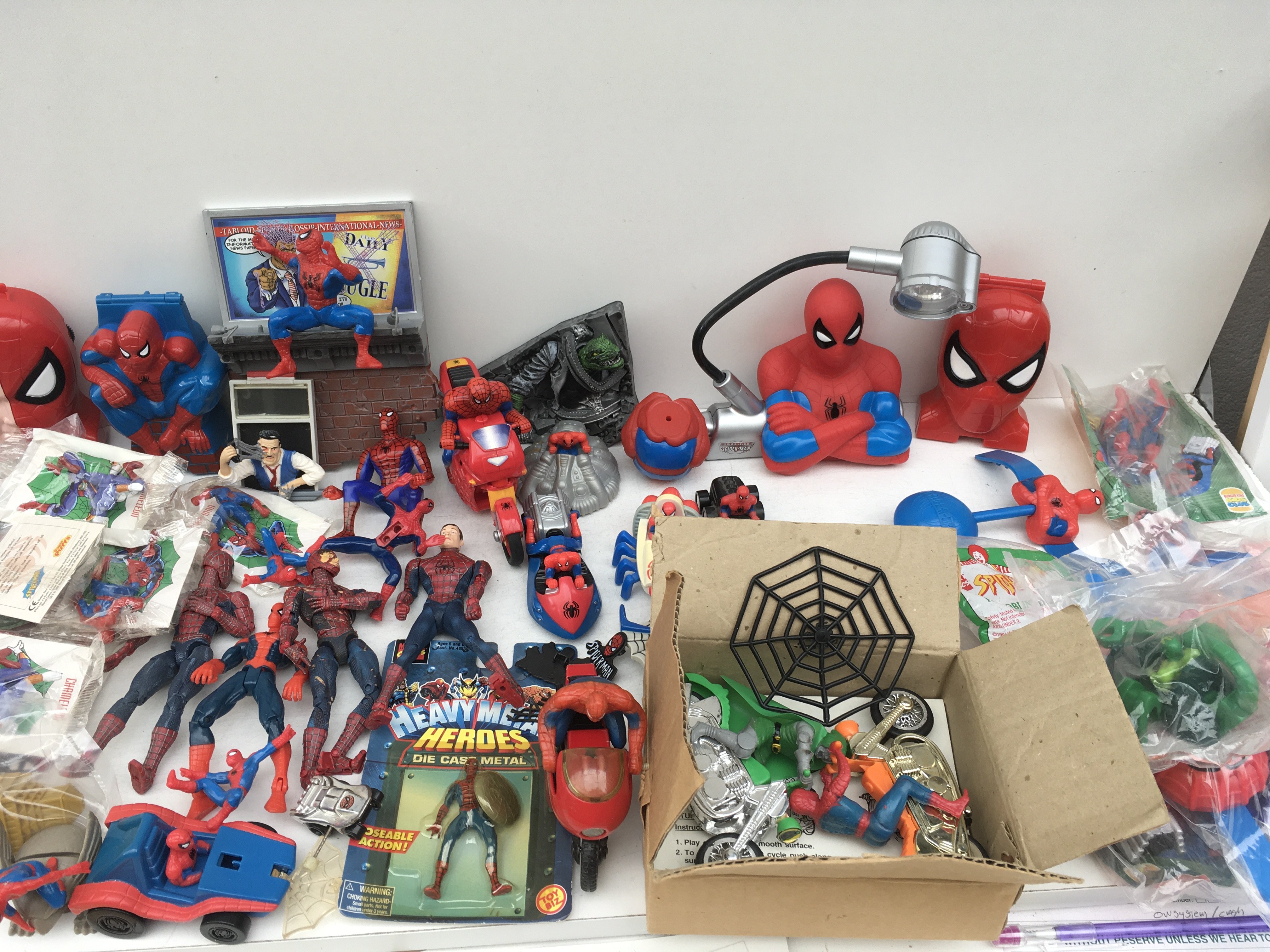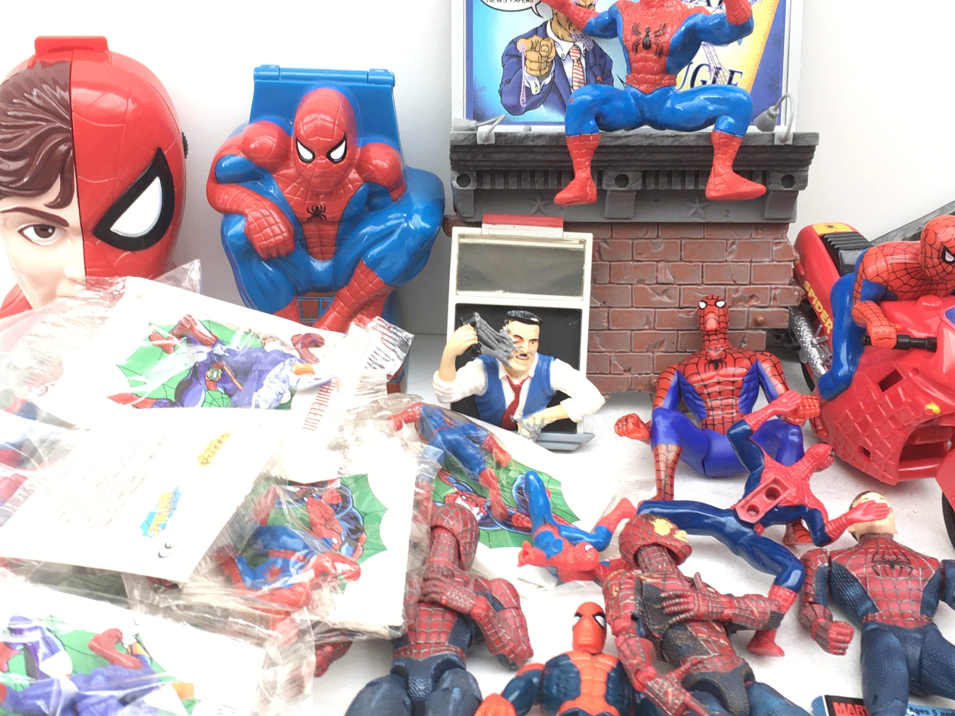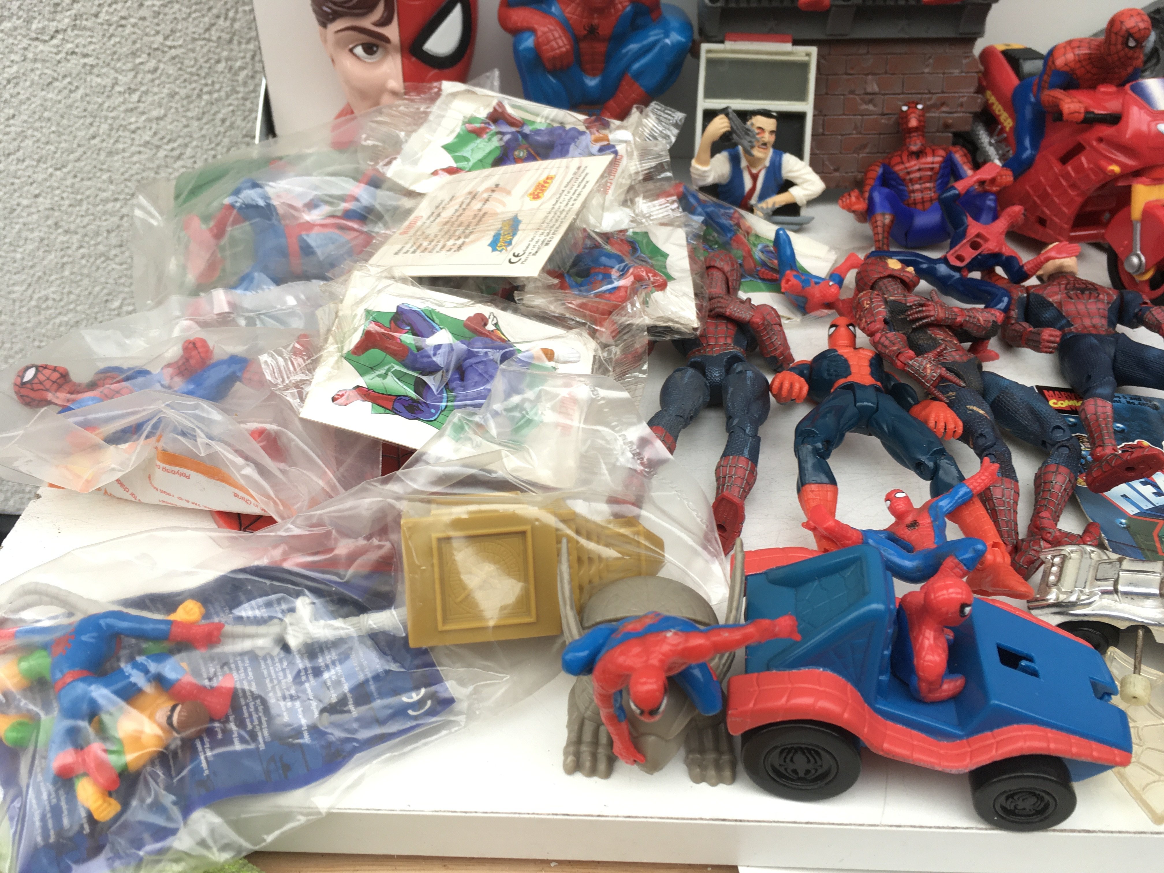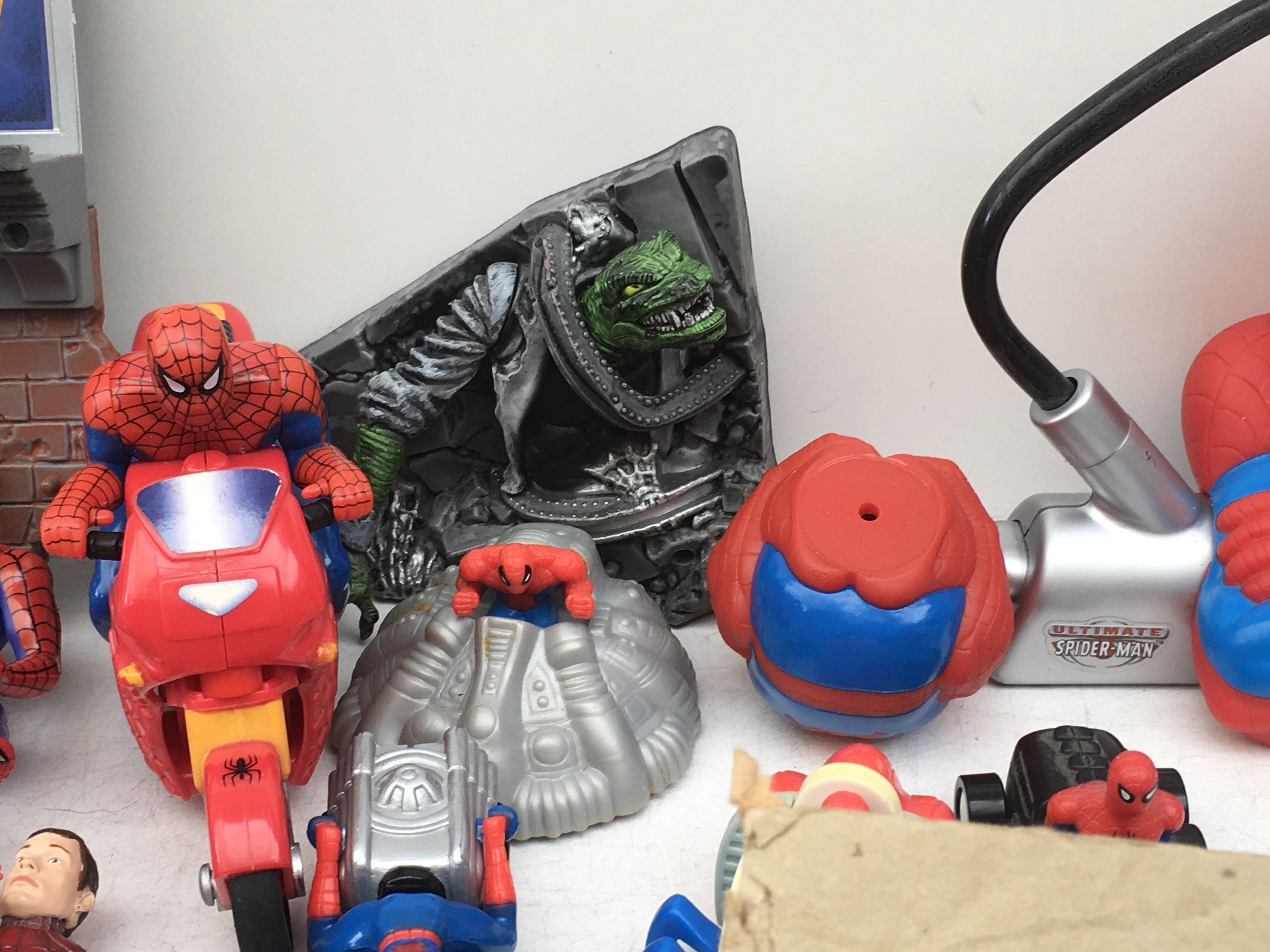 A collection of Spider-Man items including action figures..vehicles..unopened McDonald’s toys..play sets etc