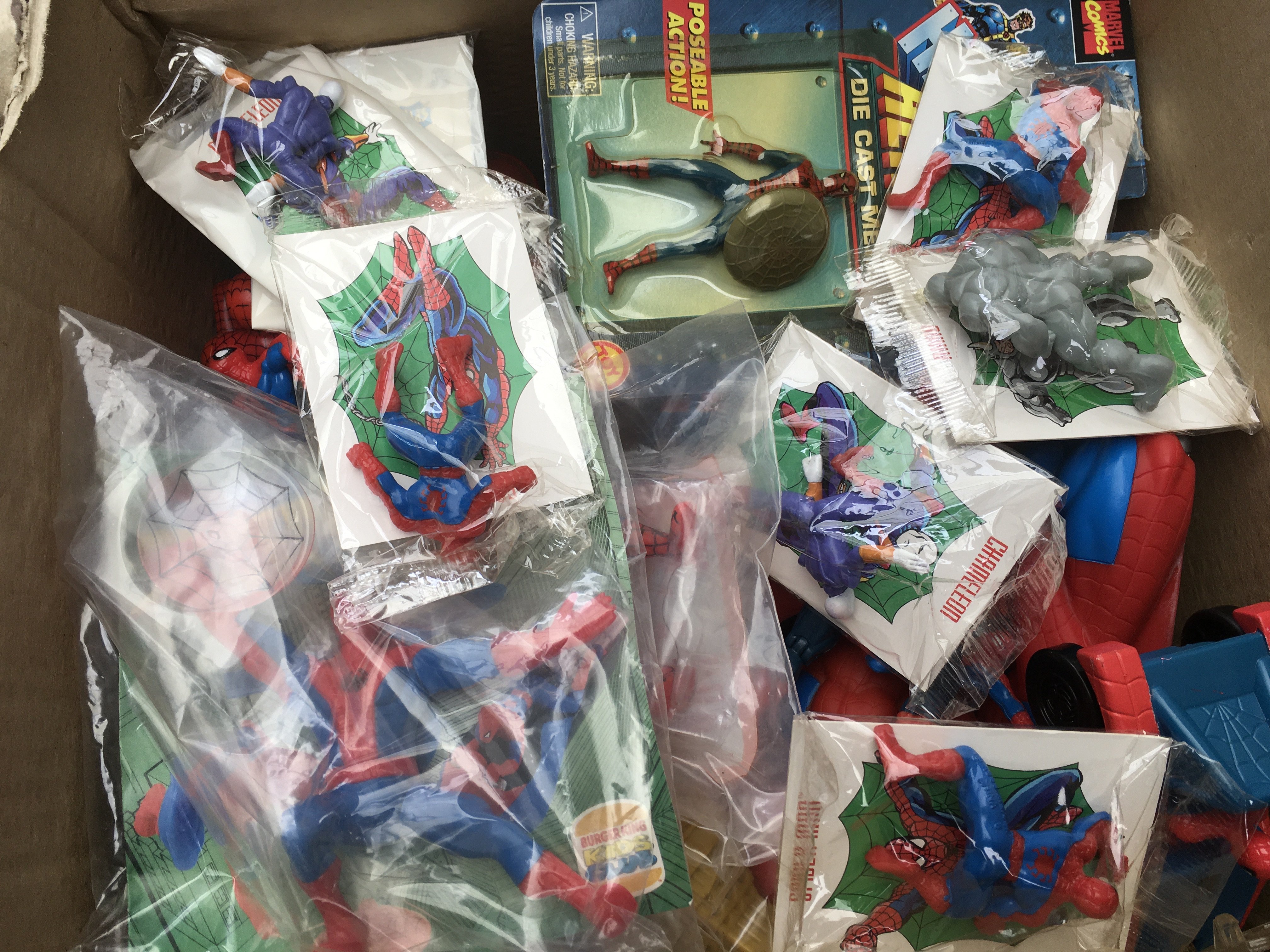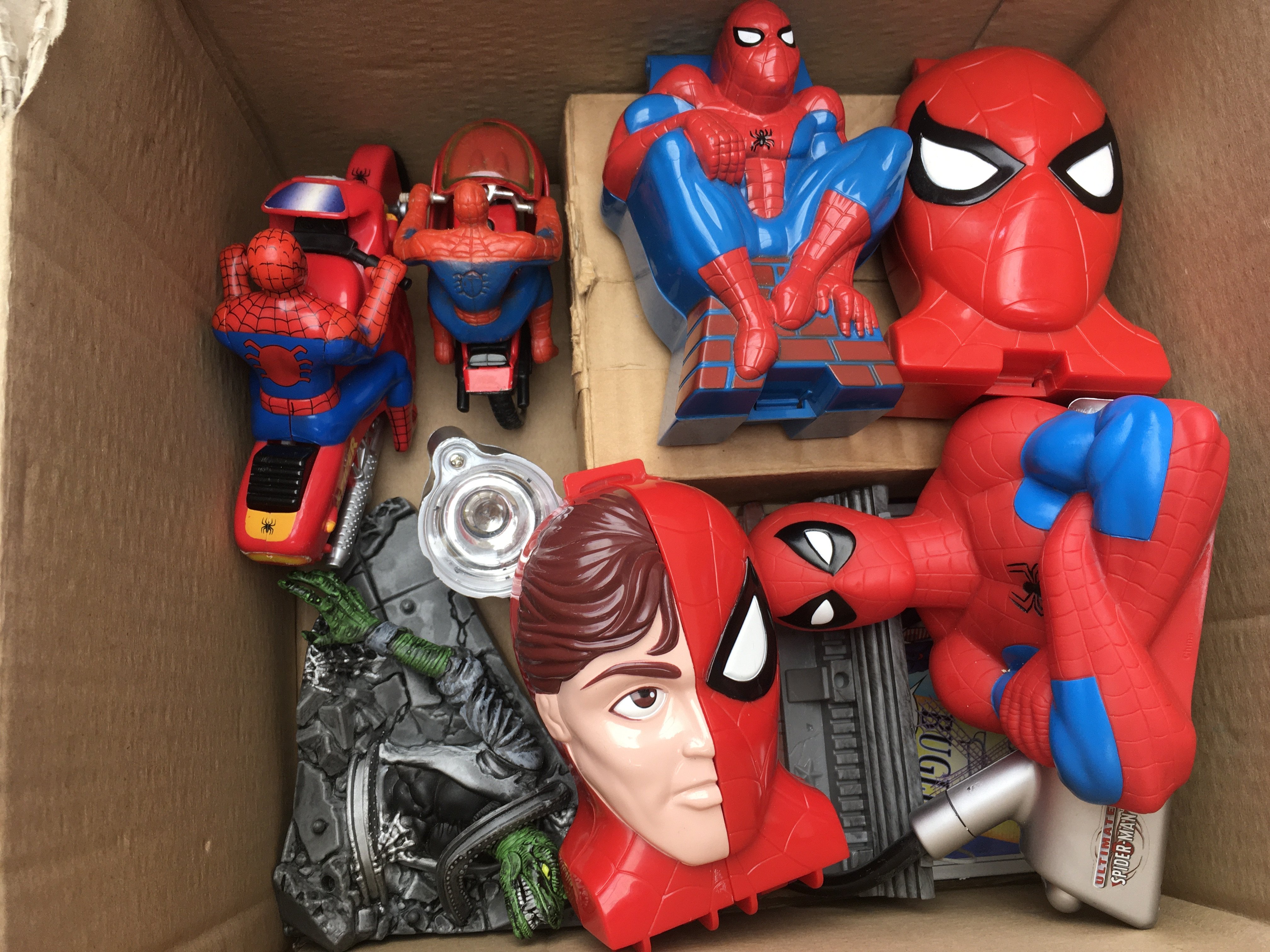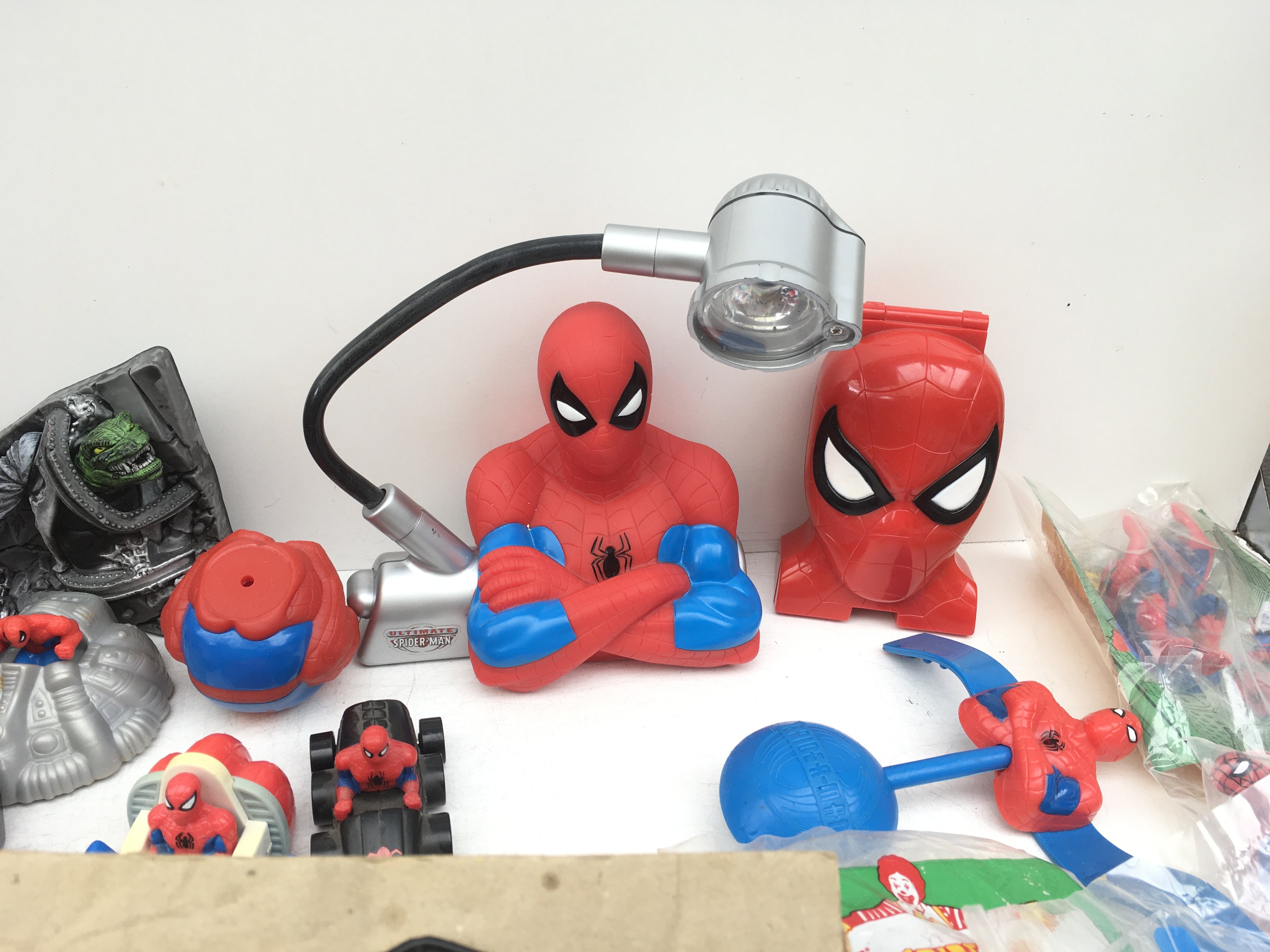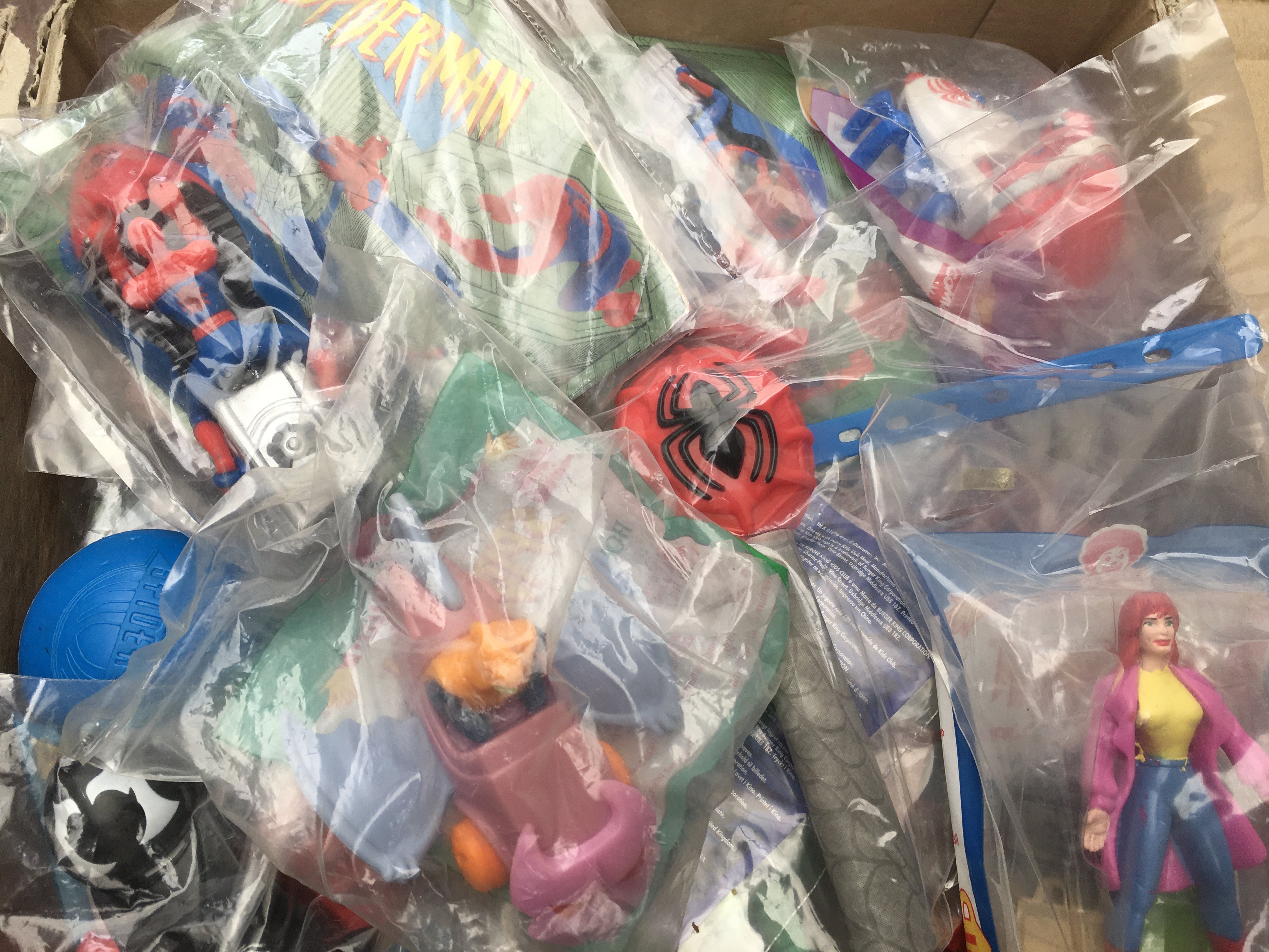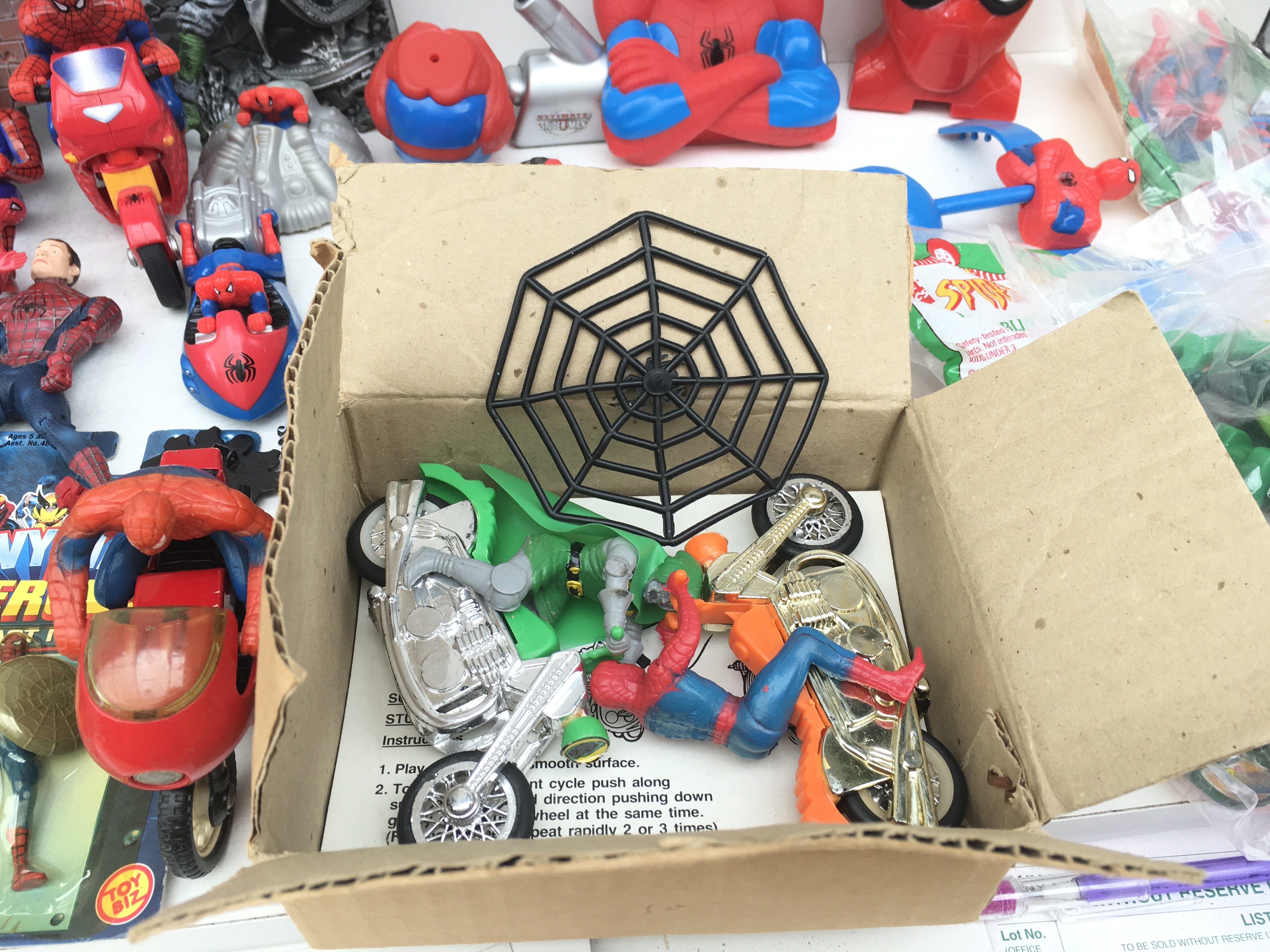 A collection of Spider-Man items including action figures..vehicles..unopened McDonald’s toys..play sets etc
