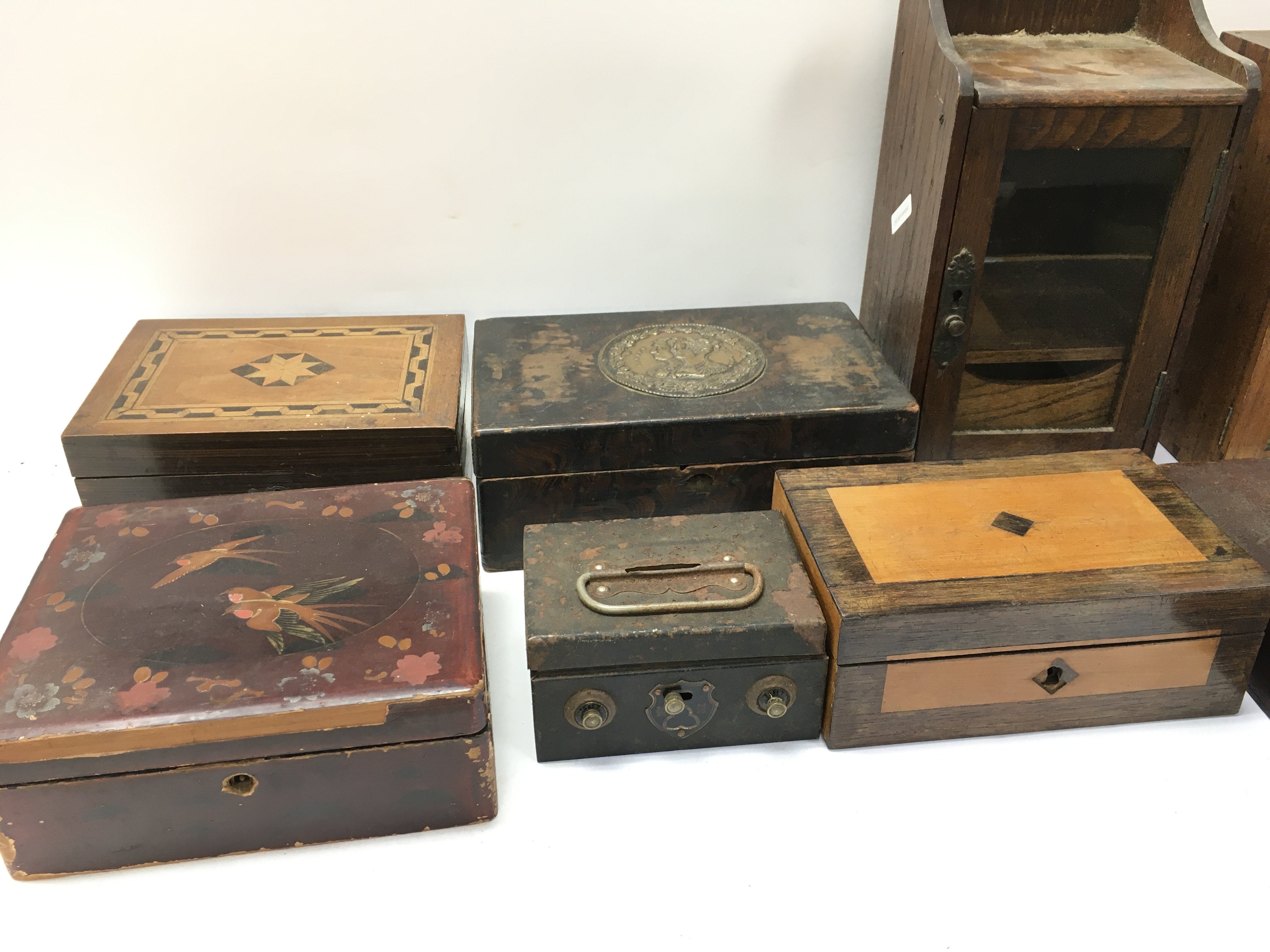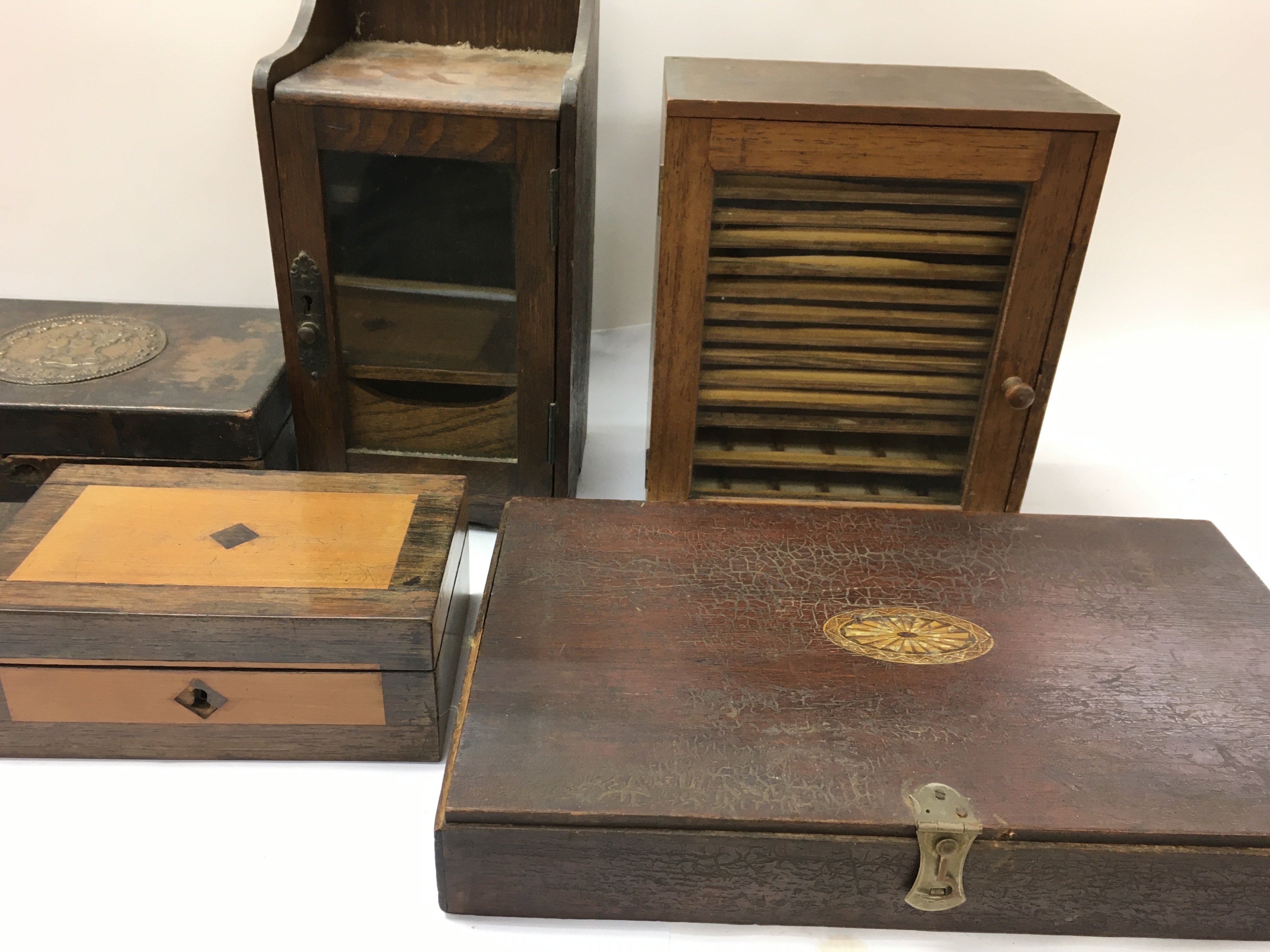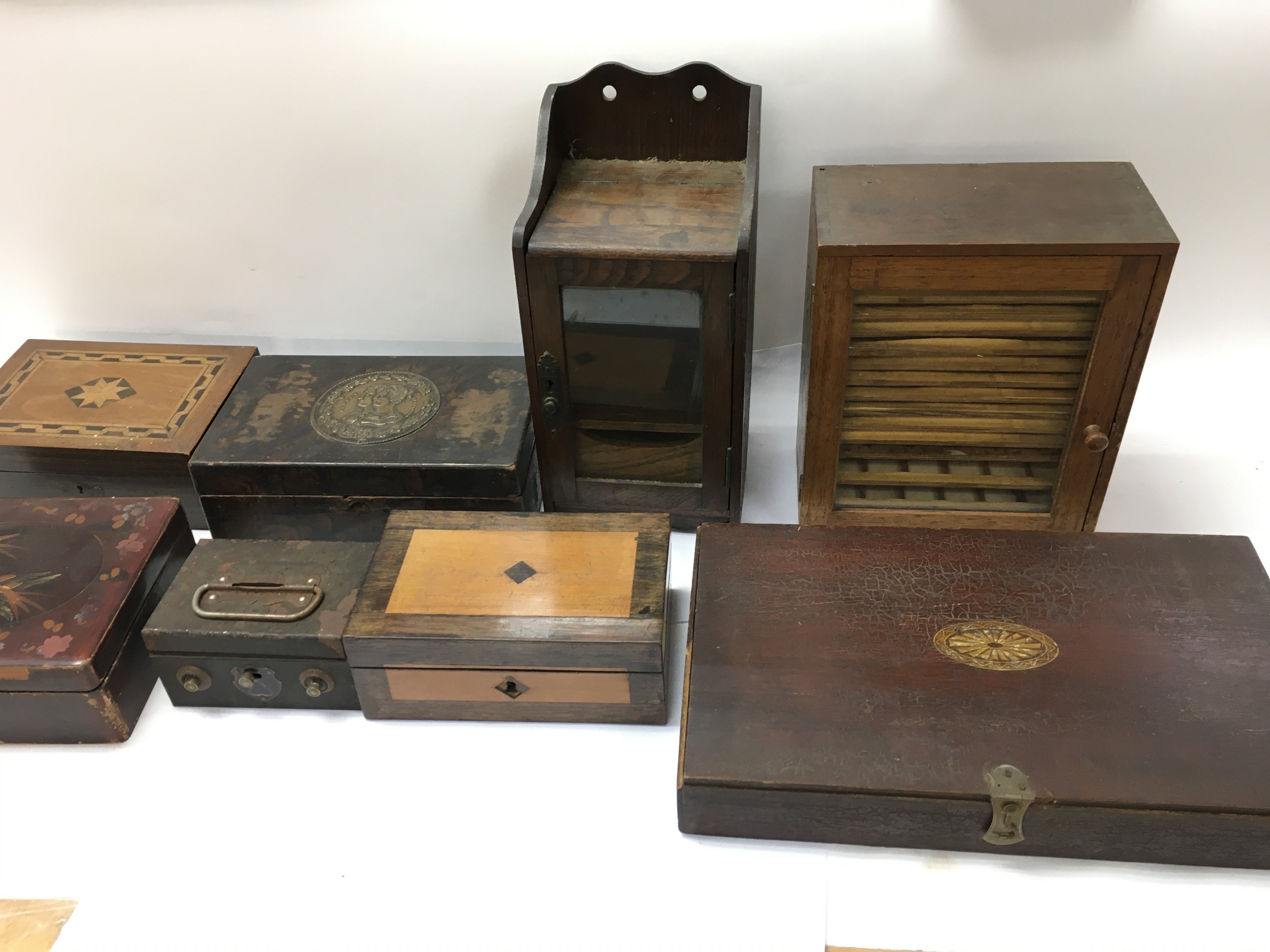 An assortment of vintage wooden boxes including a small glass fronted collectors cabinet.