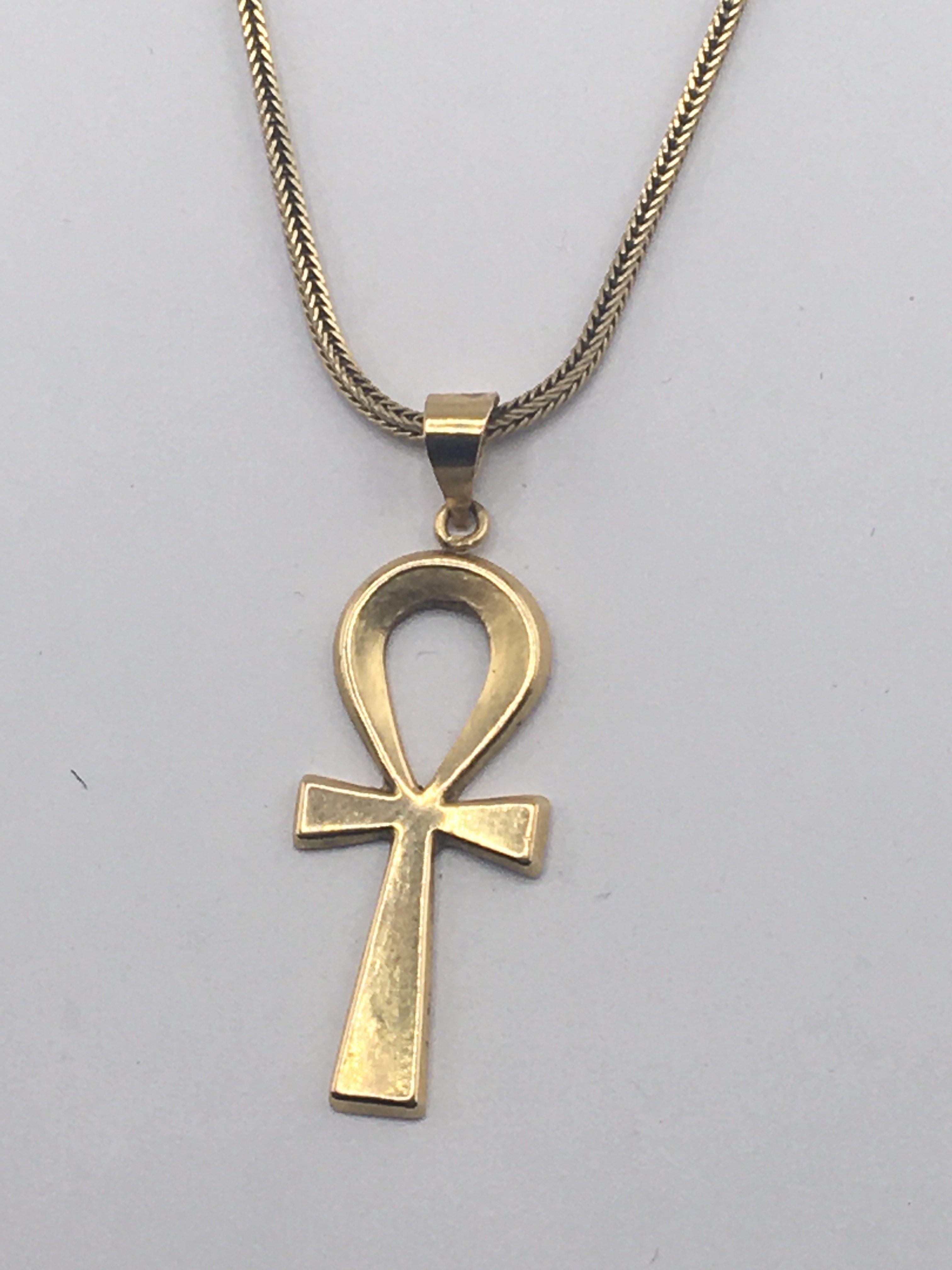 An 18carat gold herringbone closed link necklace with attached Ankr pendent. Weight 11.4g