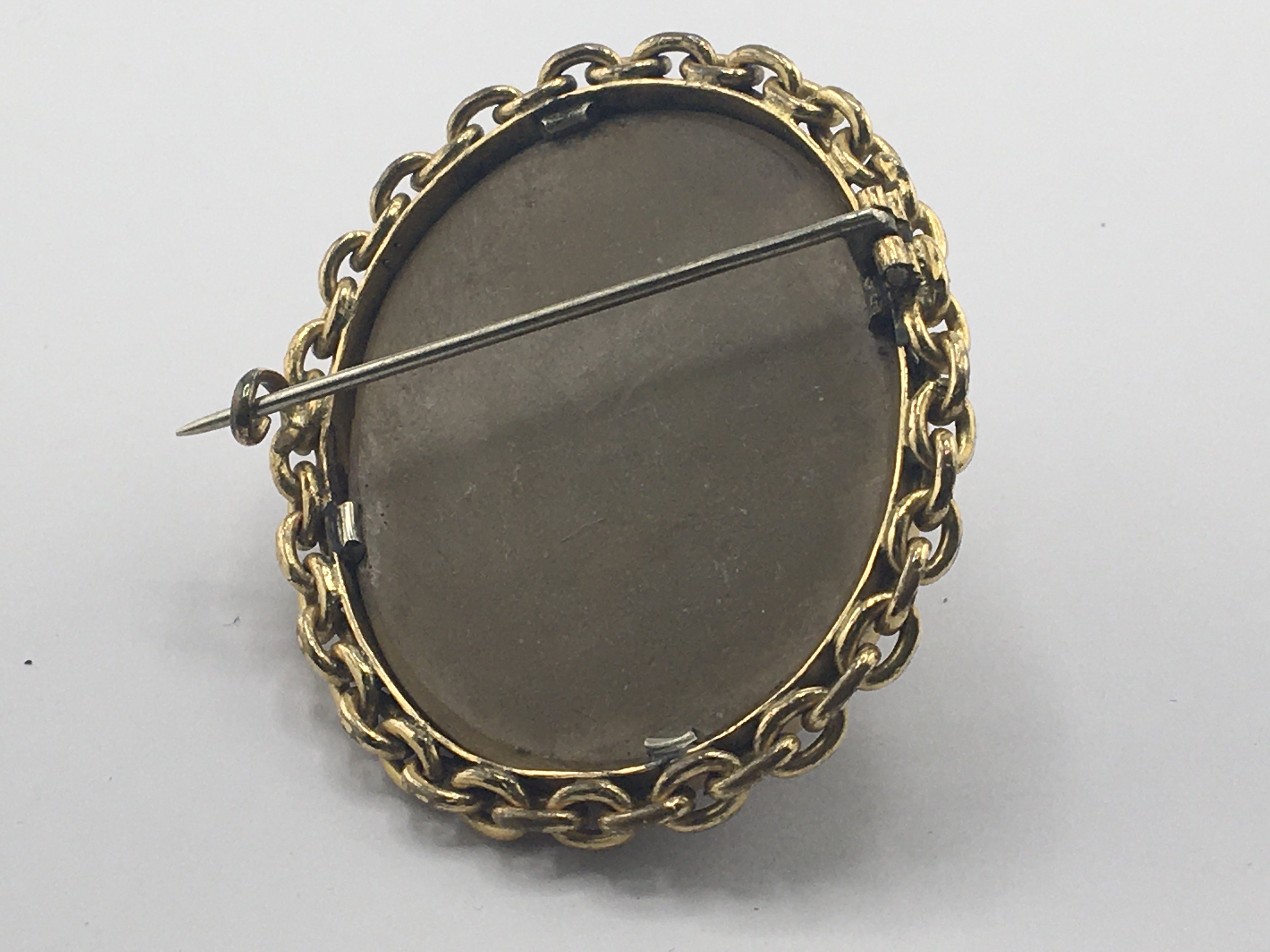 A carved Italian 19th Century Grand Tour carved volcanic rock brooch with high relief lava carving the form of a bust of a Neo classic lady.