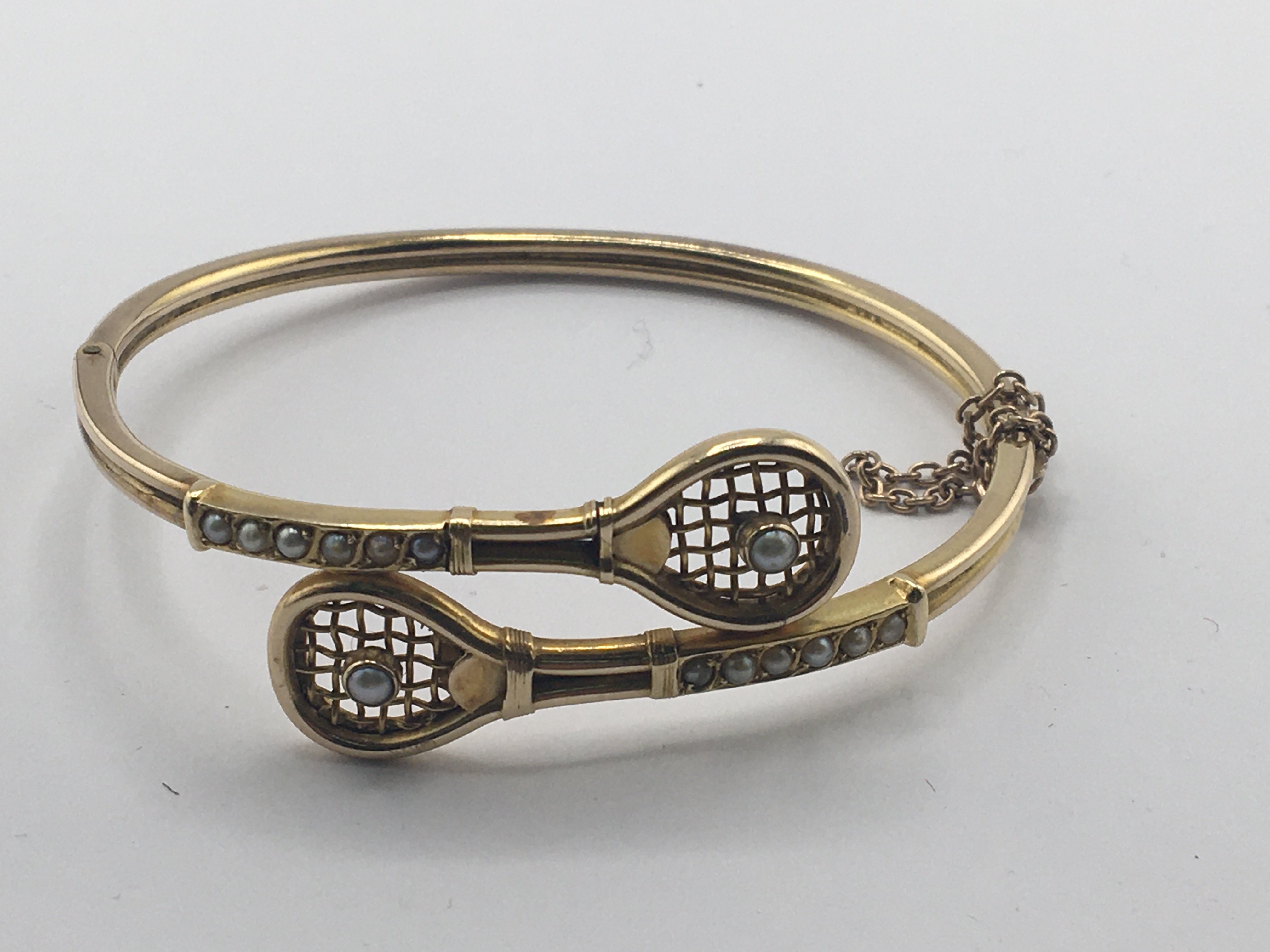 A Quality 9carat gold bracelet the ends in the form of tennis rackets and set with cultured pearls. Weight 10g approximately.