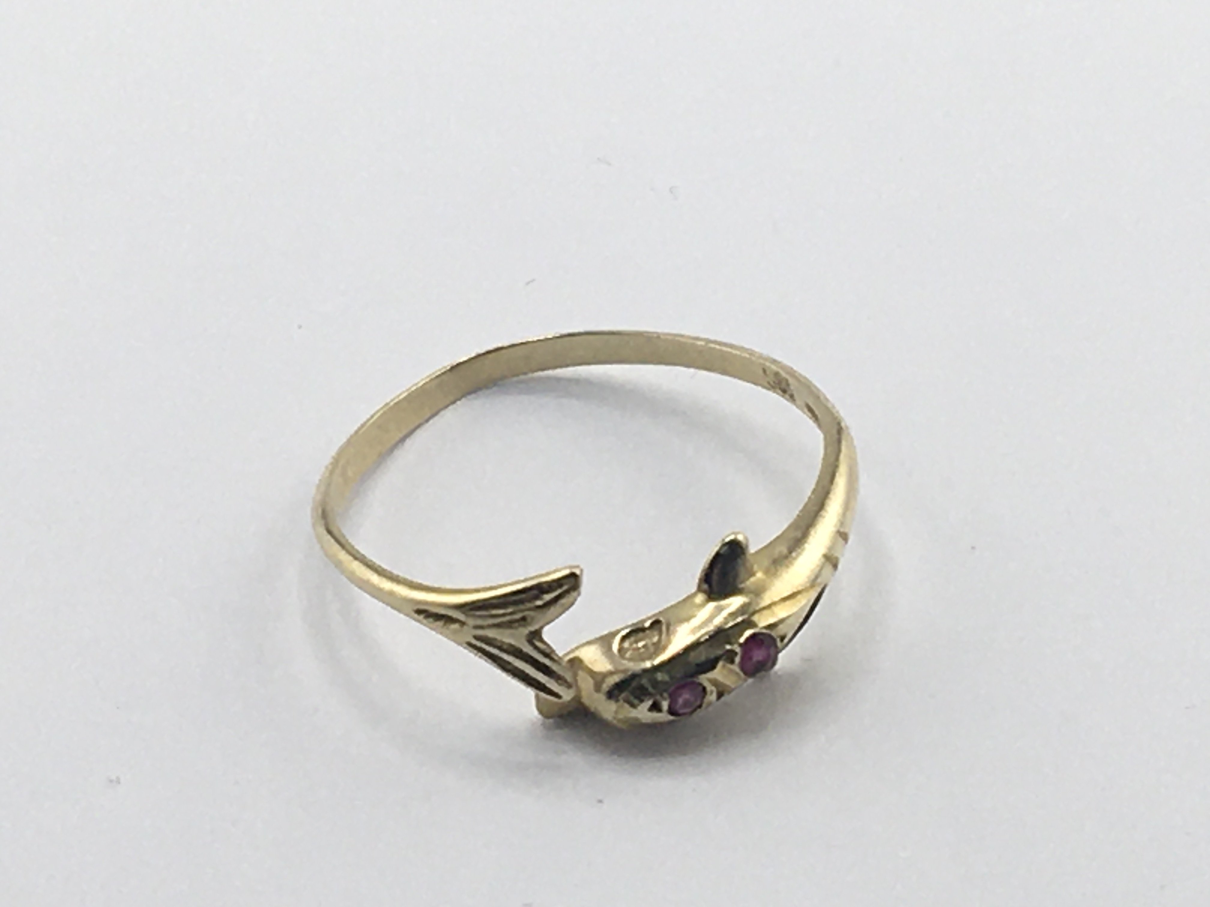 A 14carat gold ring set with ruby and in the form of Dolphins. Weight 1g