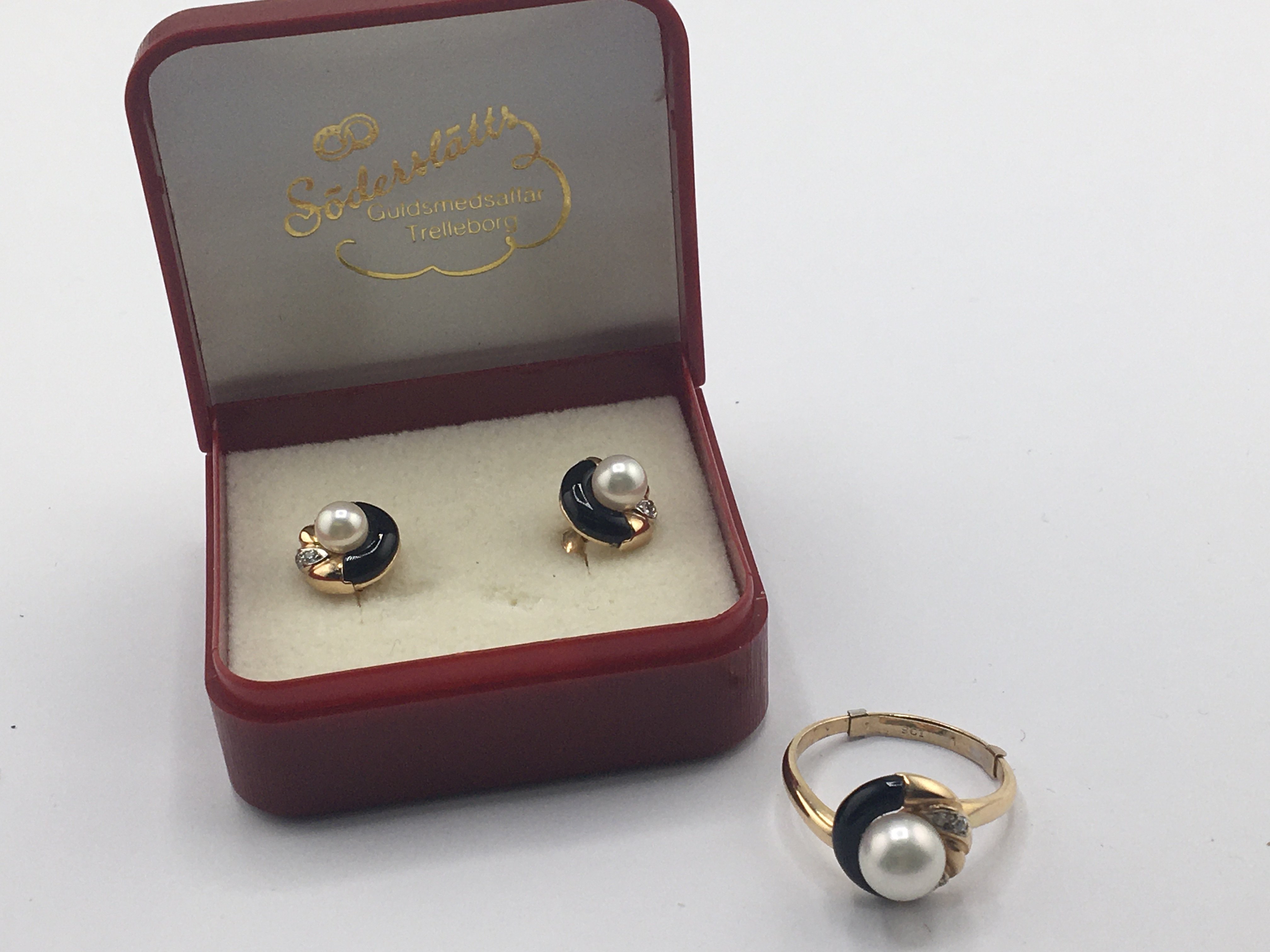 A modern design 18carat gold ring with matching earrings set with pearl and small diamonds.weight 7.5g