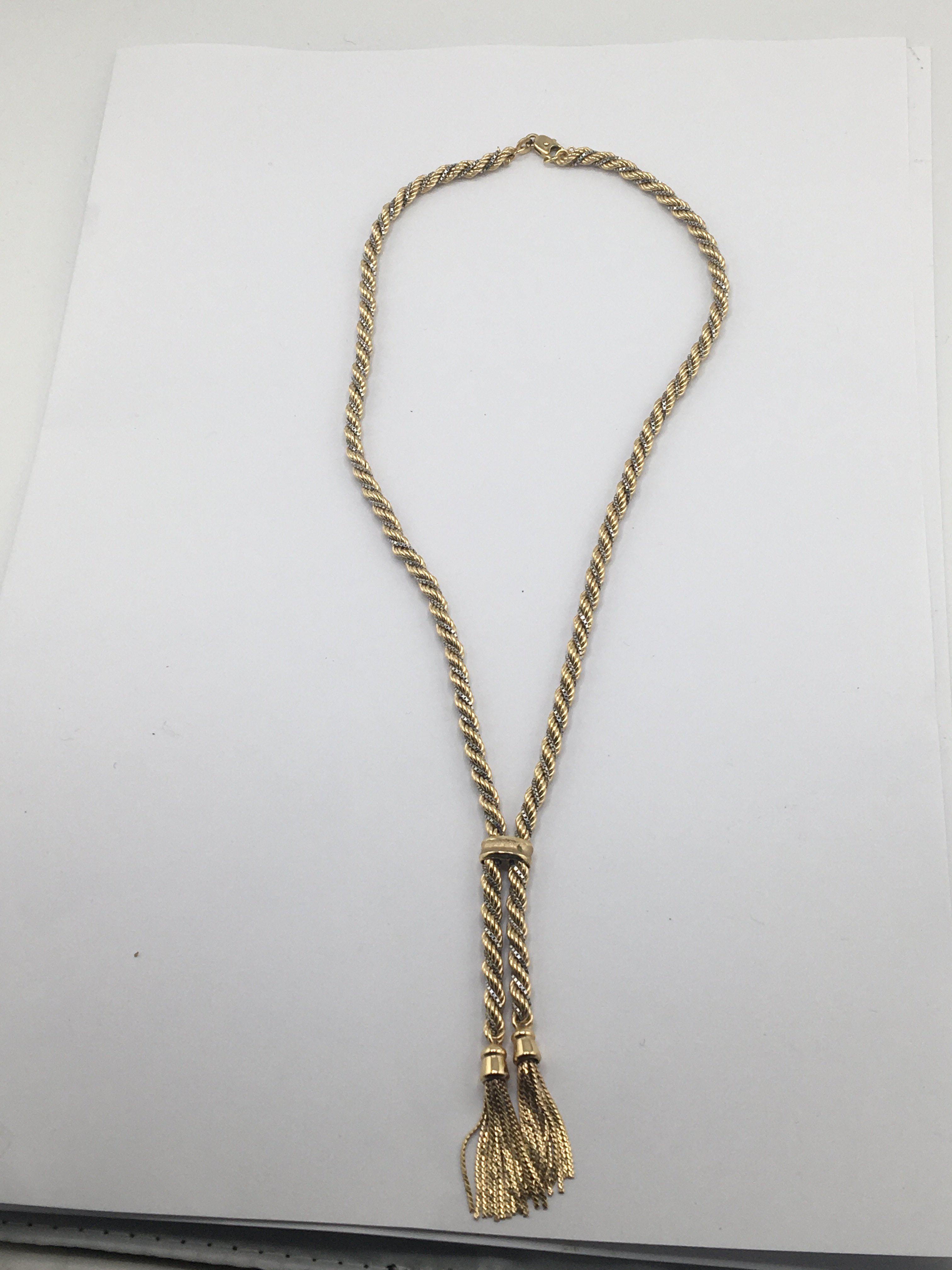 A Quality 9carat gold necklace rope chain with intertwined white gold and tassel ends. 21.5g