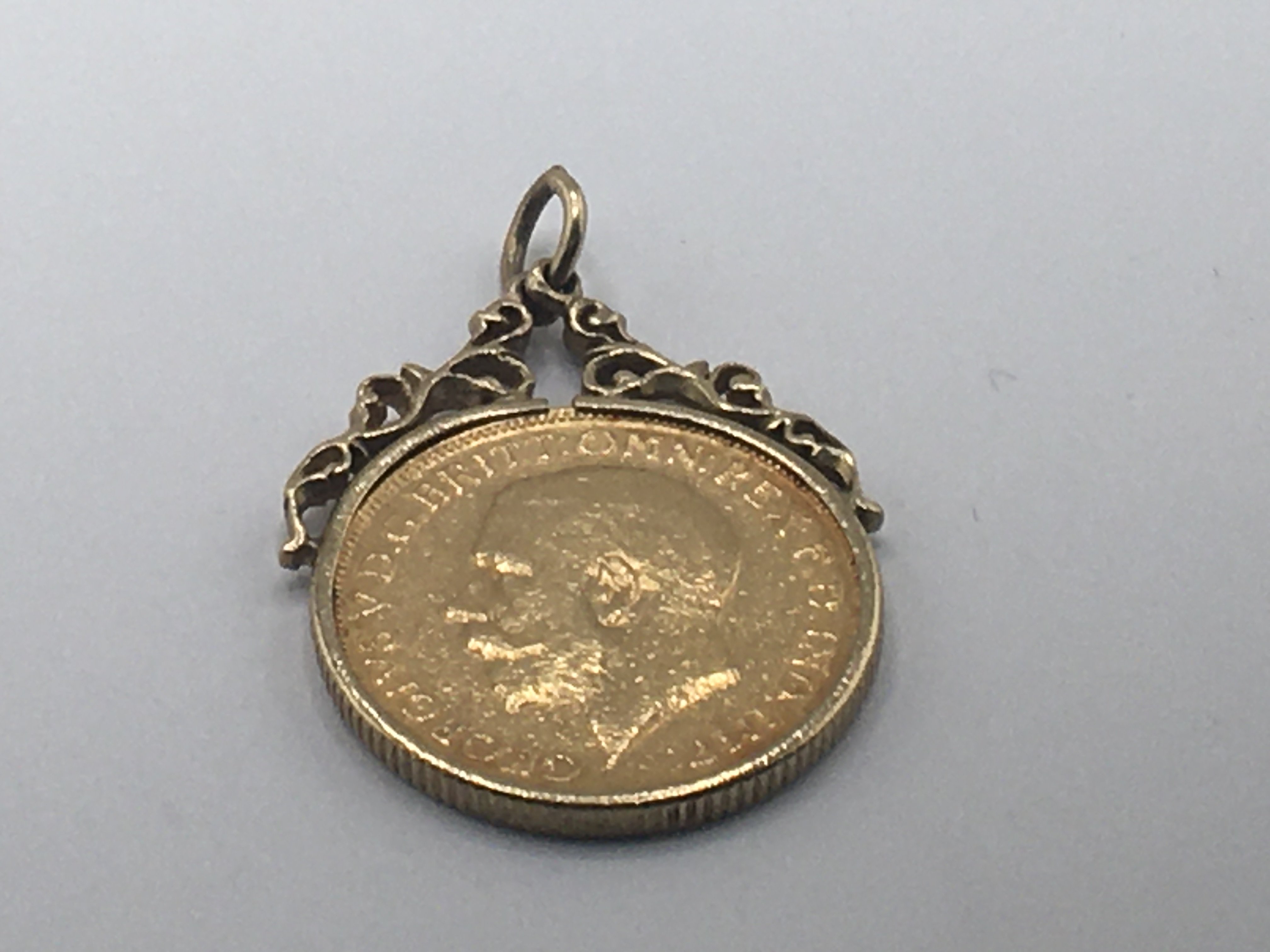 A George V gold Sovereign in a pendent mount. Total weight 9.7g