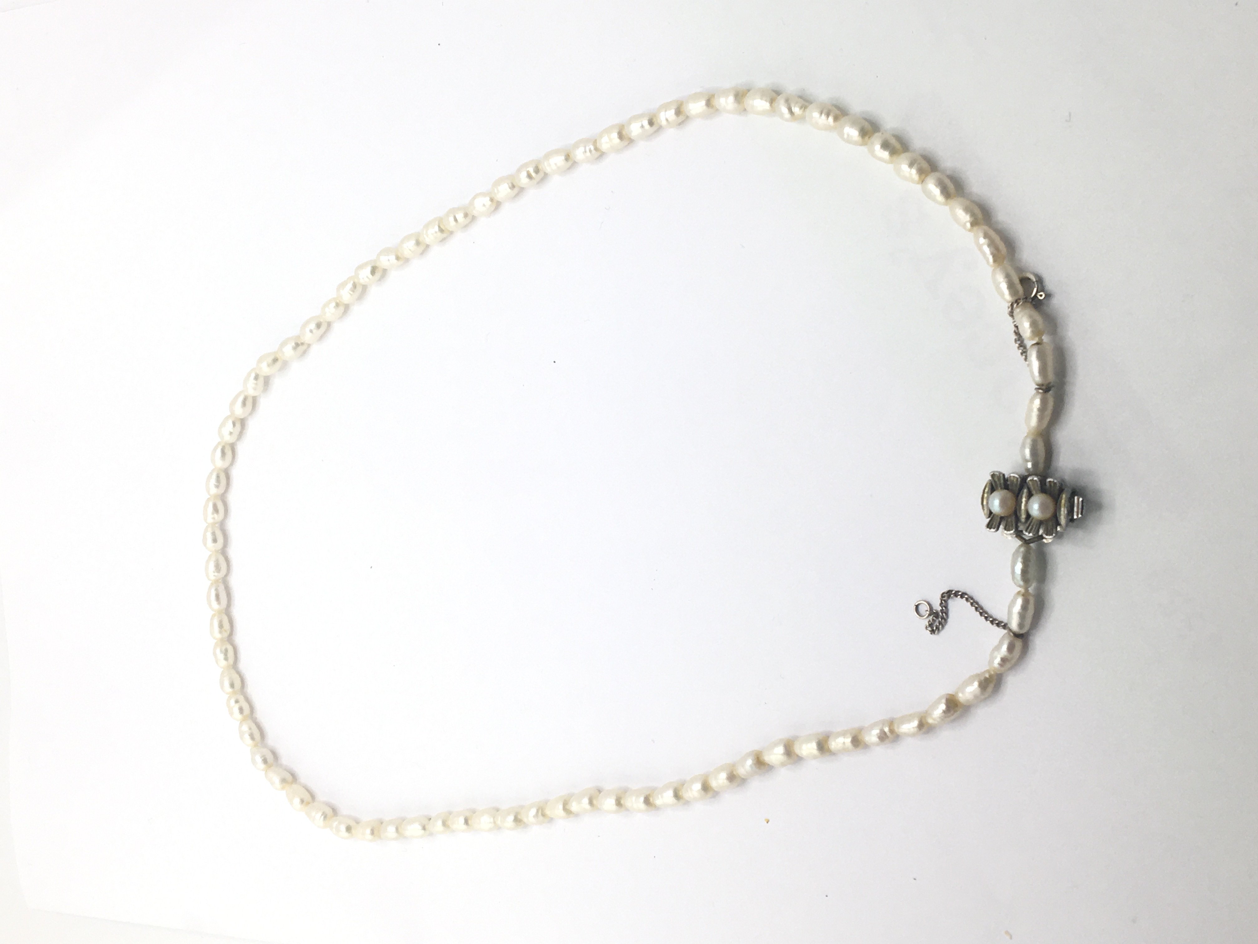 A pearl necklace with a silver clasp.Condition Report