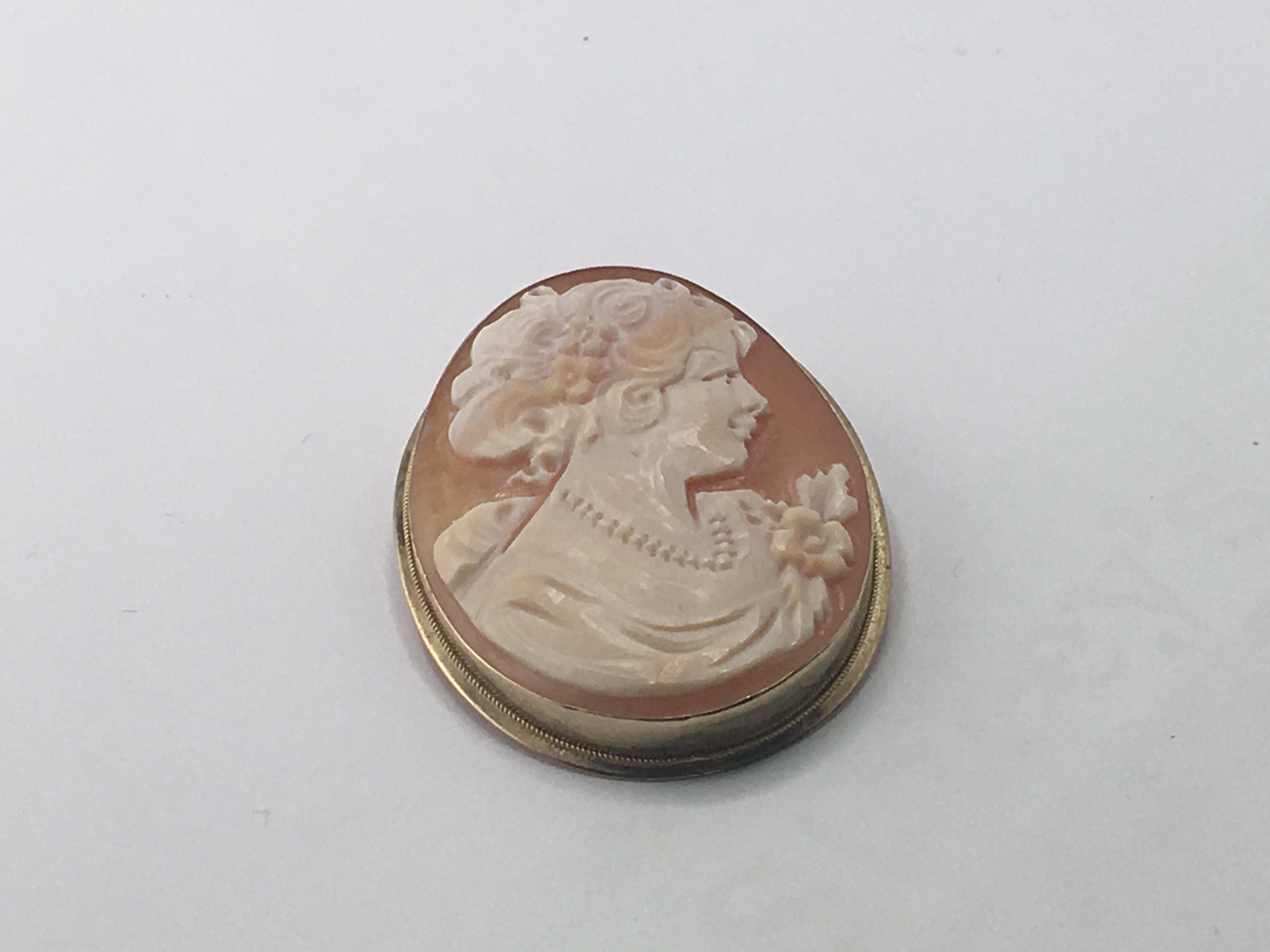 A Cameo brooch set in unmarked gold the cameo a side profile of an elegant lady.