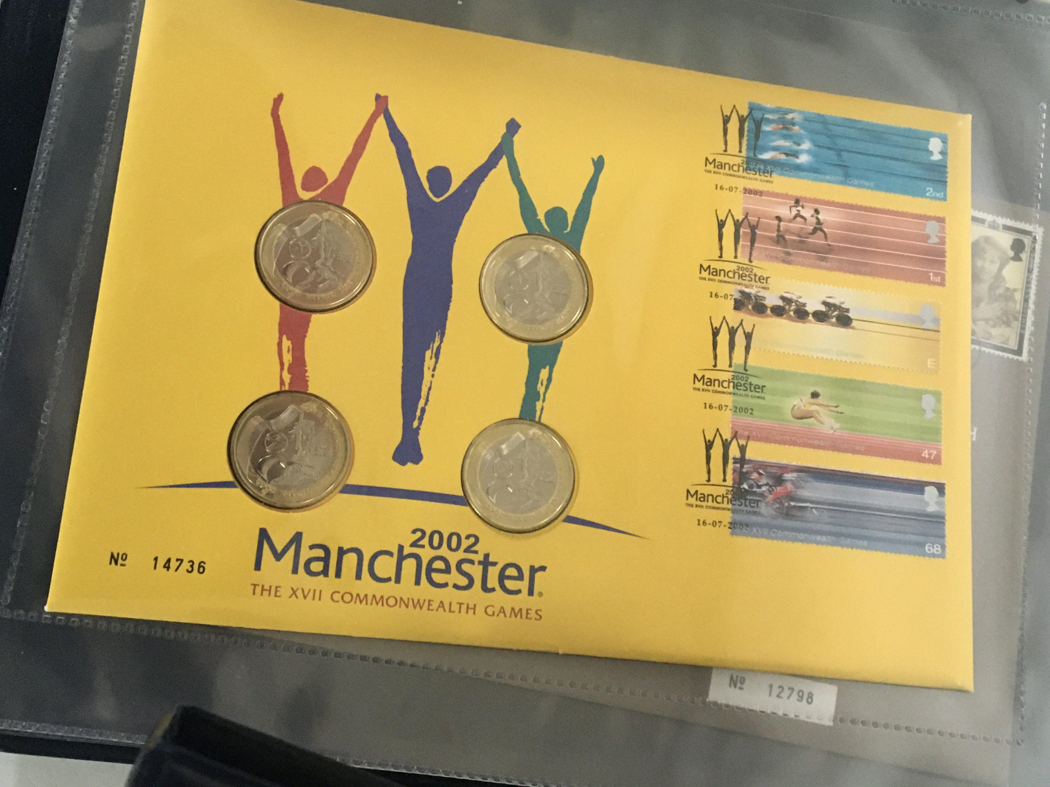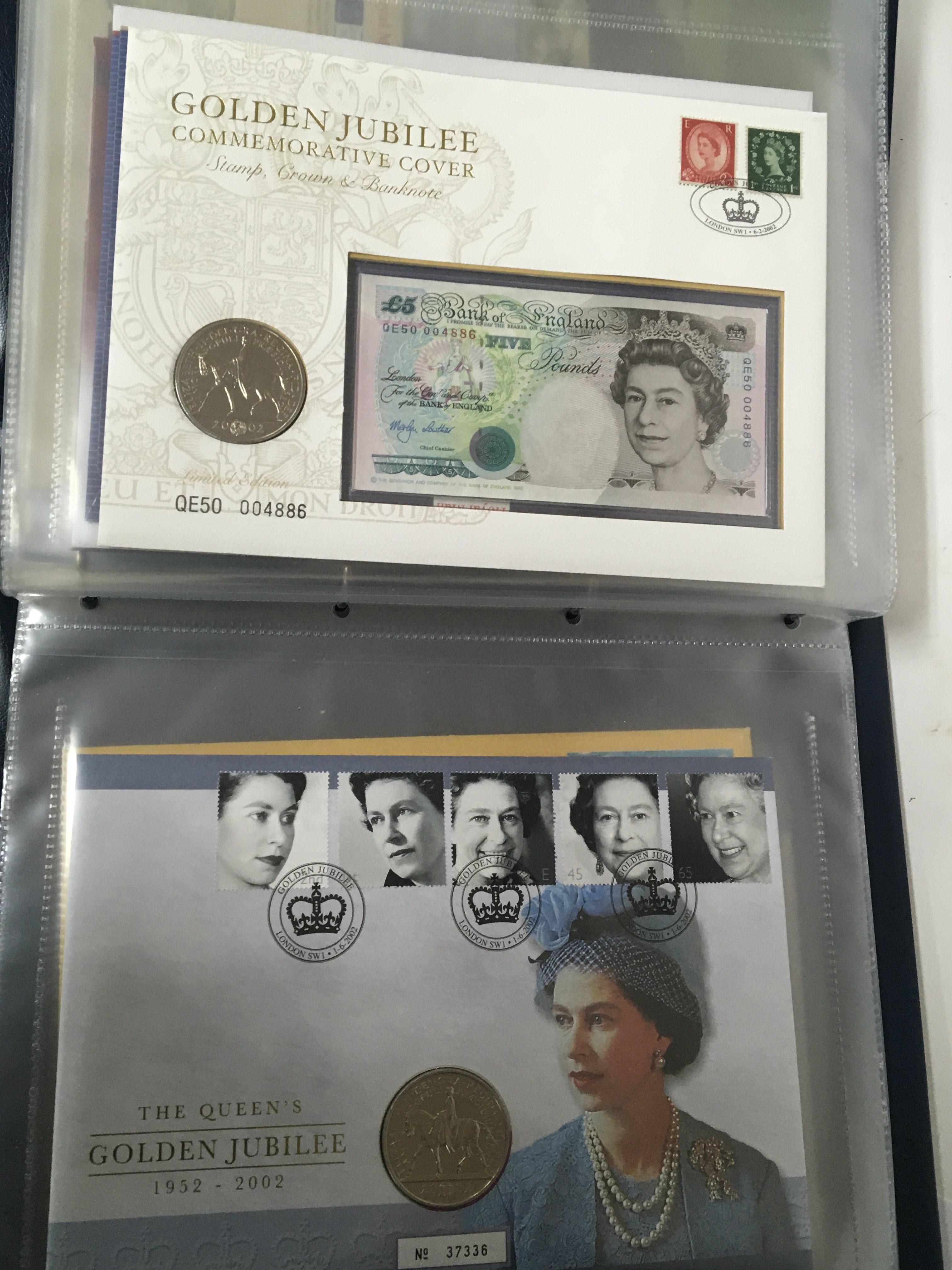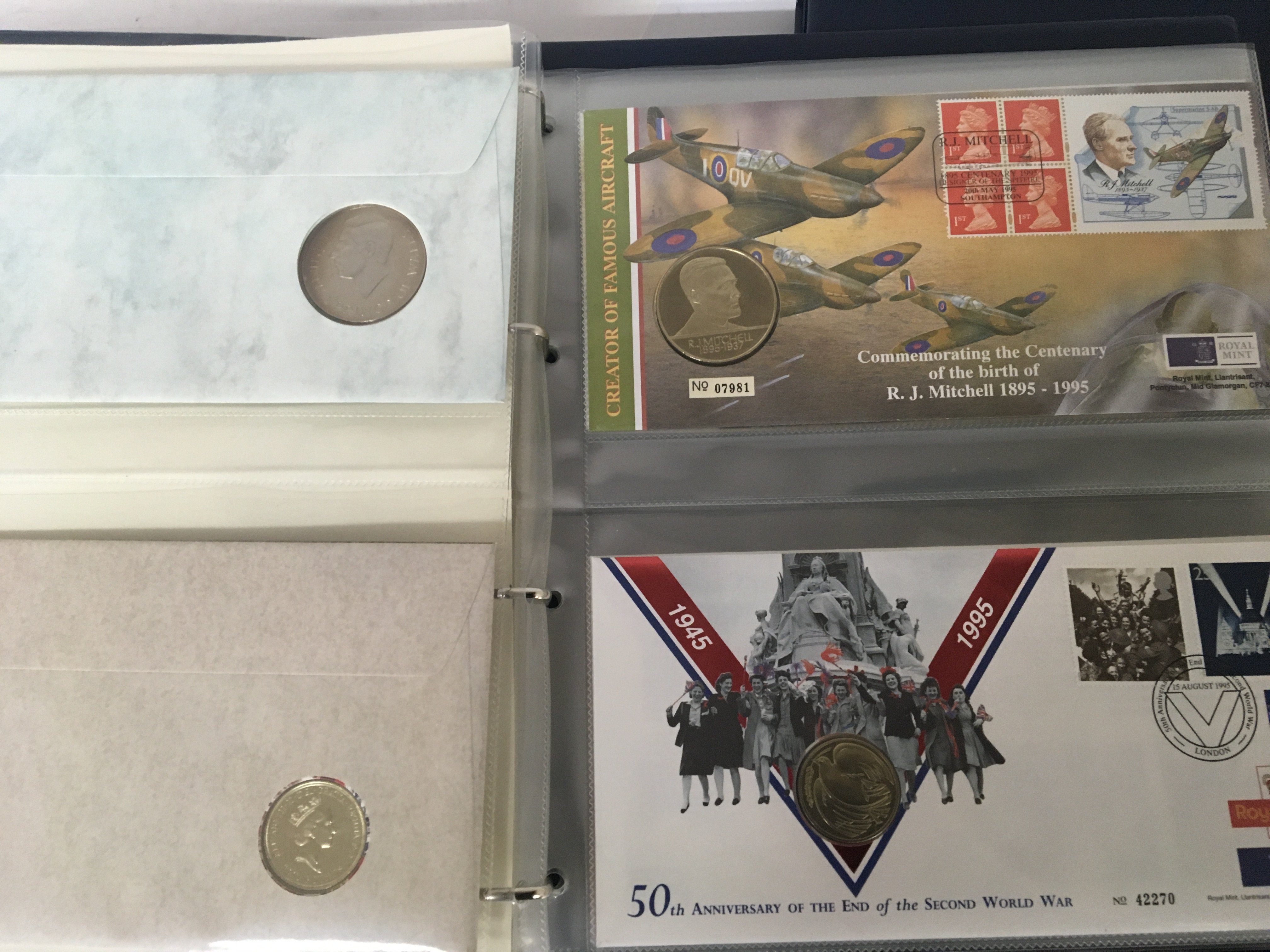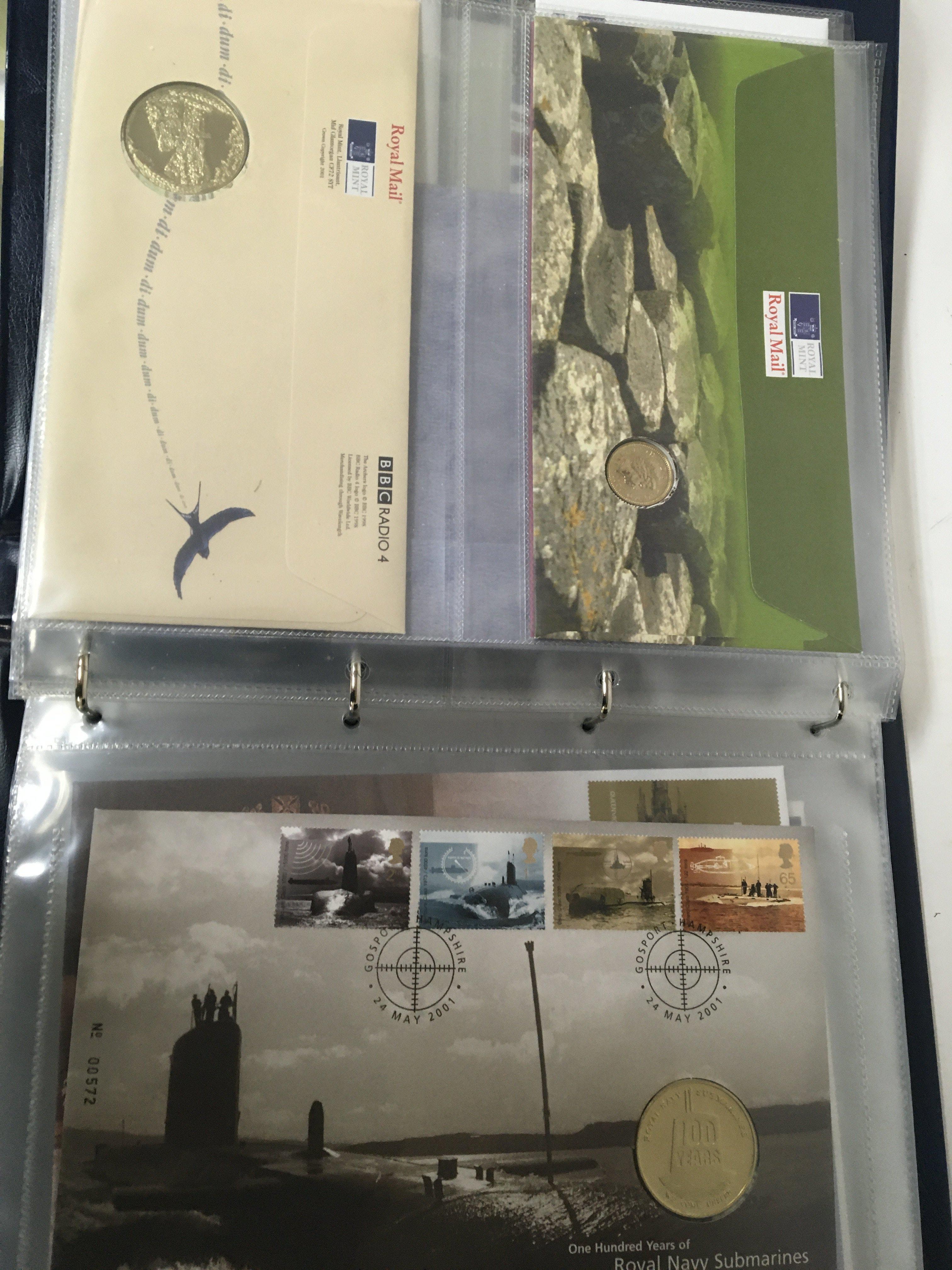 Three blue albums containing Royal Mail Philatelic Numismatic covers coin covers (3)