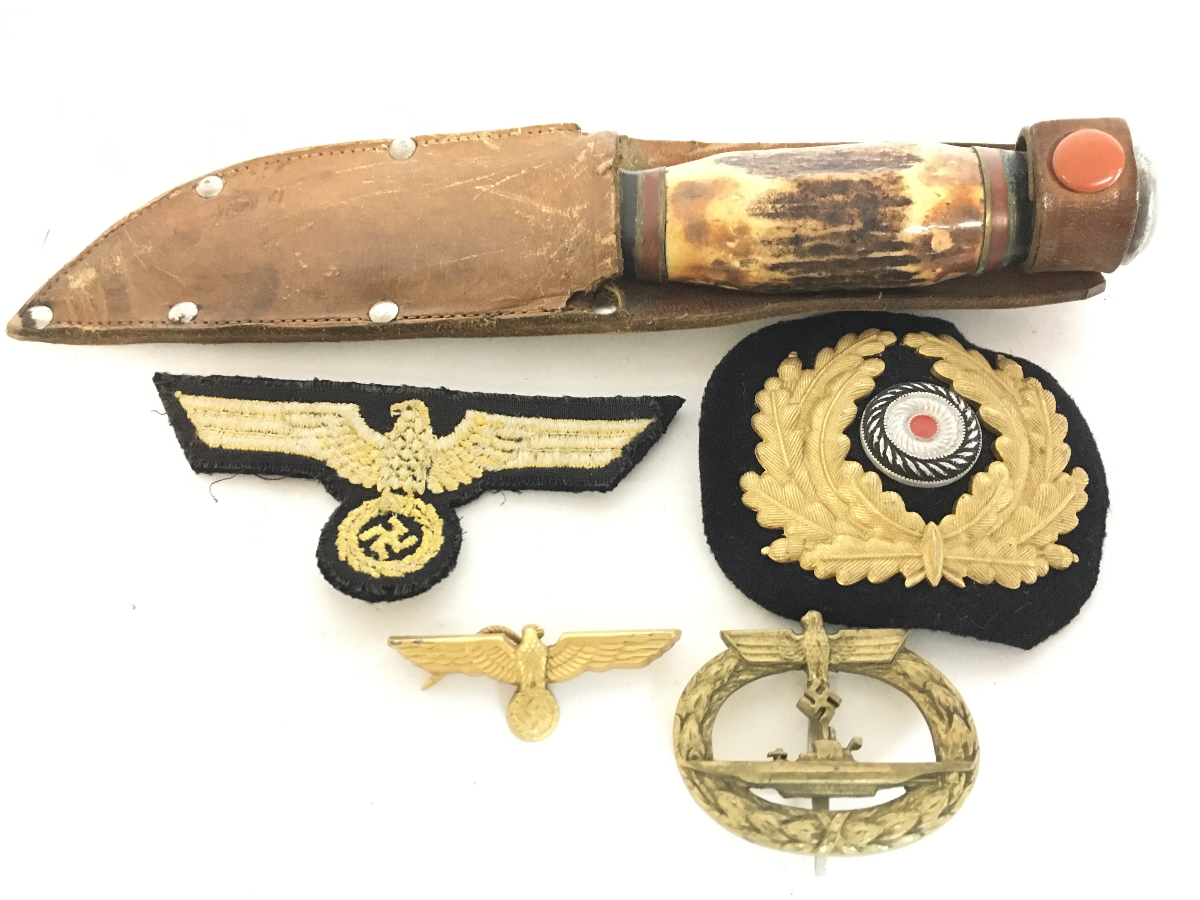 WW2 Nazi Germany badges including a Kriegsmarine cap badge, U boat badge and a Taylors Eye Witness Scout knife. This lot cannot be posted