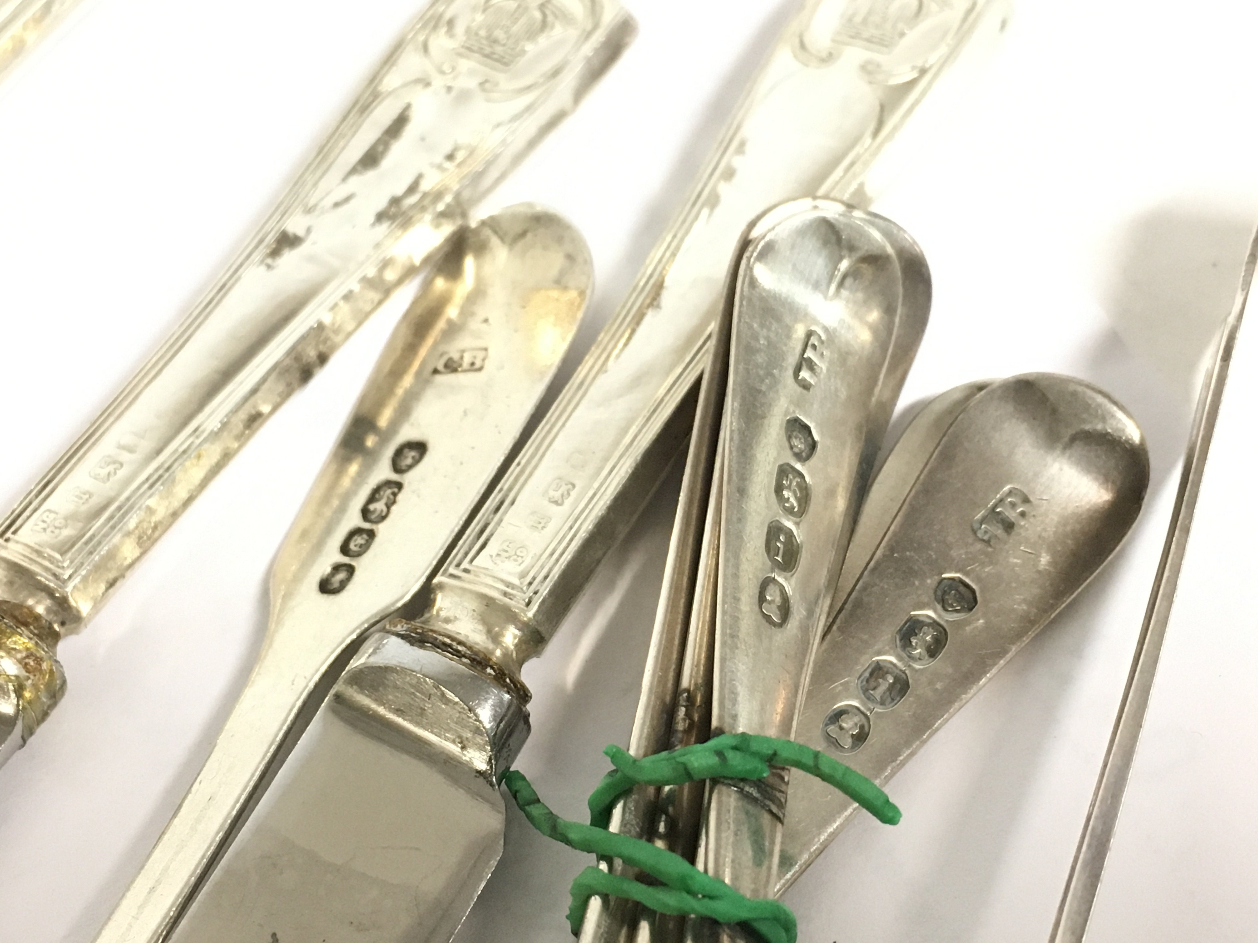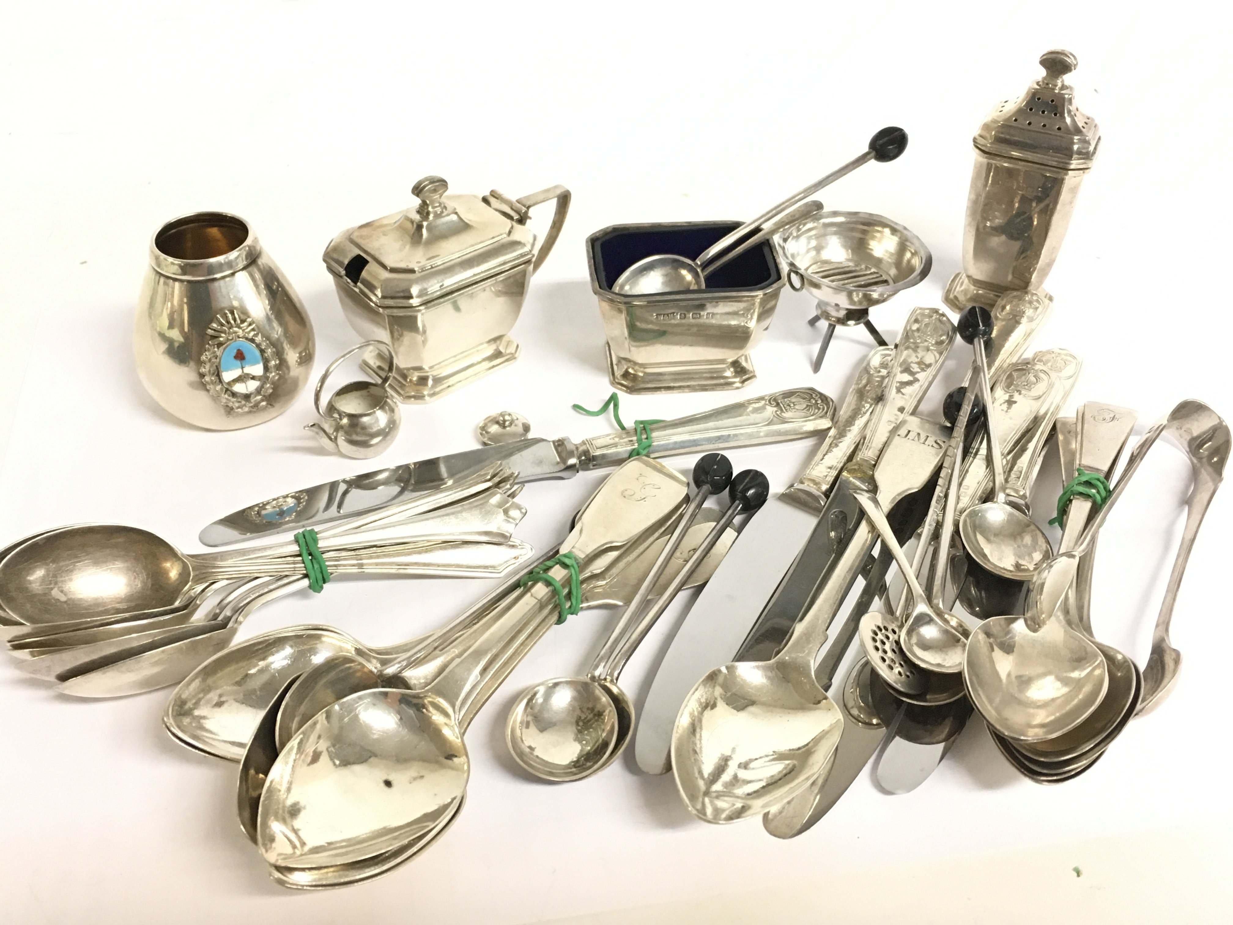 A collection of silver hallmarked items including spoons, knives, cruet set. Postage category B