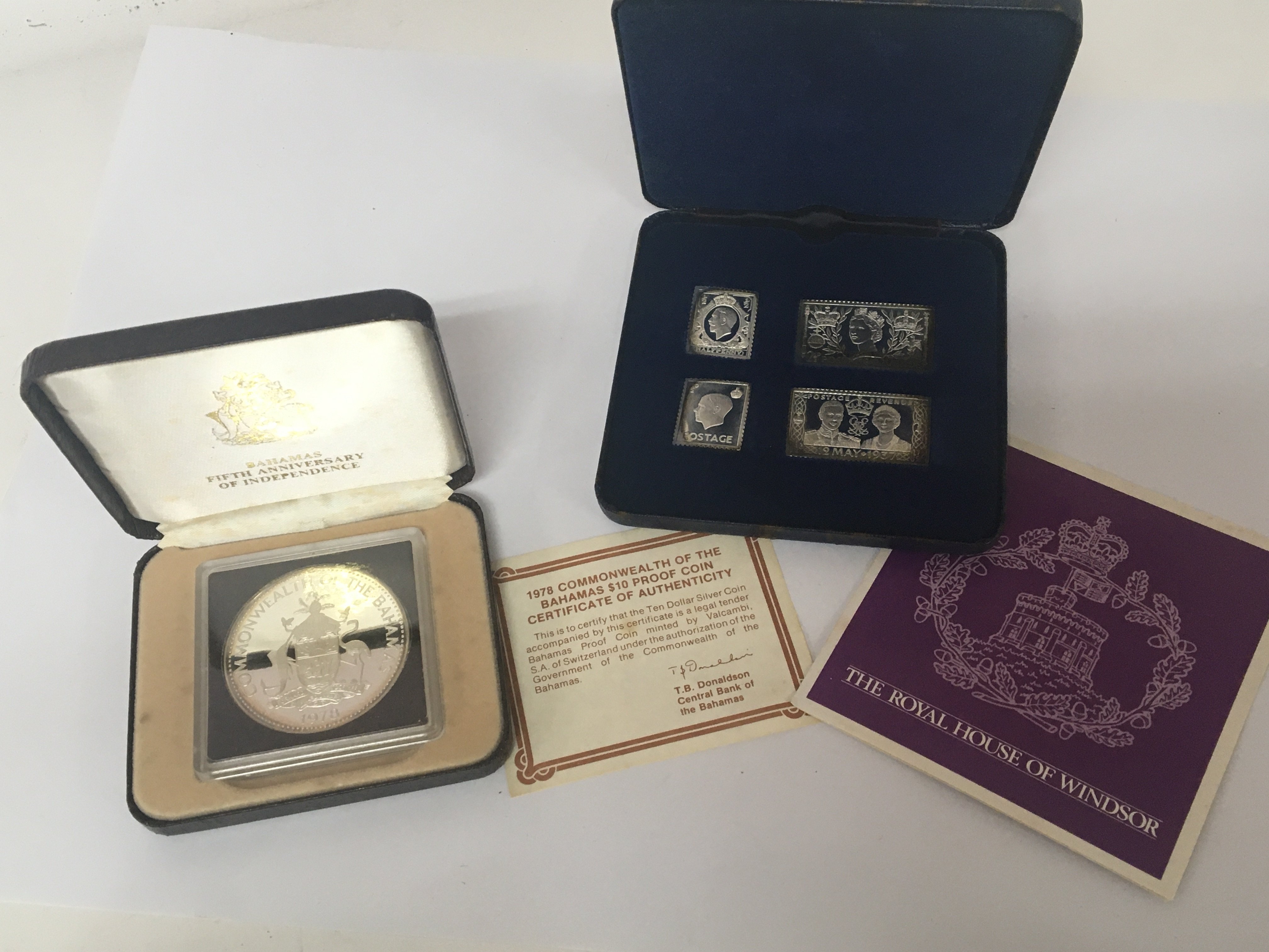 A cased Silver Ten dollar Bahamas 1978 coin and a cased set of four silver stamps (2)