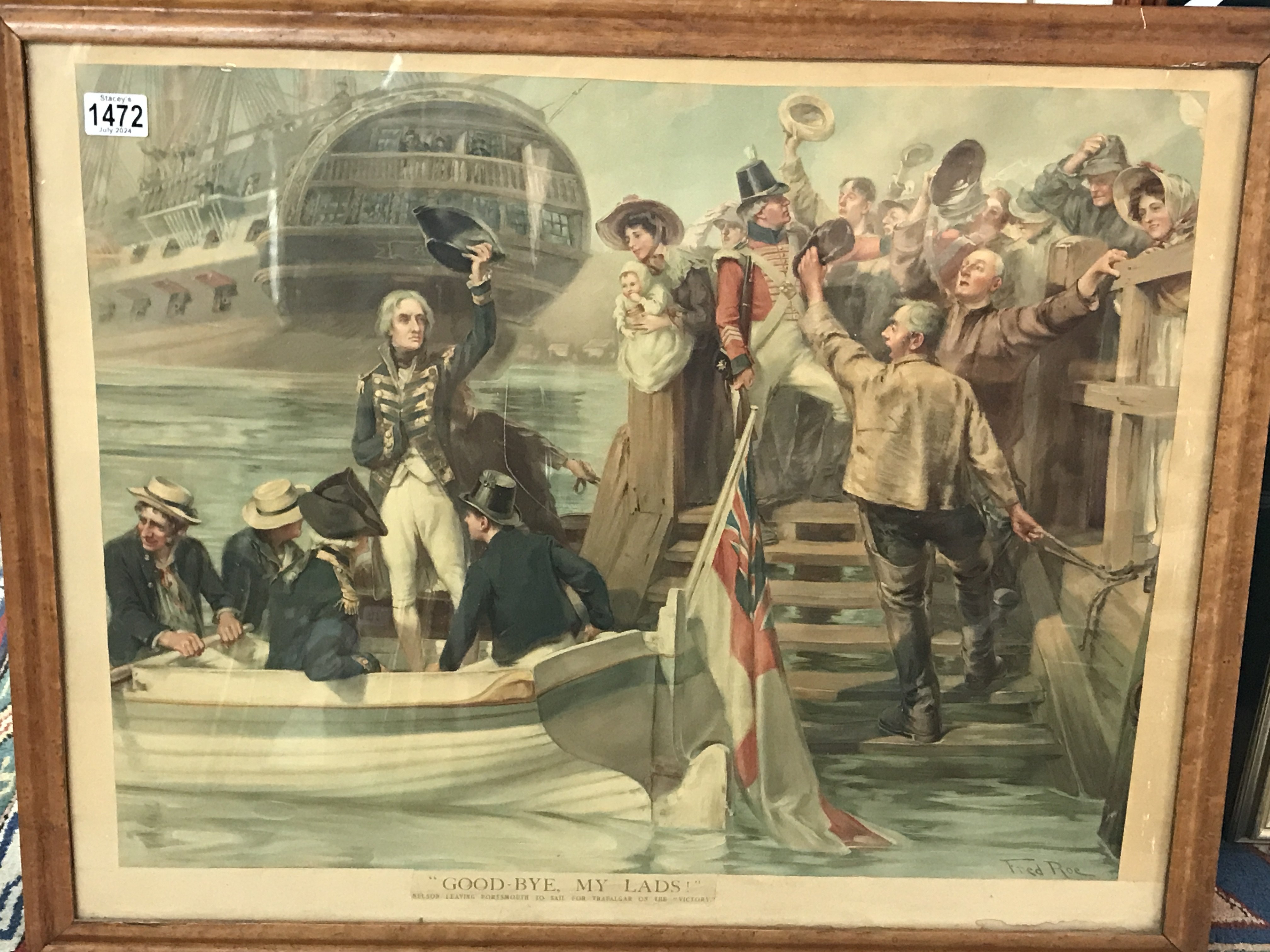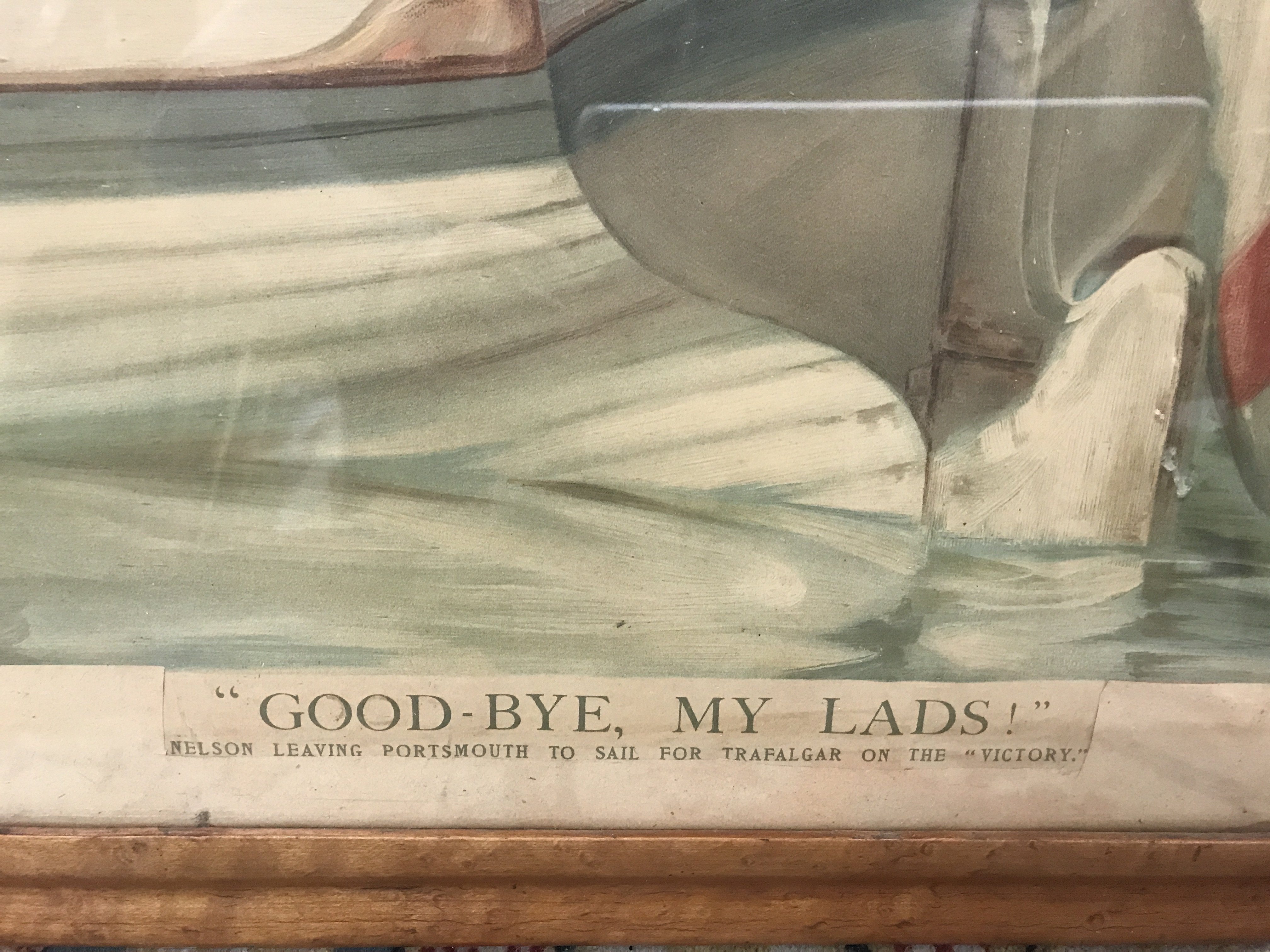A framed print depicting Nelson " Goodbye My Lads" Nelson leaving Portsmouth to sail for Trafalgar on the Victory
