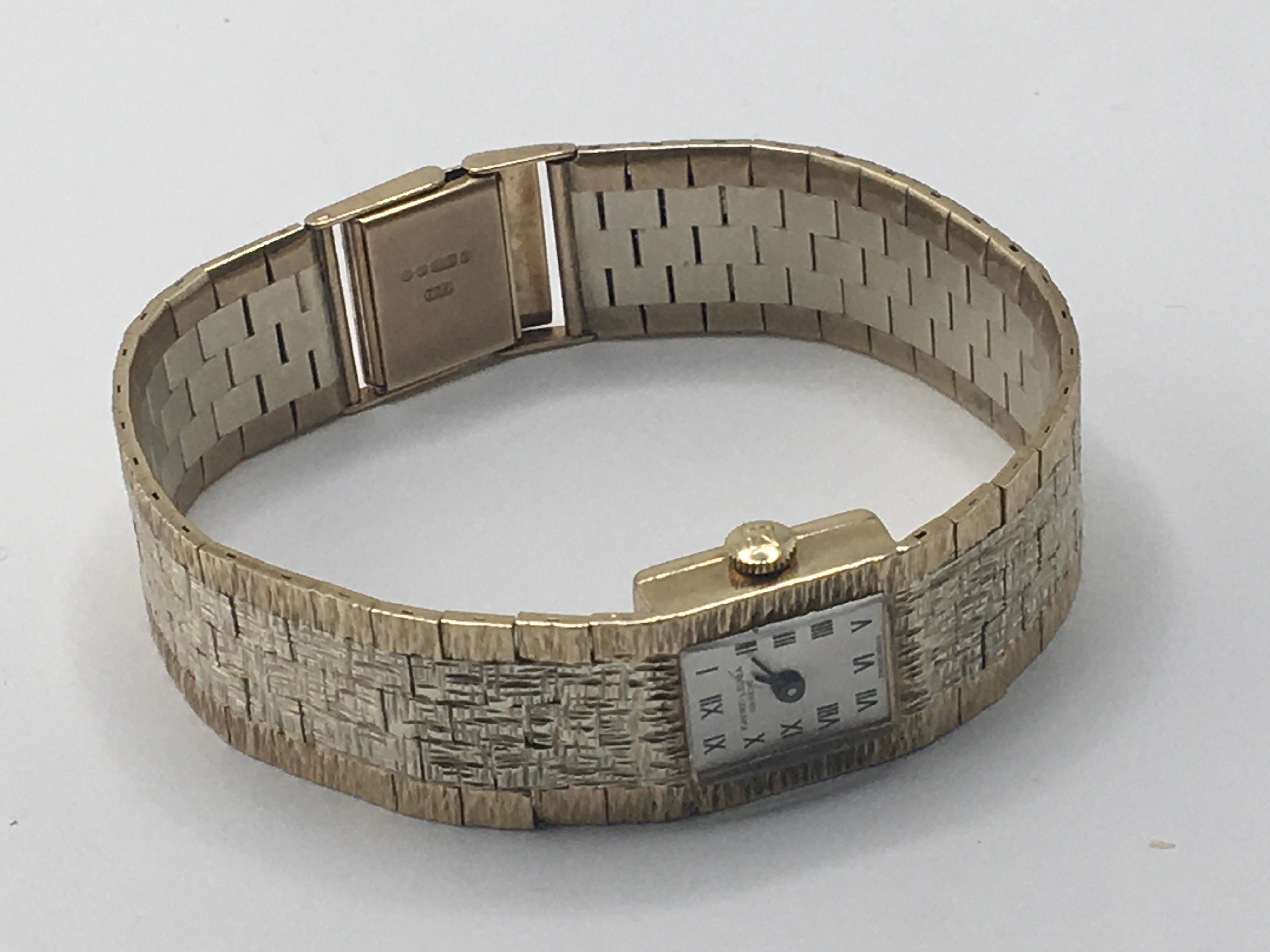 A ladies 9carat gold two tone Favre-Leuba manual wind watch with a rectangular dial seen working in good condition. All in weight 37.5g