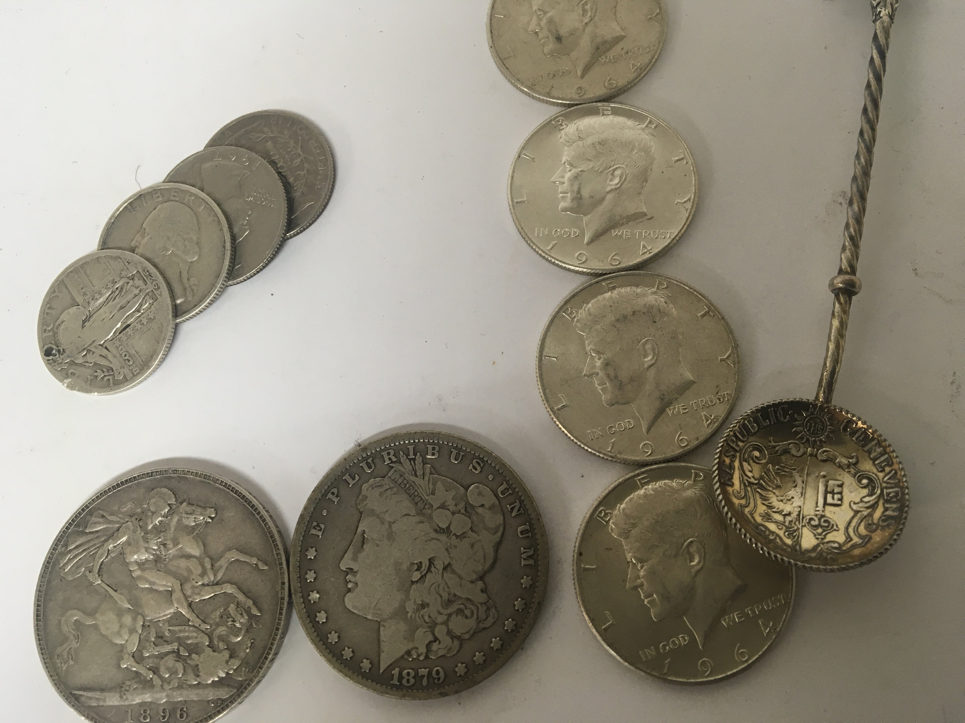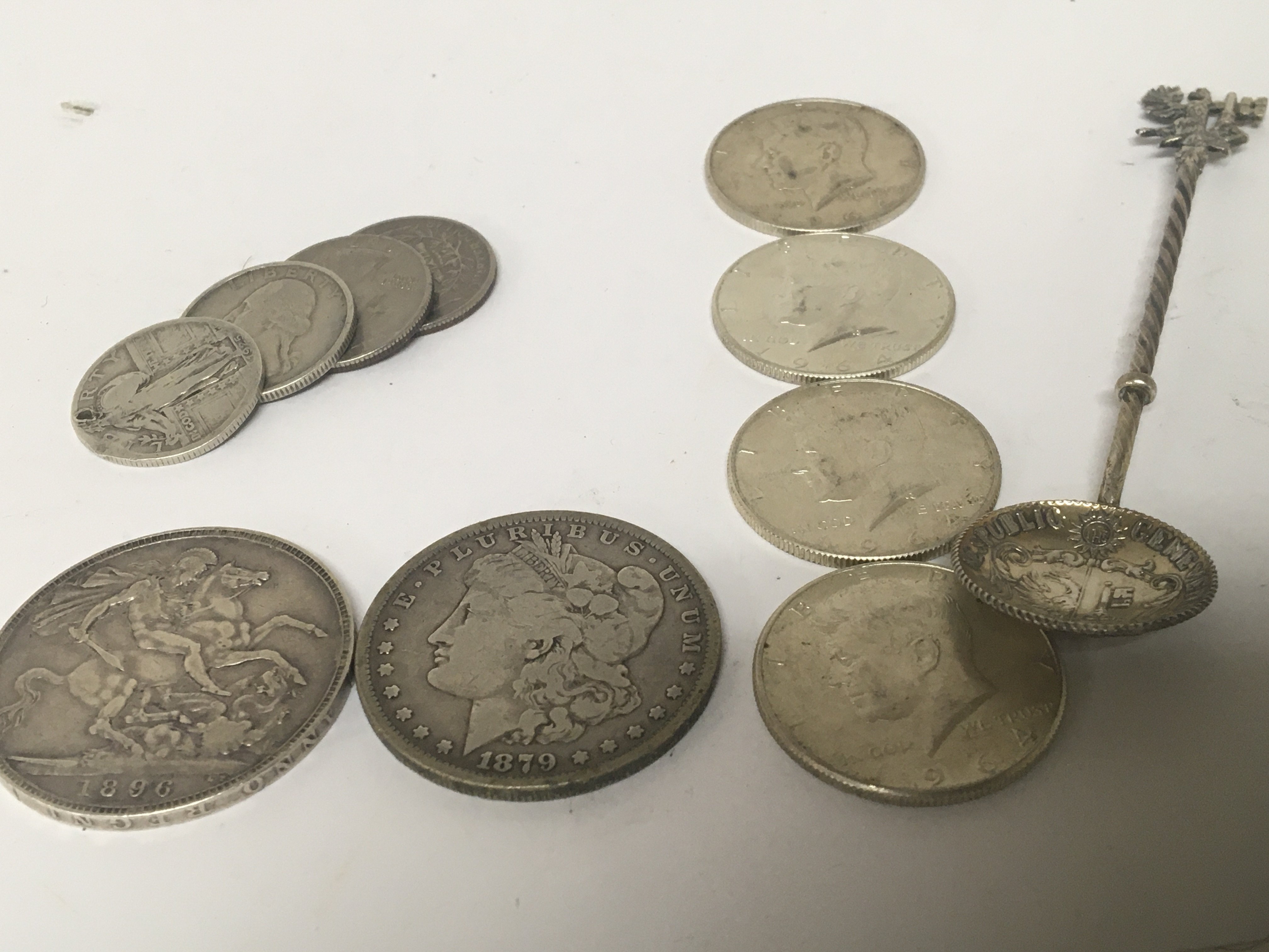 An 1879 American dollar An 1896 Victorian Crown four 1964 Kennedy half dollars other American coins and spoon.