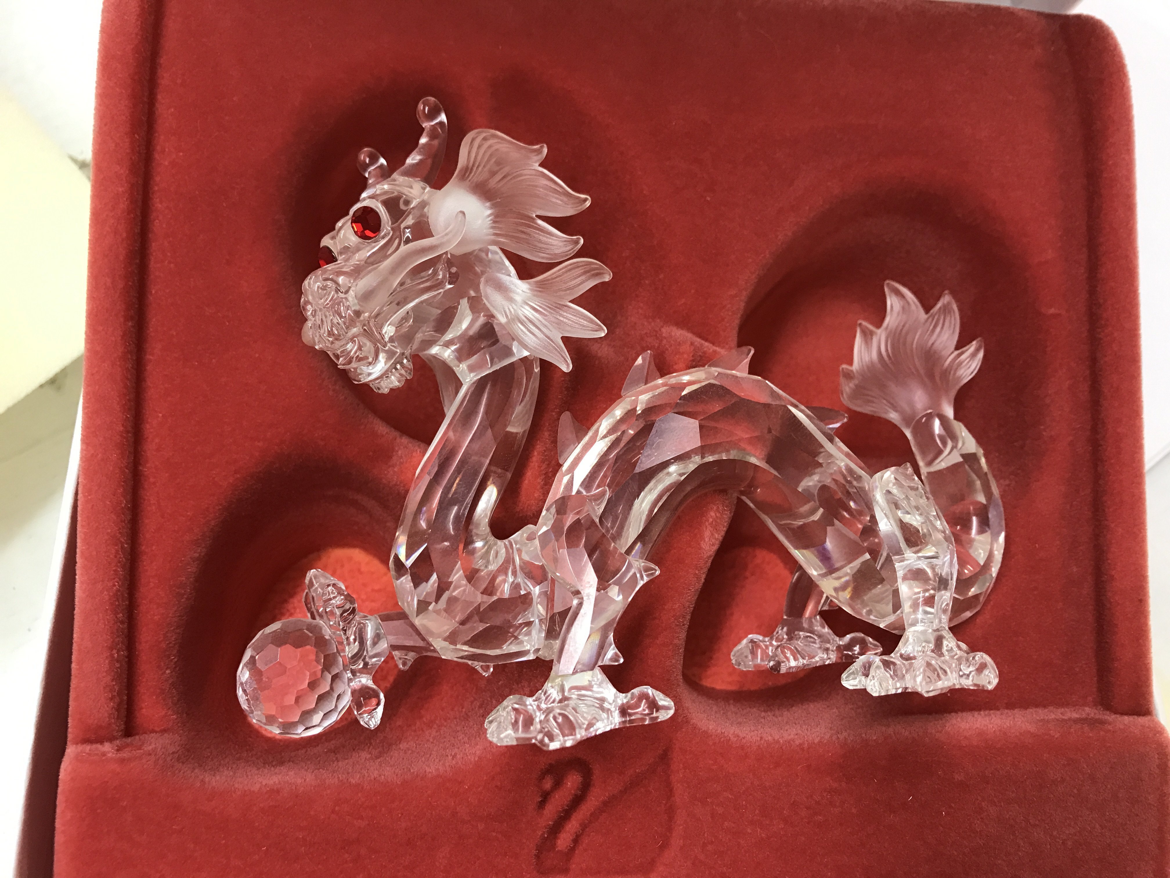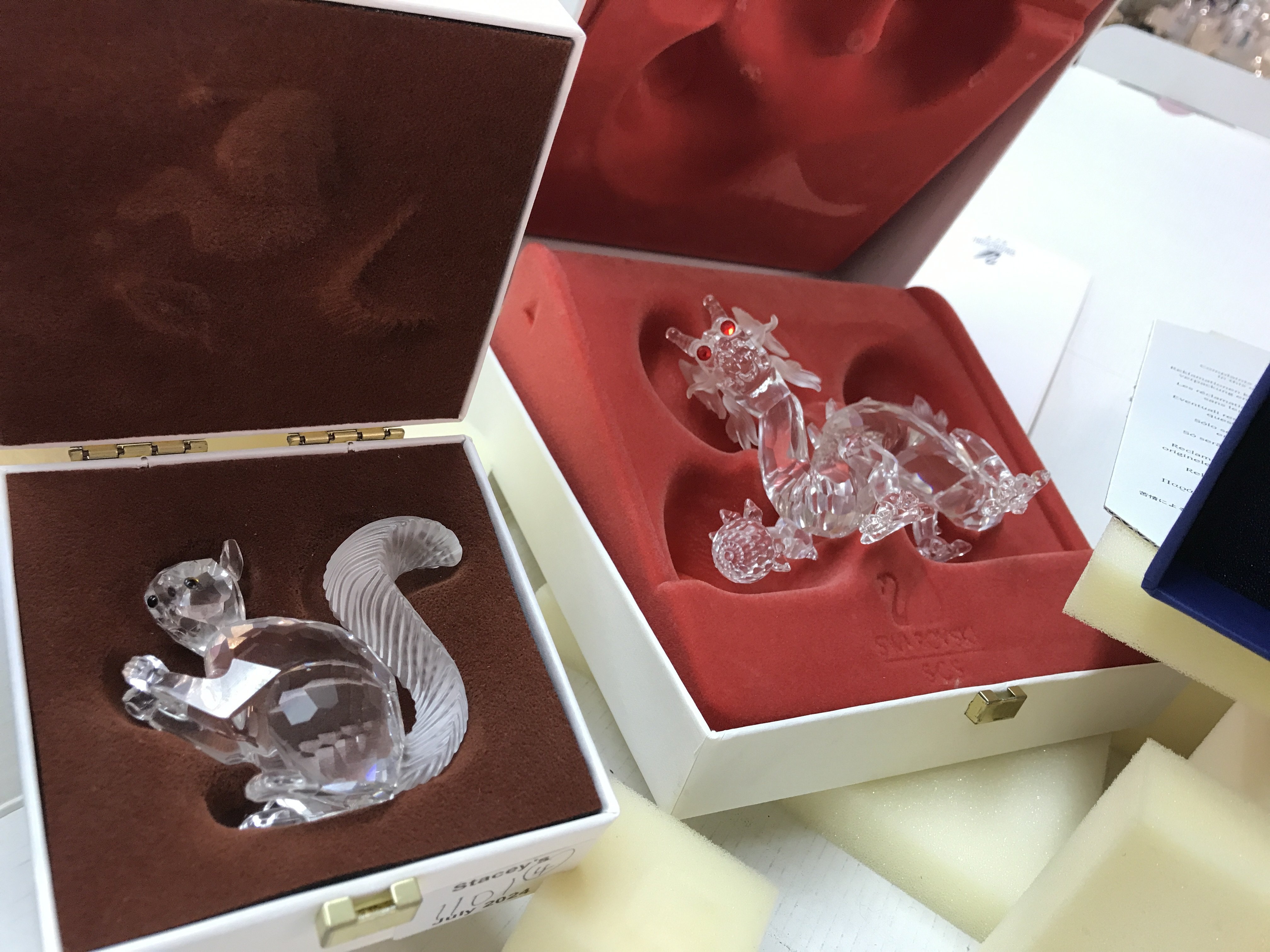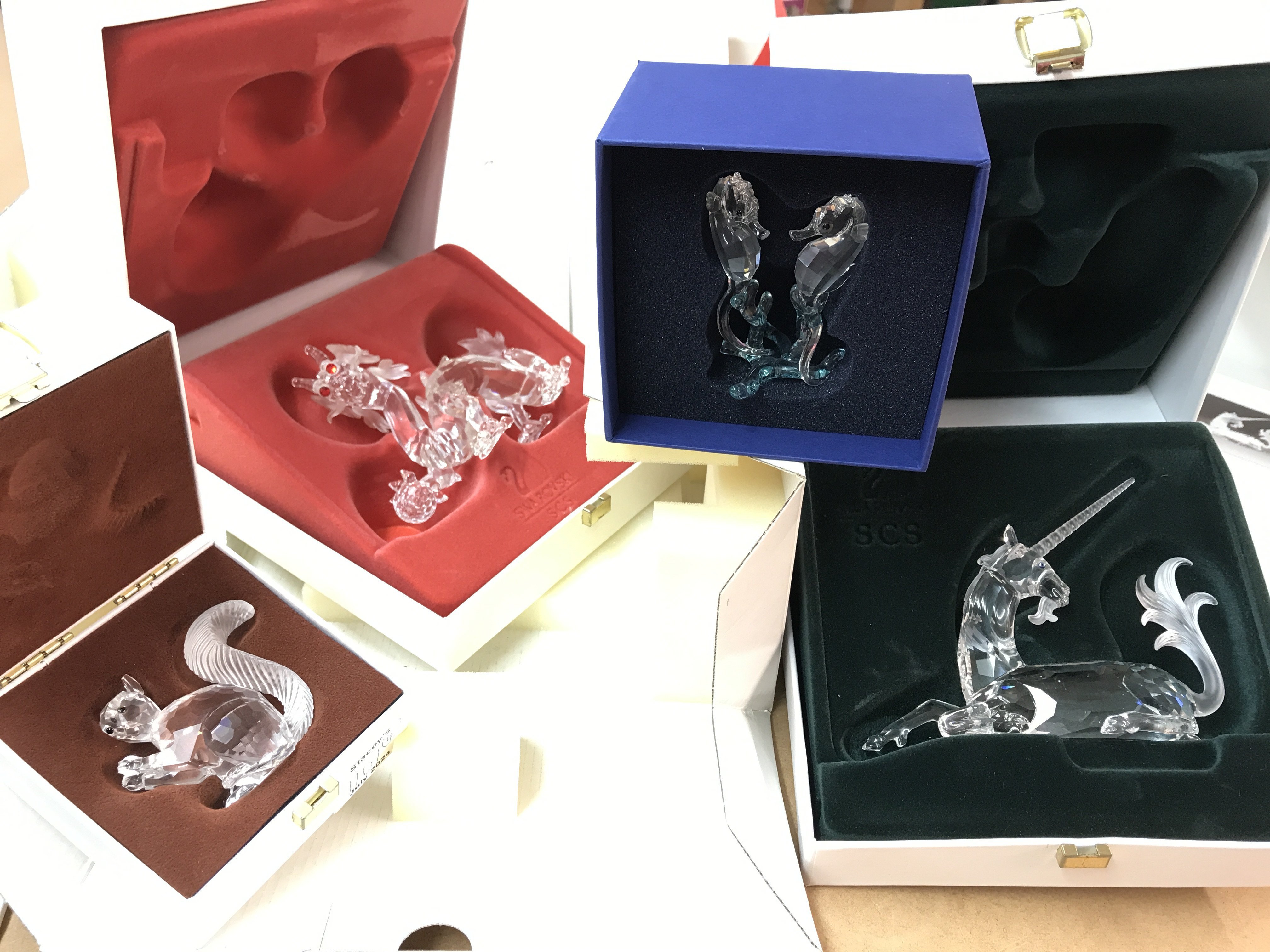 Four boxed Swarovski figures including Pearl Dragon, Unicorn, large squirrel and seahorses