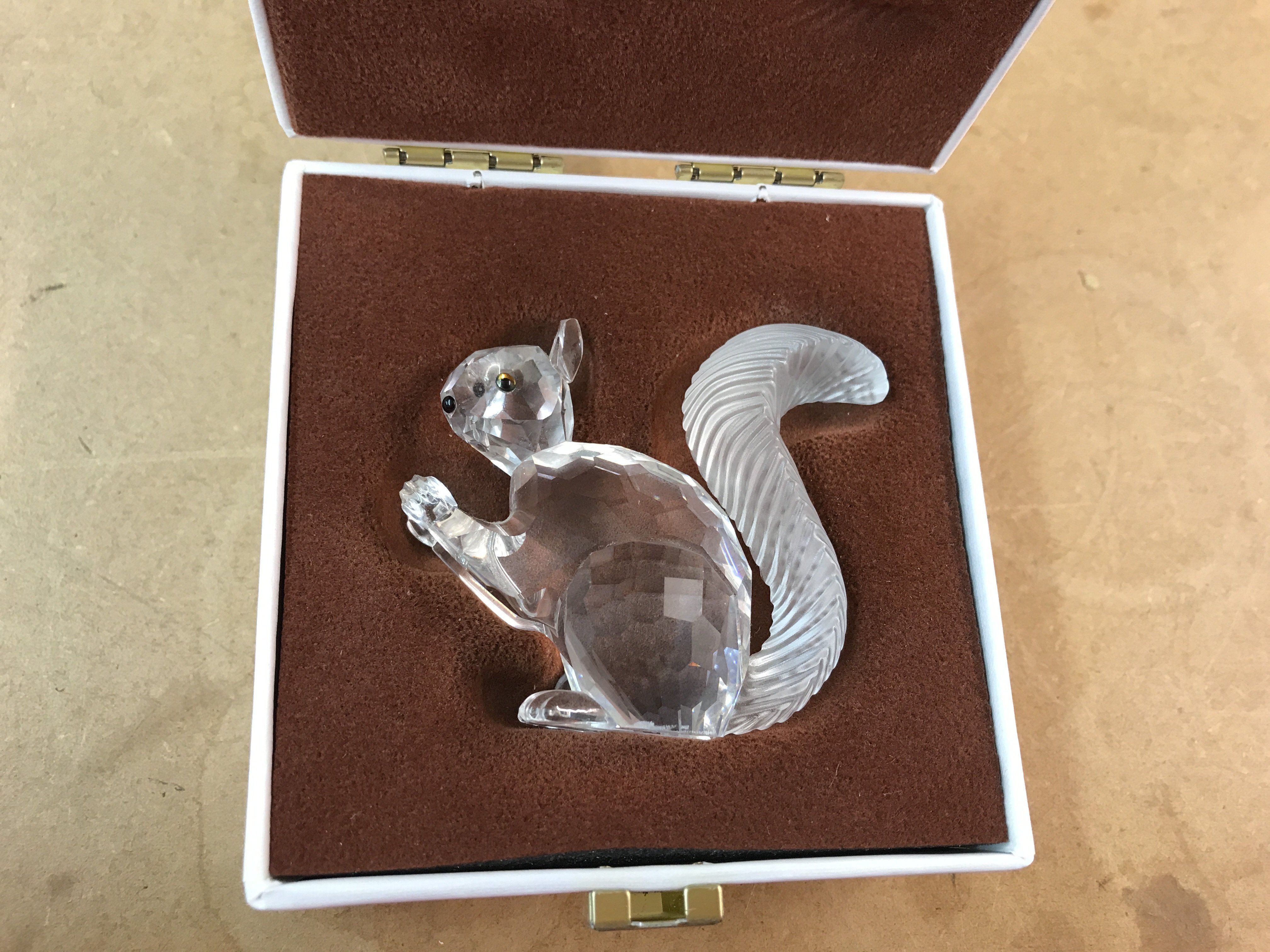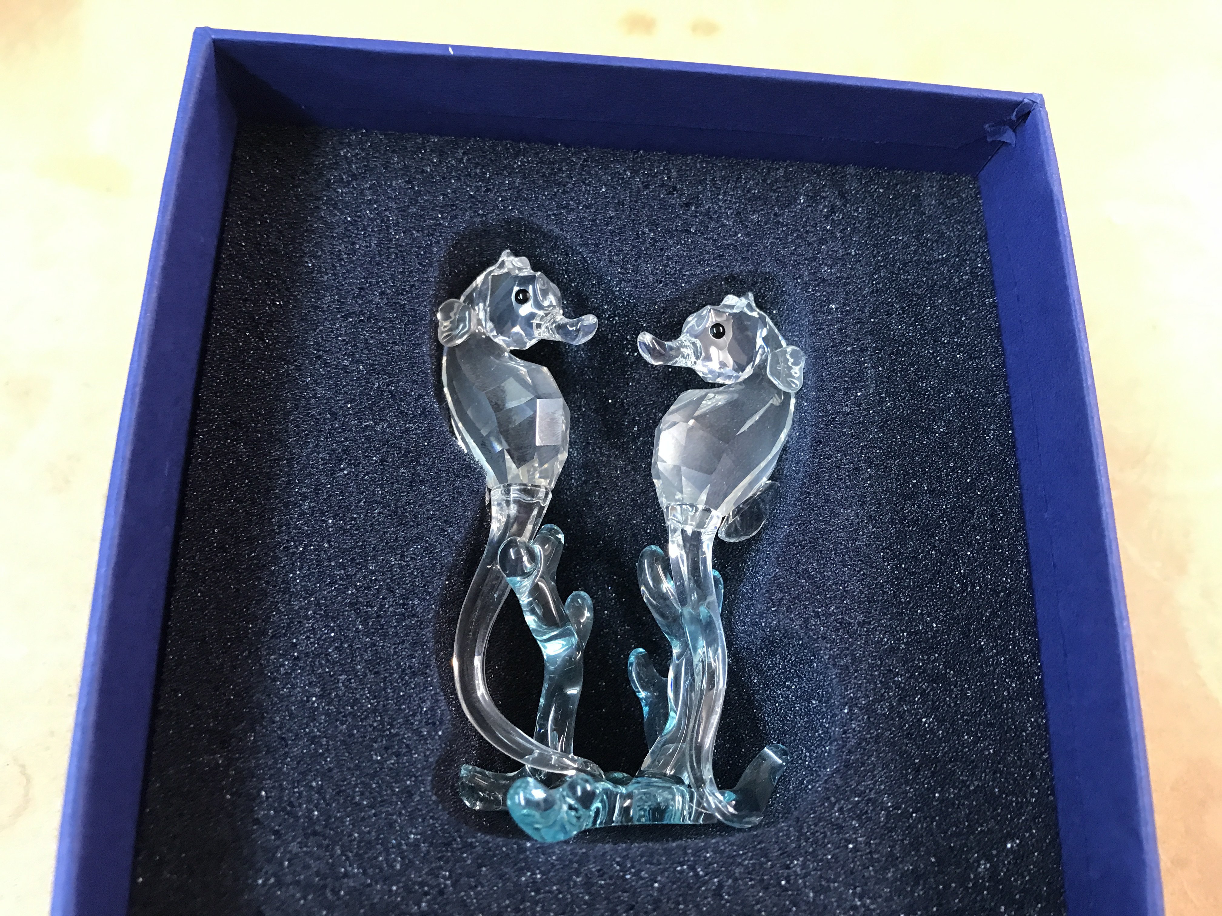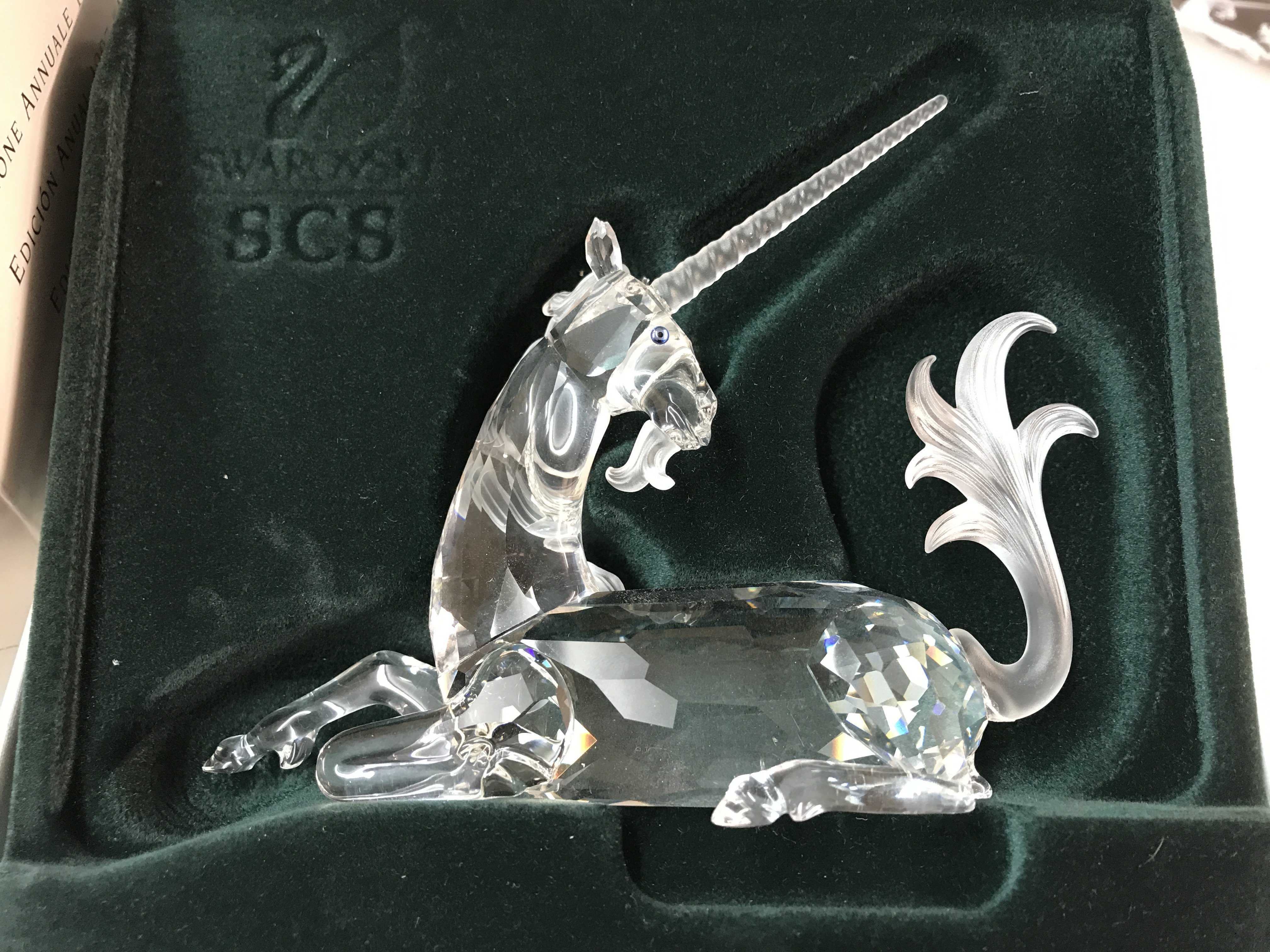 Four boxed Swarovski figures including Pearl Dragon, Unicorn, large squirrel and seahorses