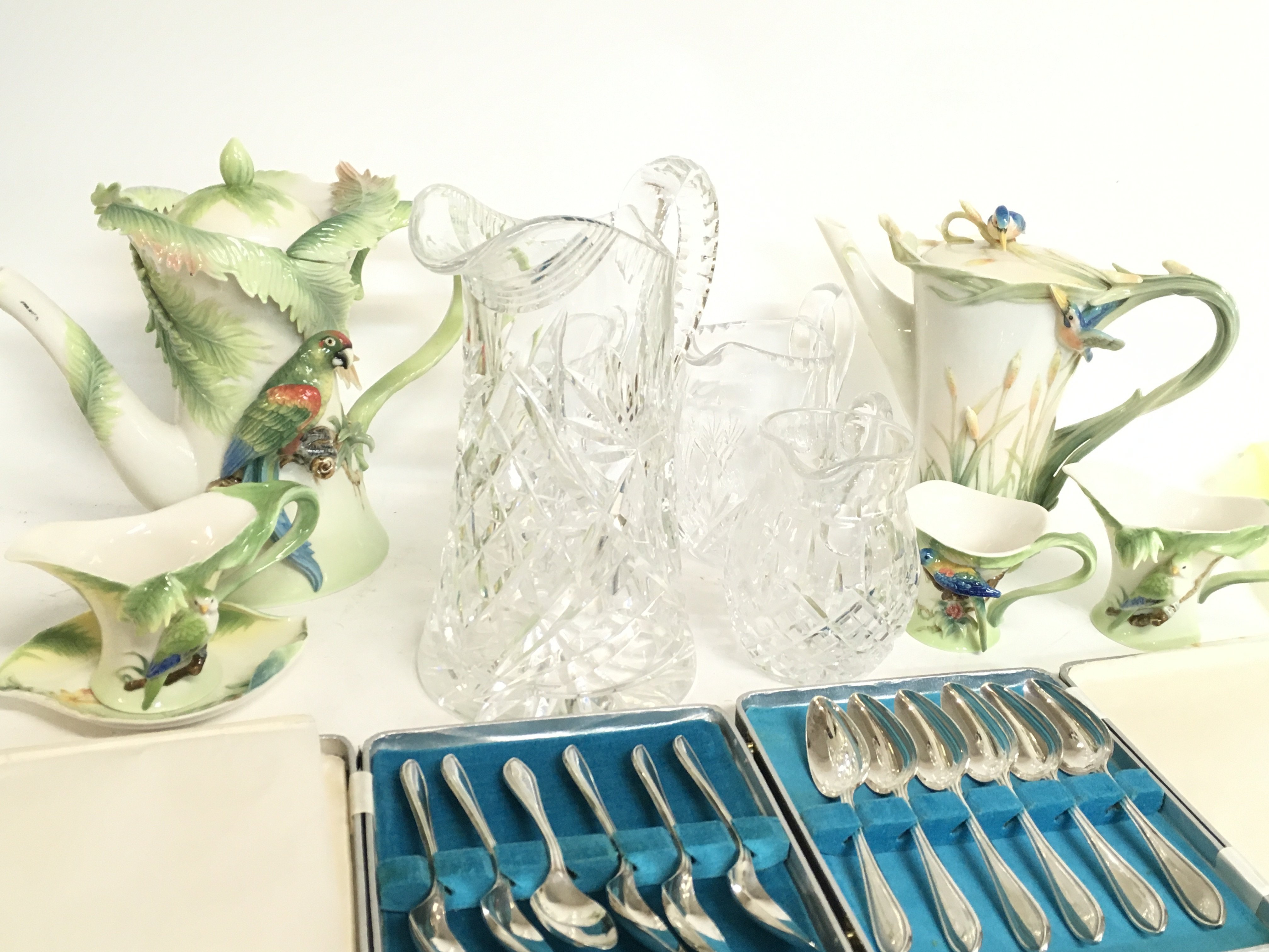 A collection of Franz porcelain jugs and cups, cut glass jugs, silver plated cutlery etc.