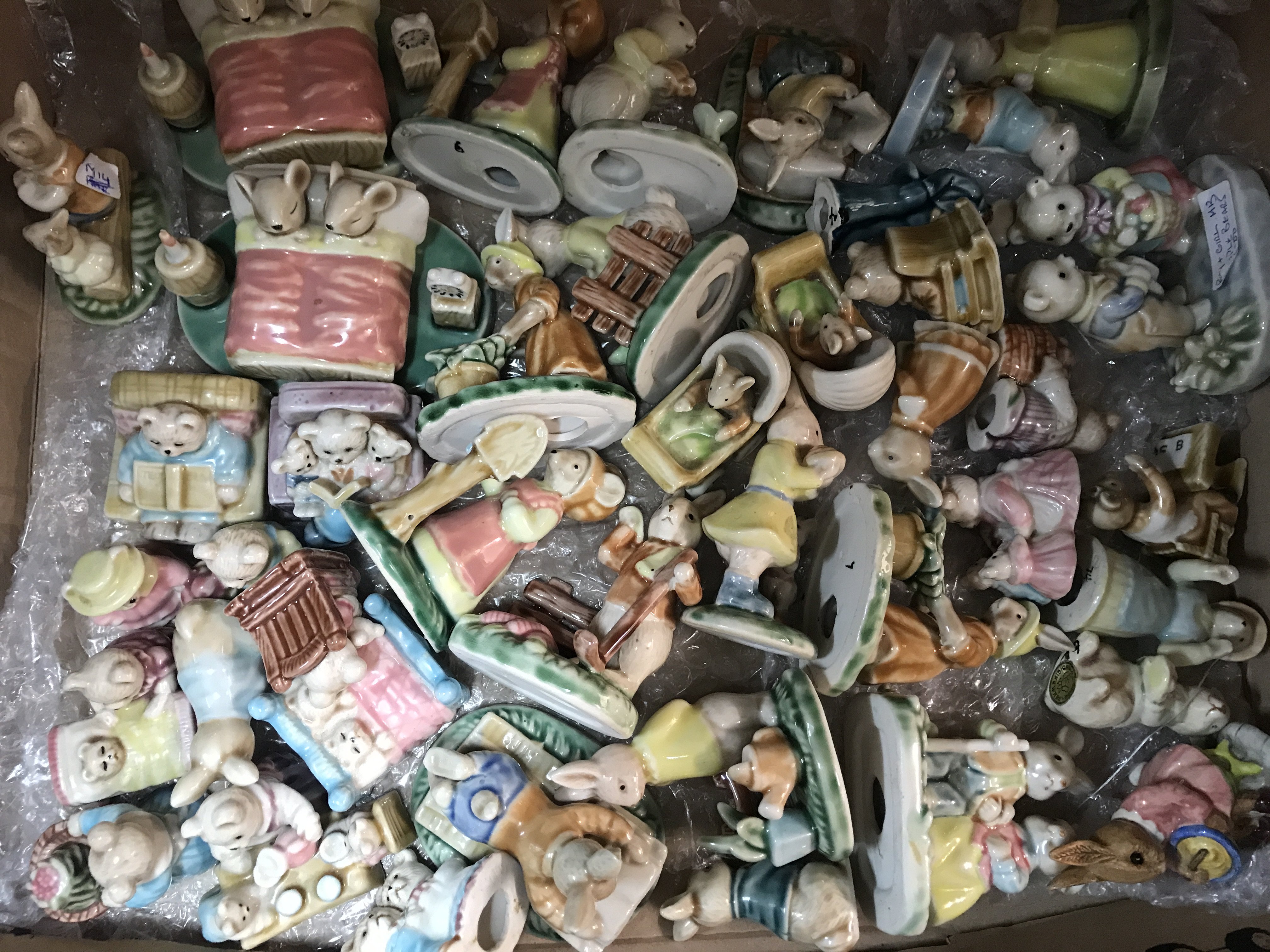 A box containing various ceramic bears and rabbits figure groups