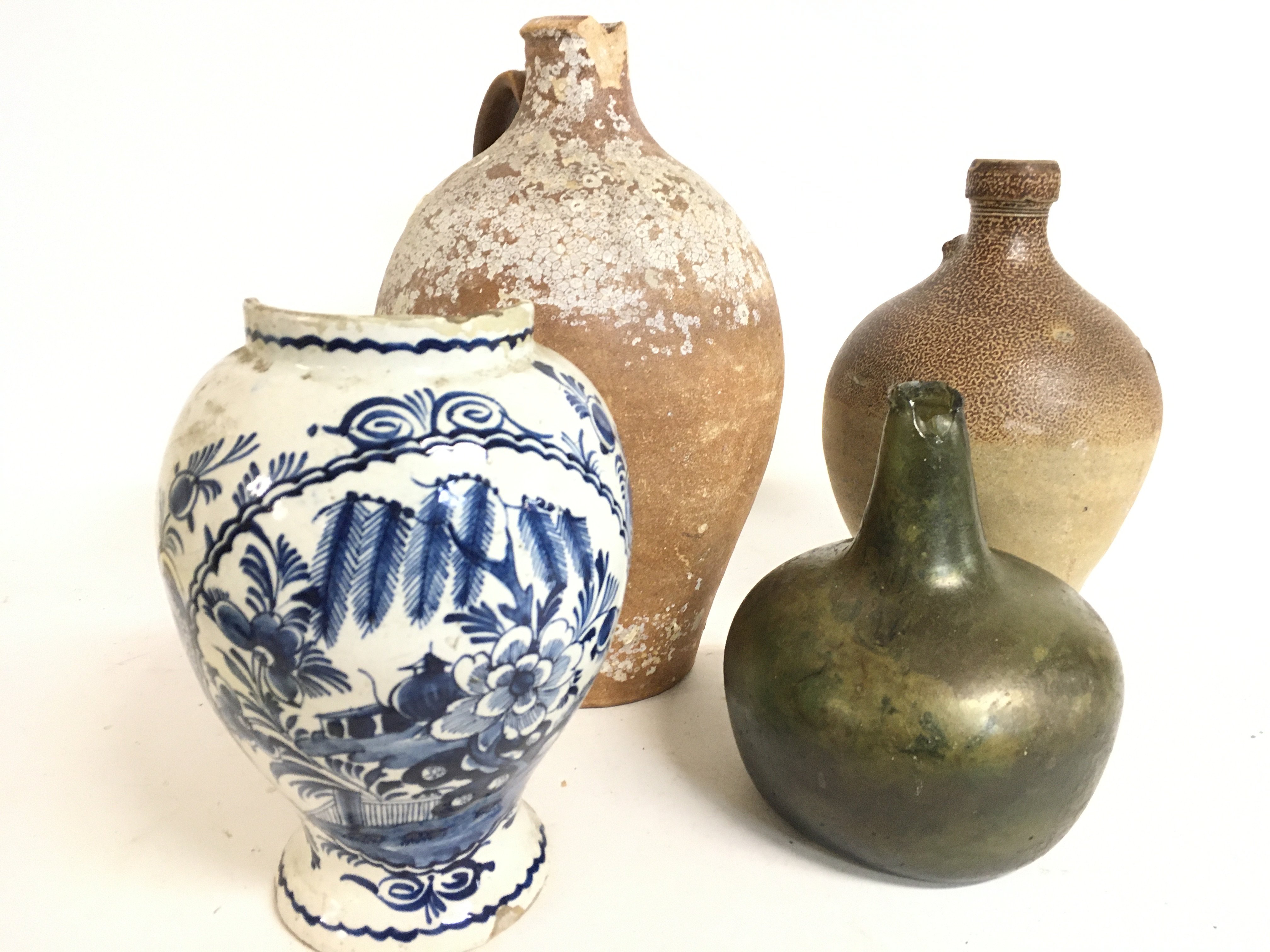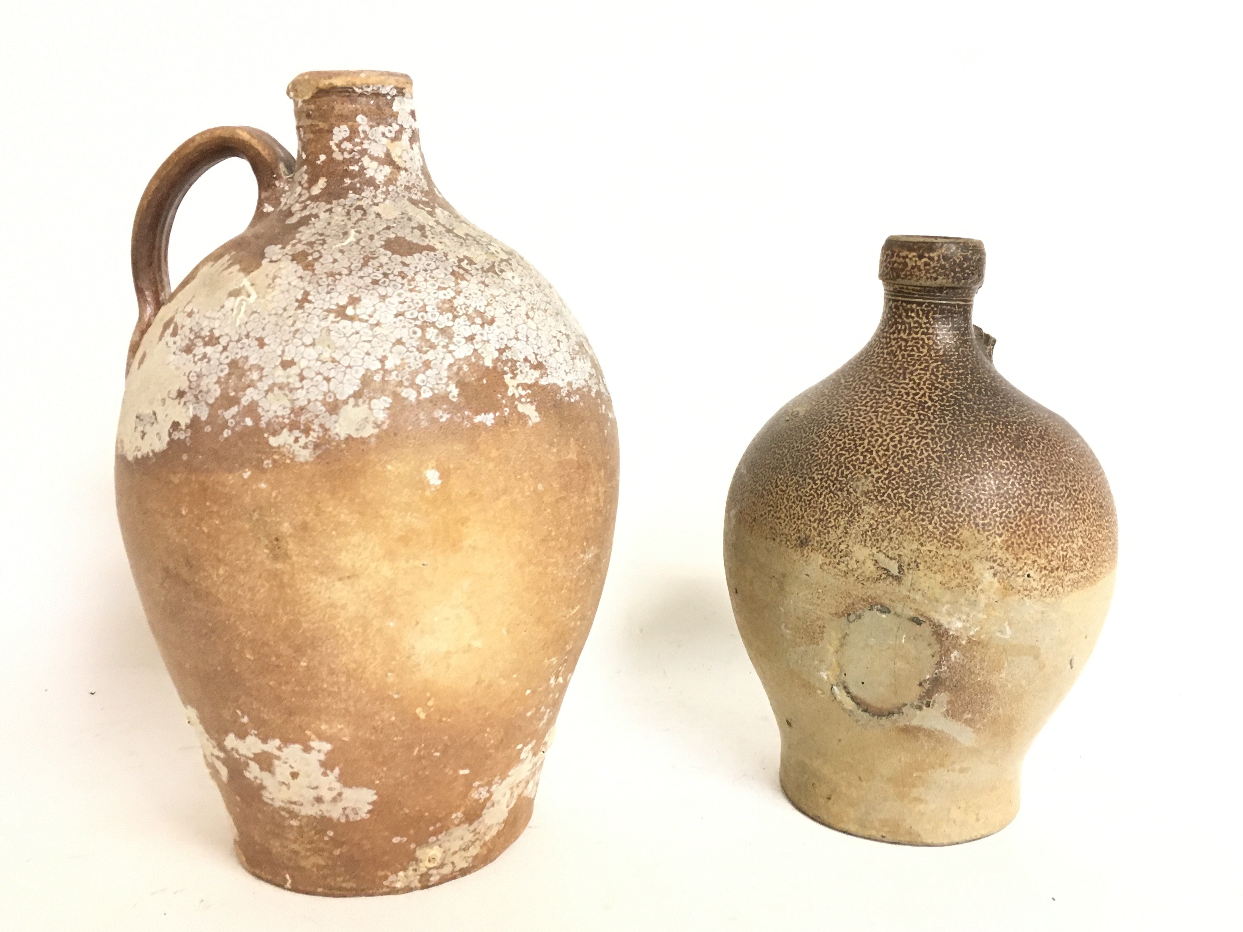 Antique stoneware jugs, bronze and metal figures, vintage compass collection, Coins and notes collection.