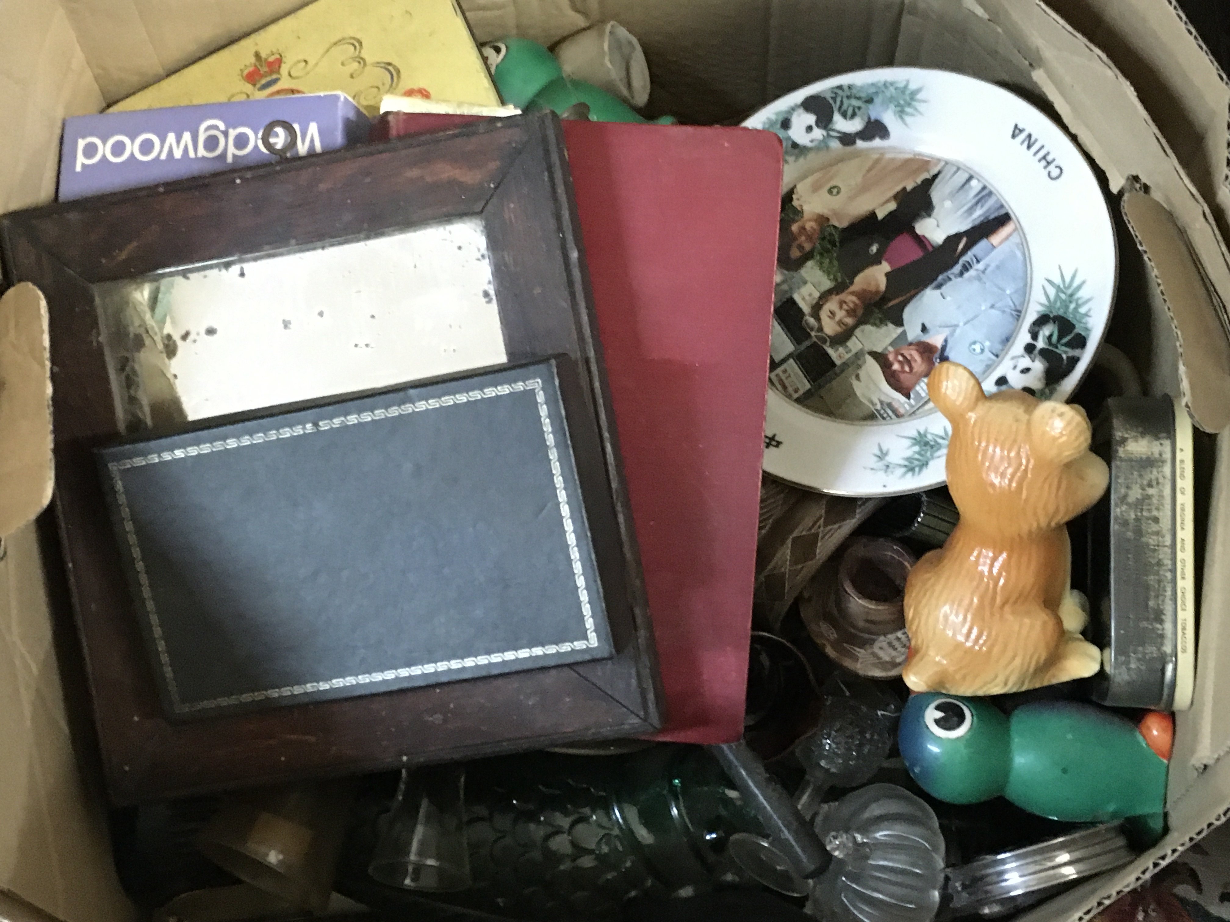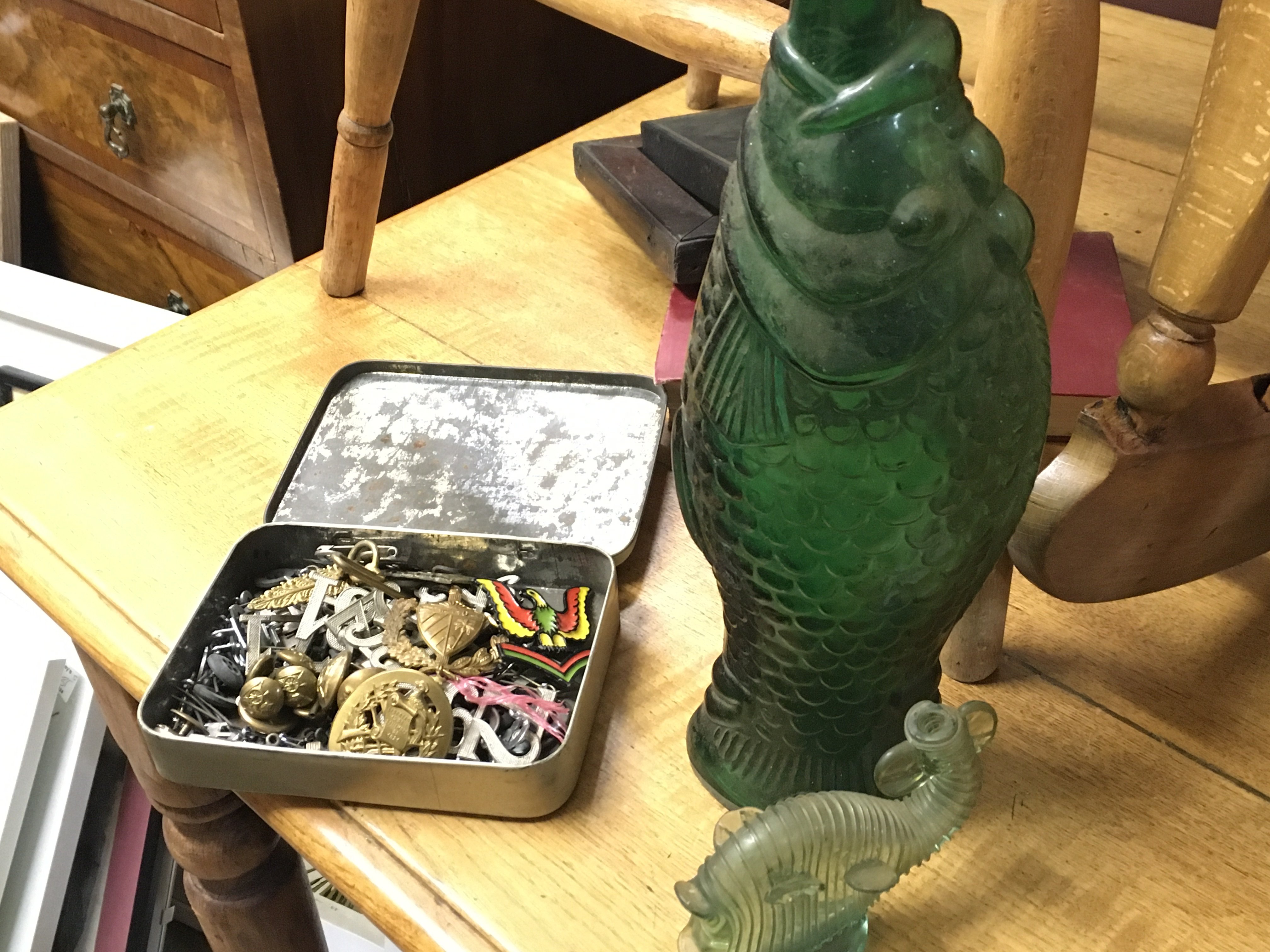 A collection of assorted items including cap badges, antique green carp bottle etc