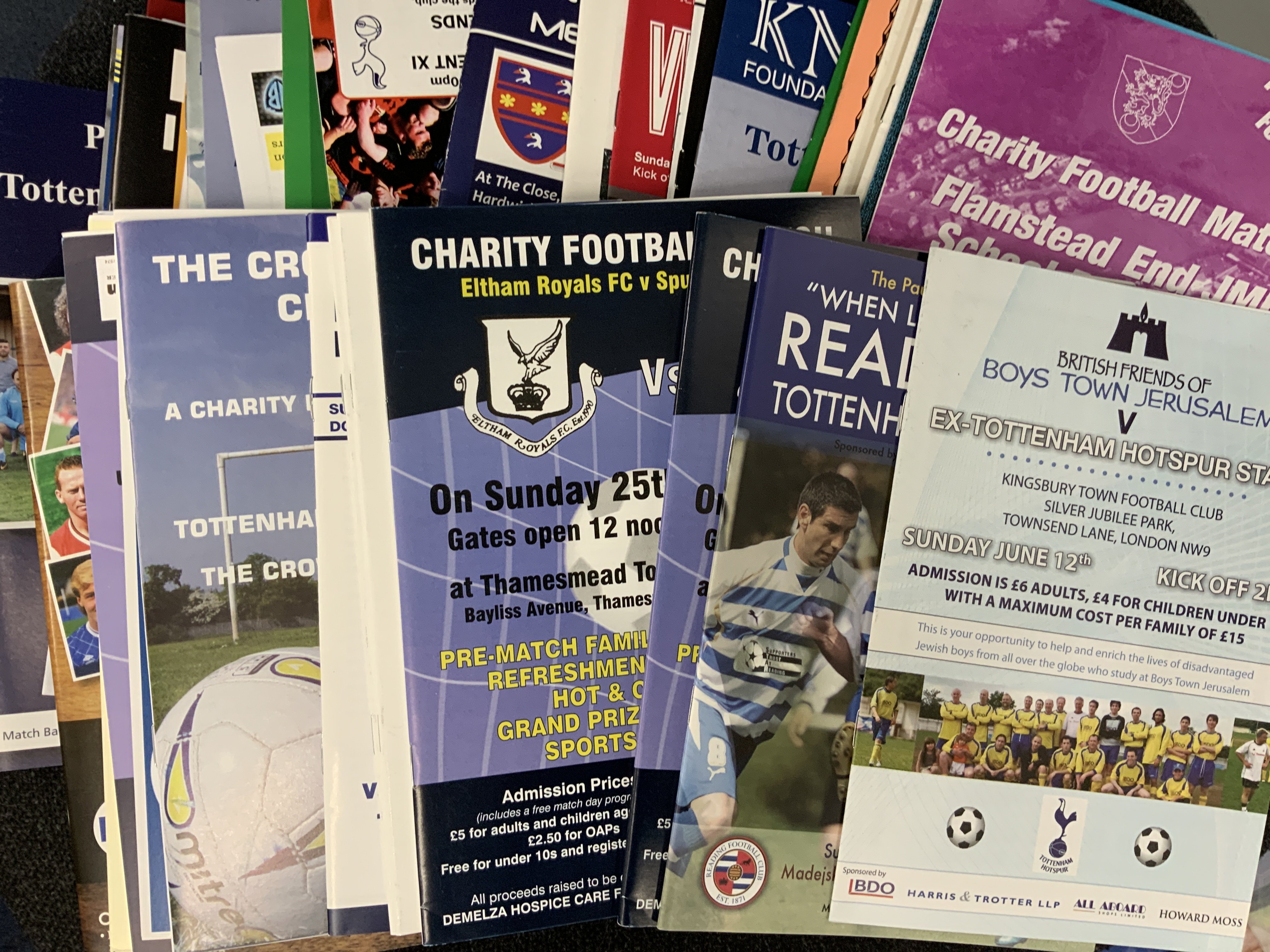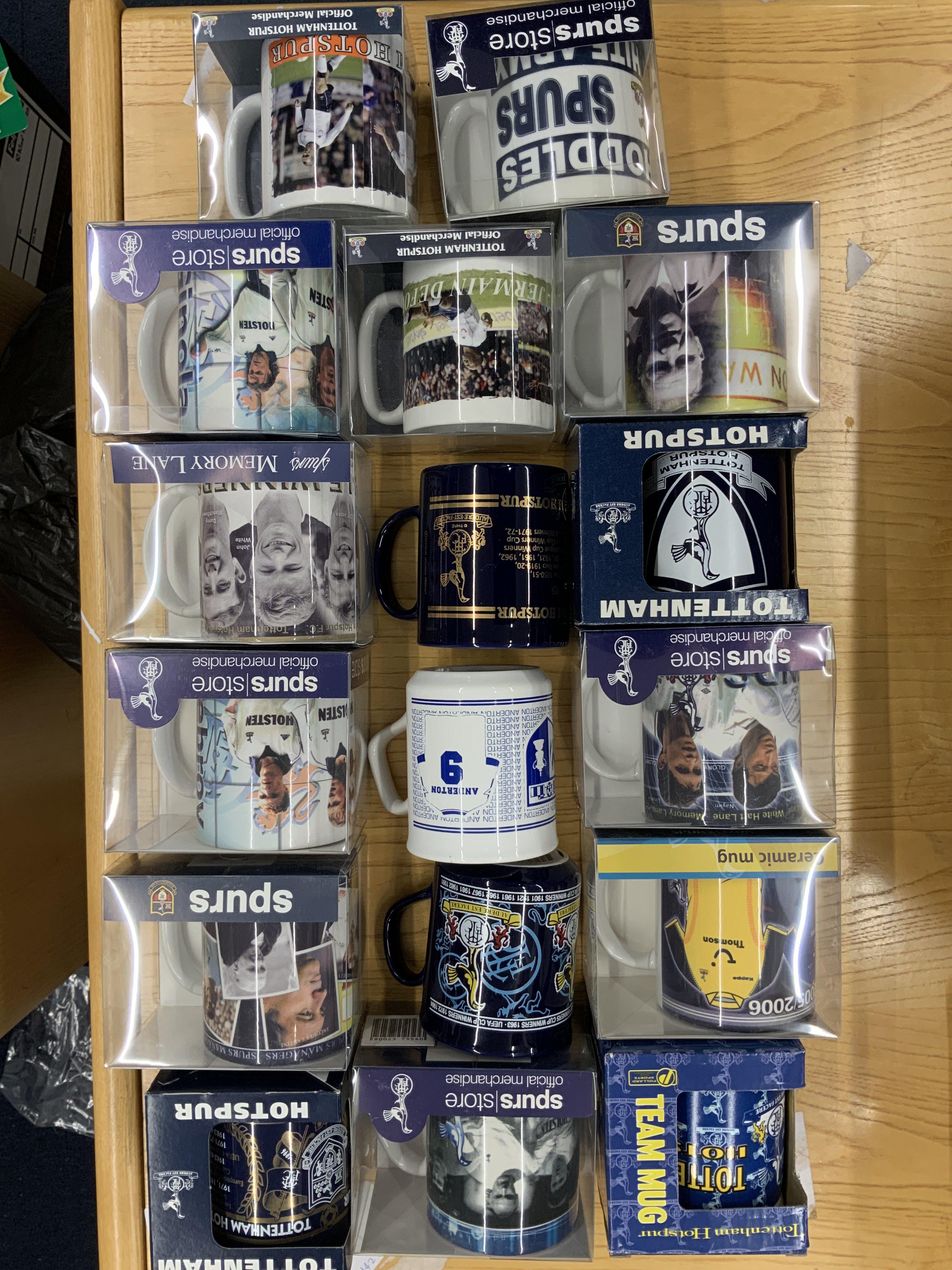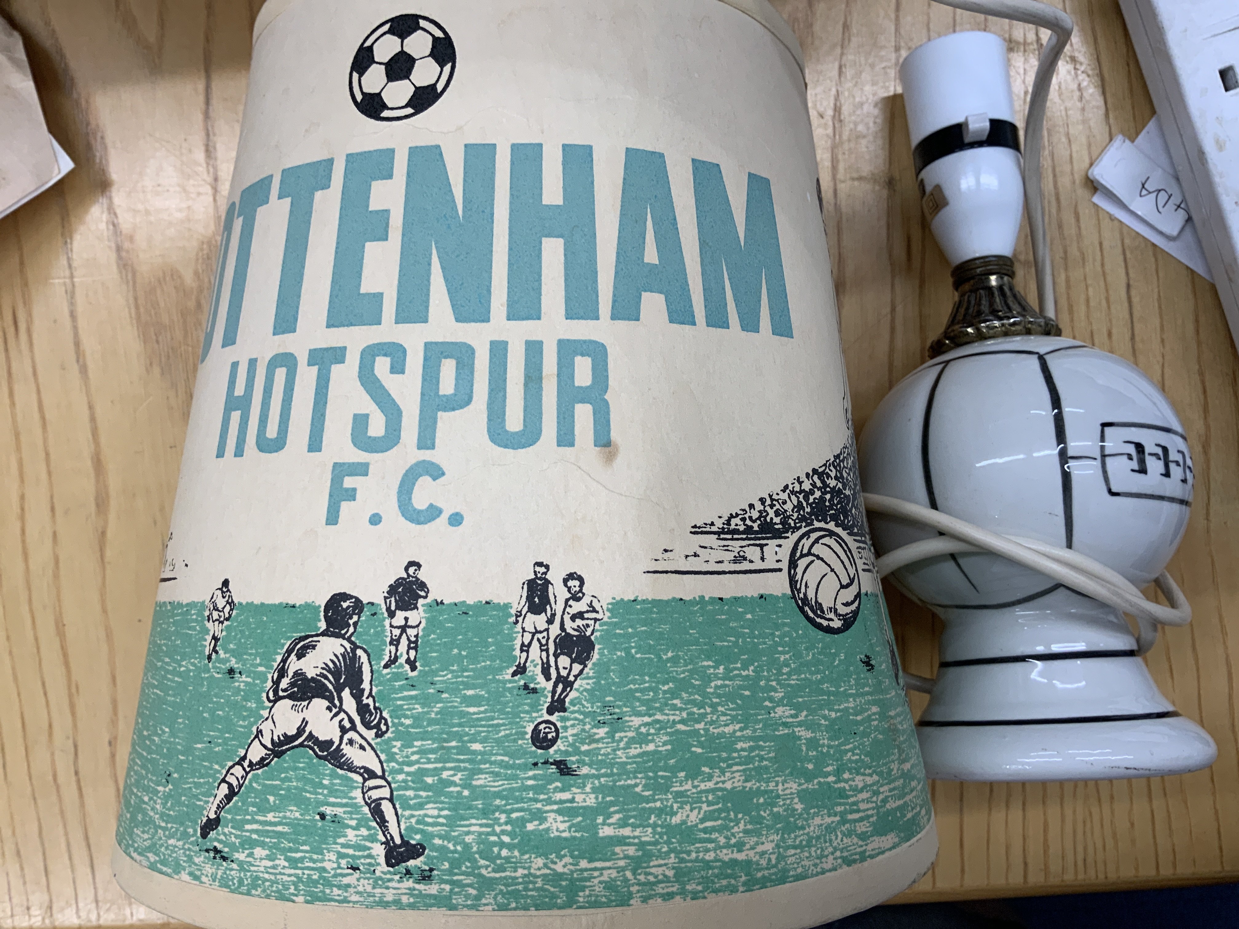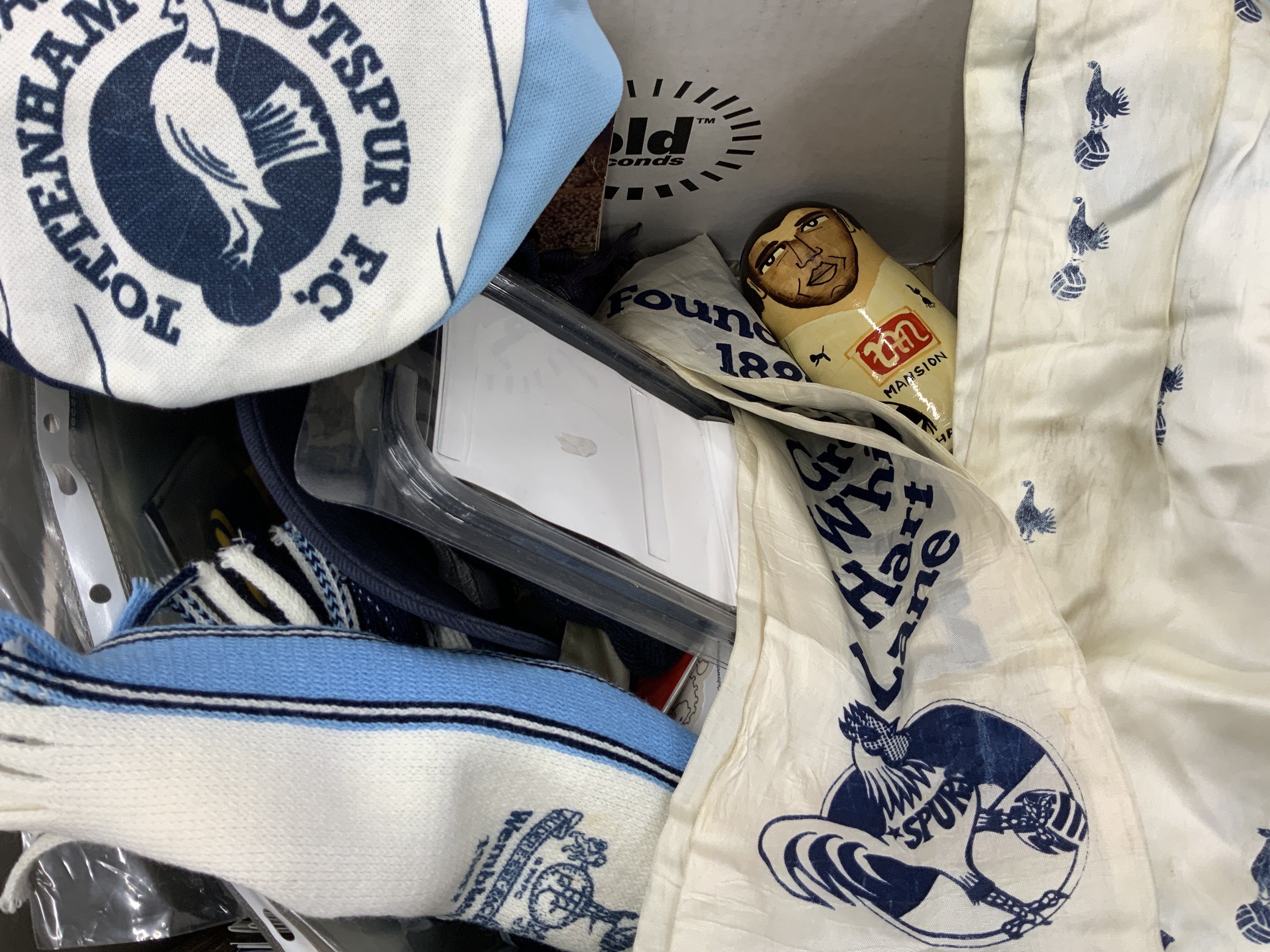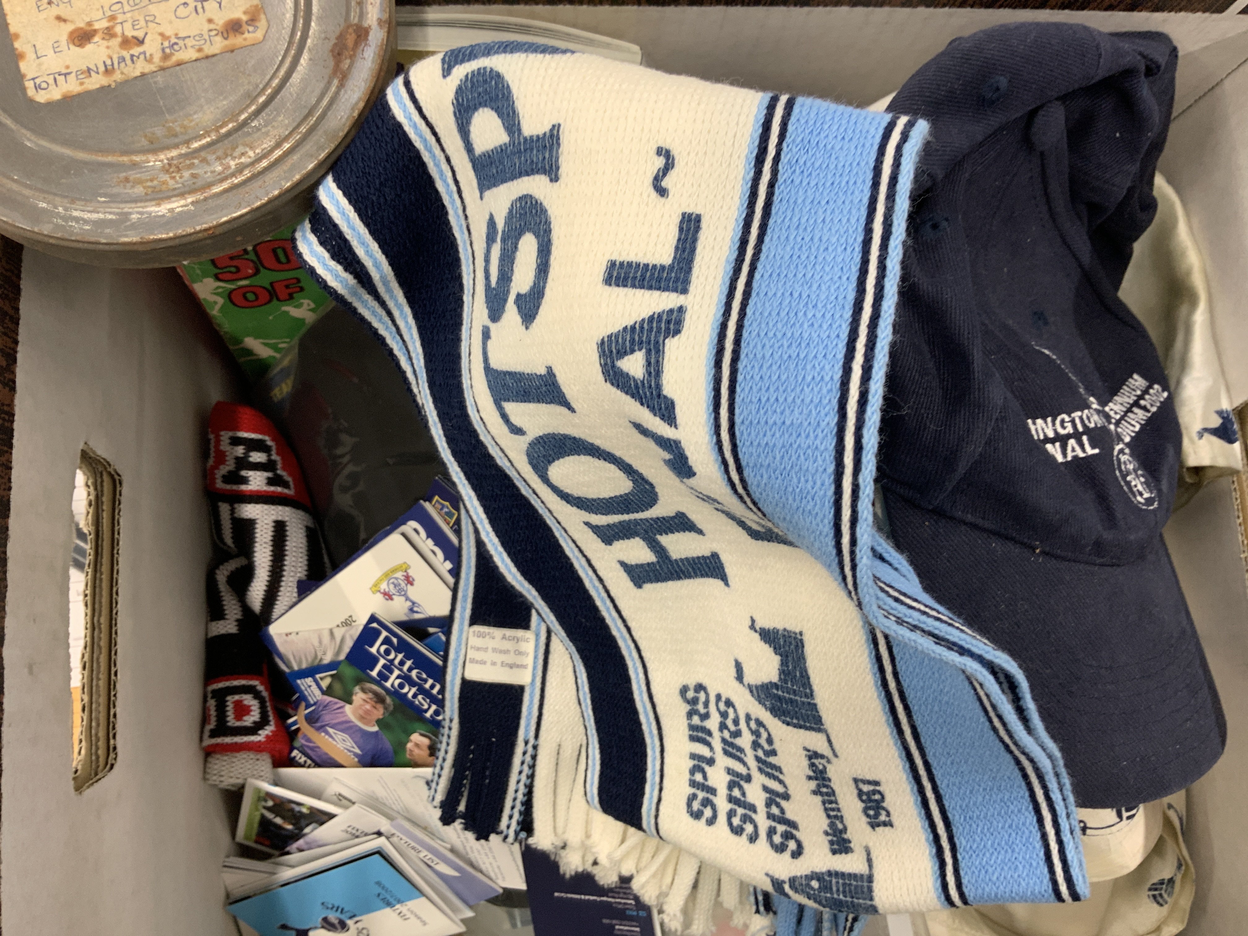 Tottenham Football Memorabilia Boxes: Worth a look with an old Tottenham lampshade and lamp, silk scarves, Cup final caps, 1961 Cup Final cine film, fixture lists, away Spurs Legends friendly programmes, calendar, quantity of mugs often still in packaging and more. (3 boxes)