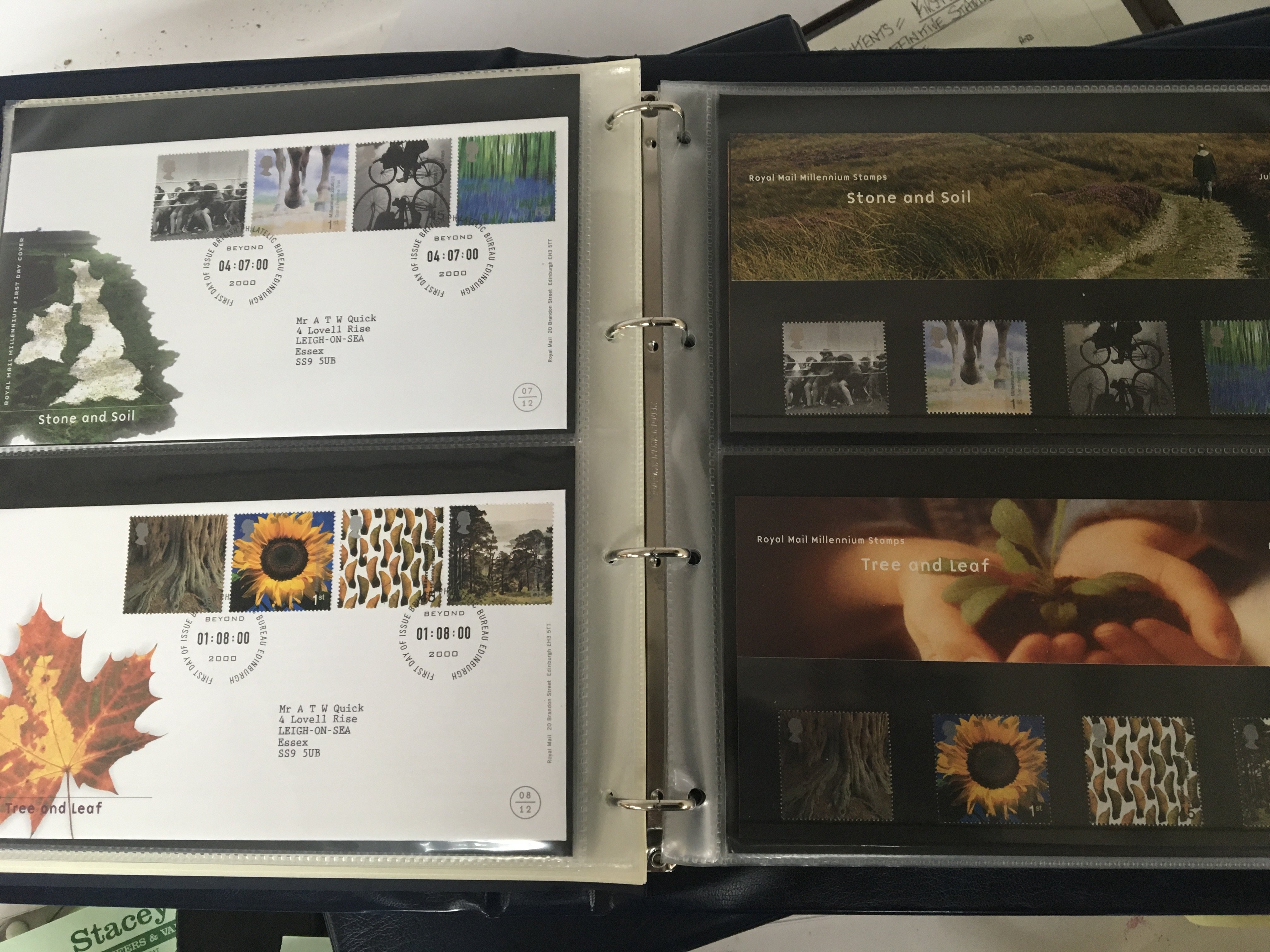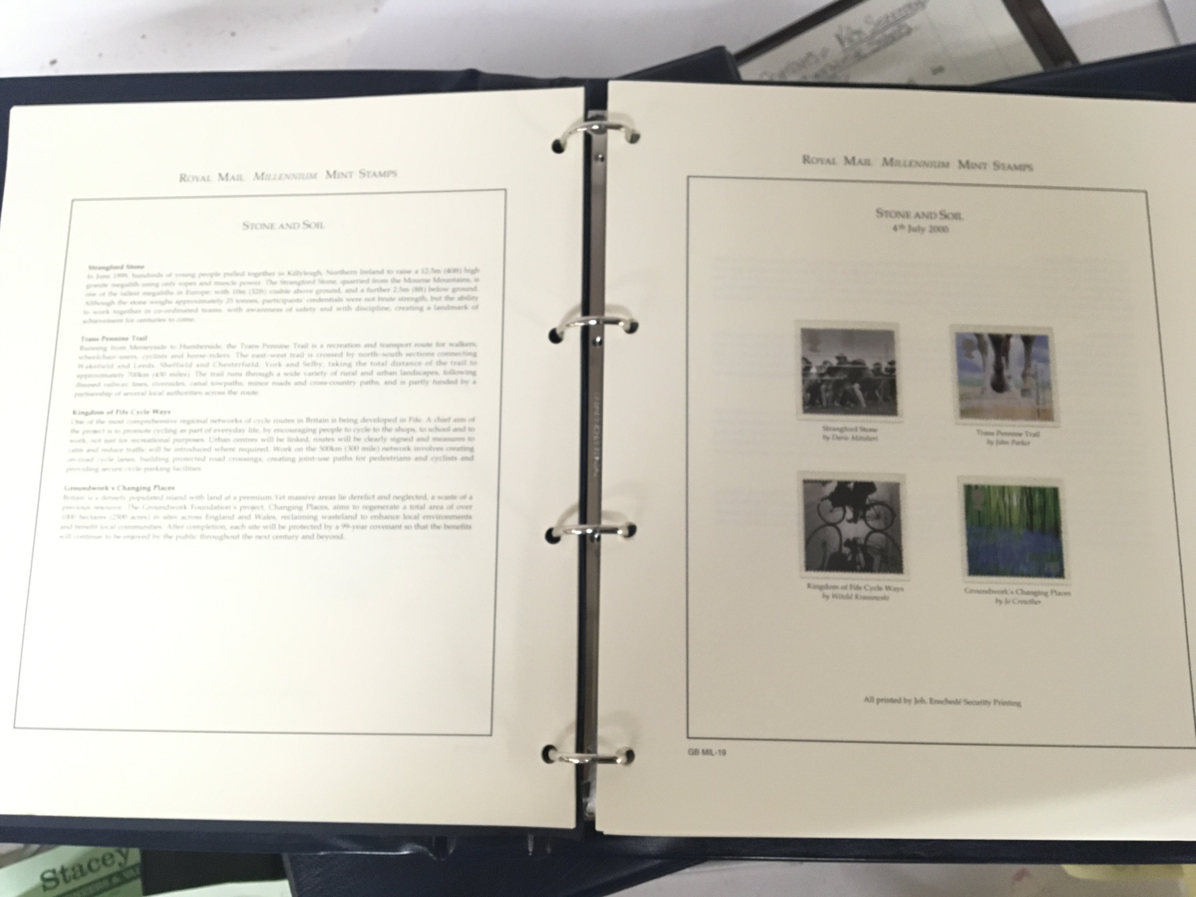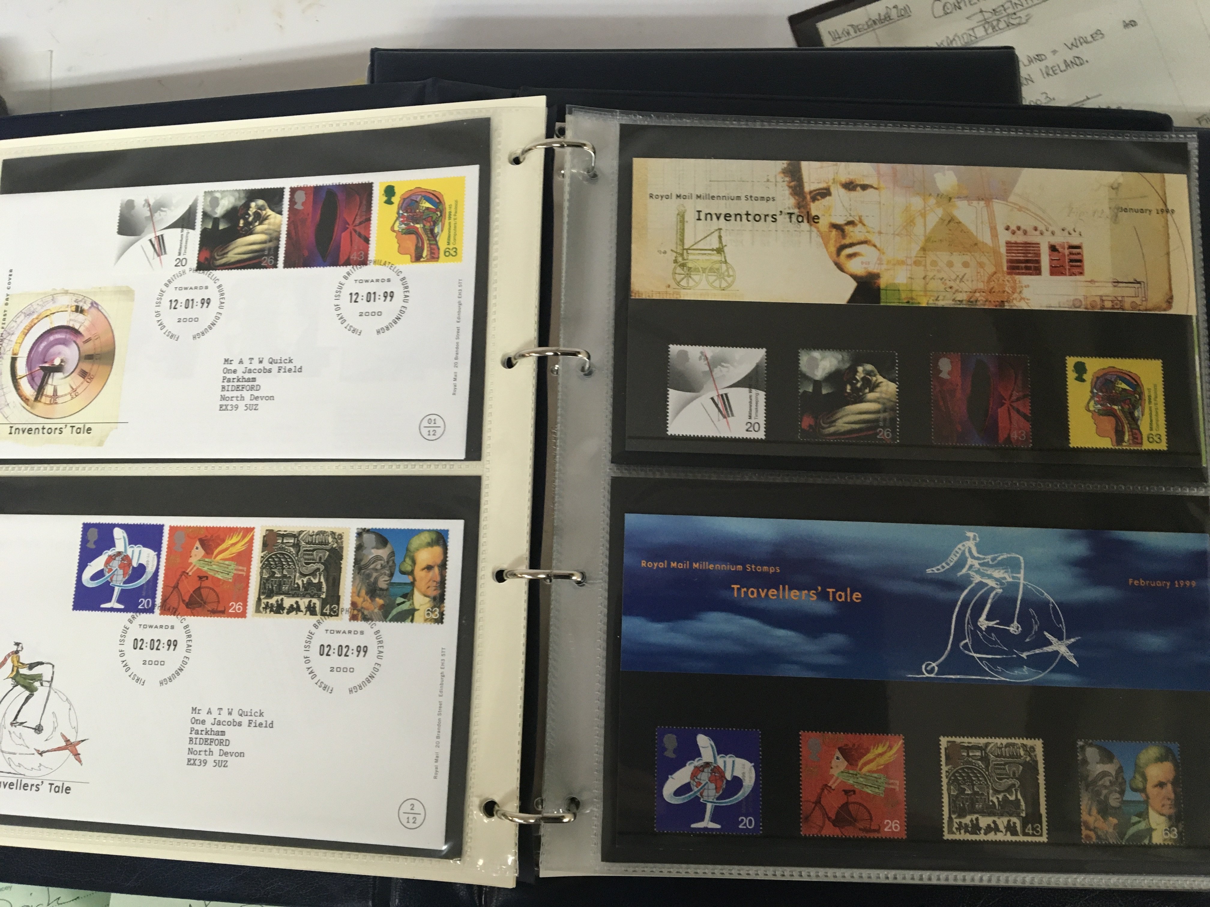 Four blue Royal Mail albums including Millennium album containing presentation packs and conforming first day covers and a few PHQ cards. (4)