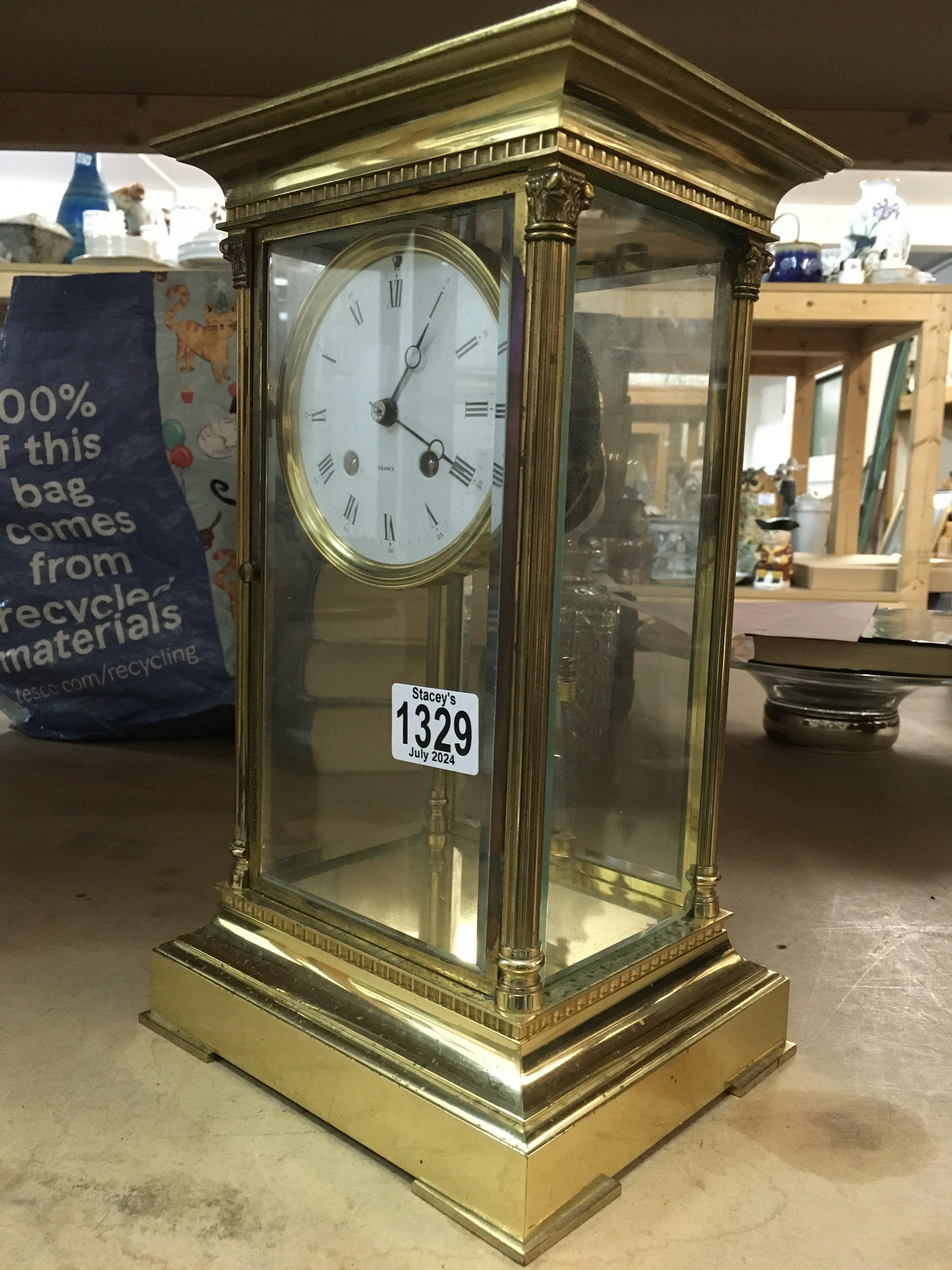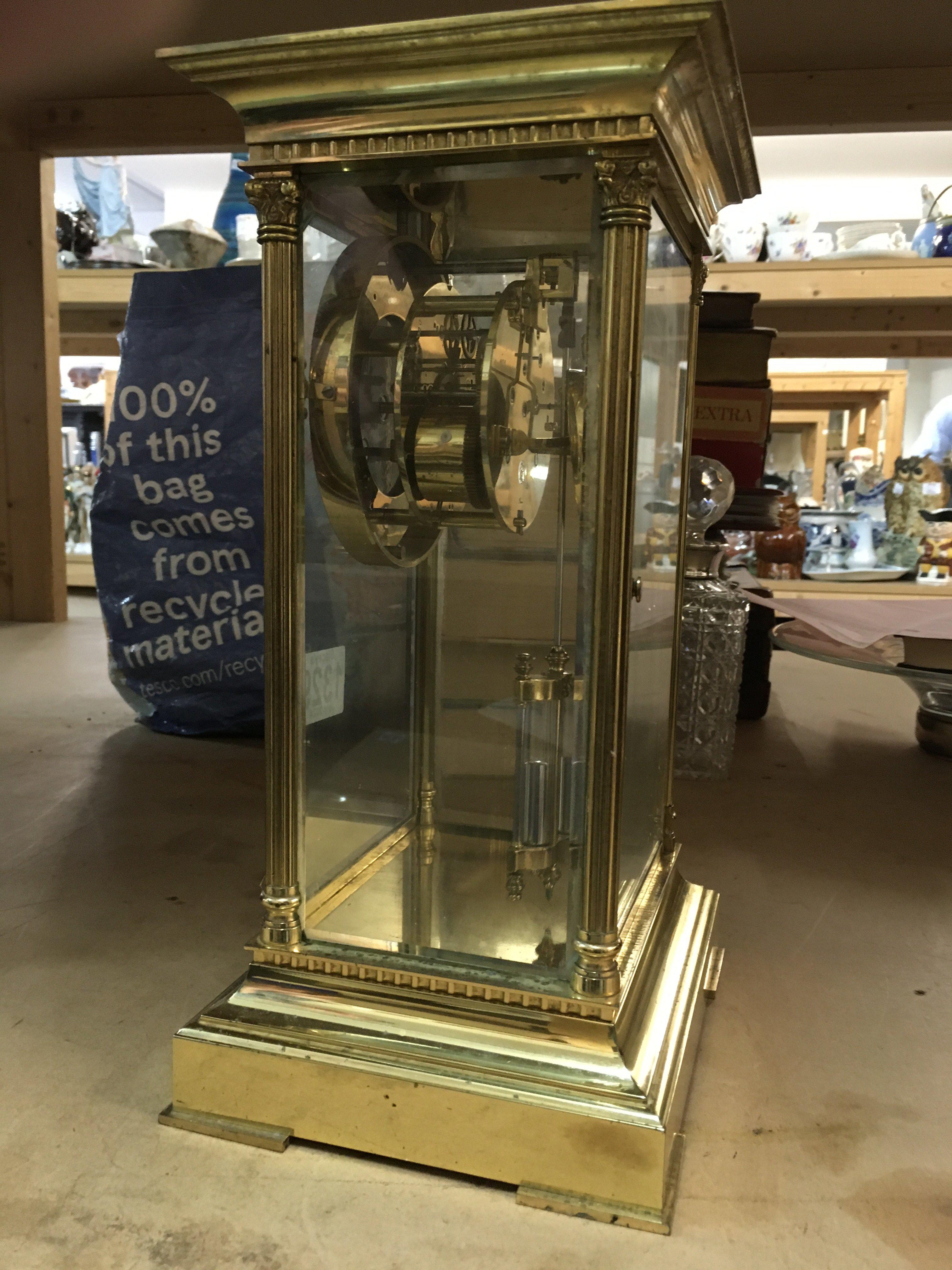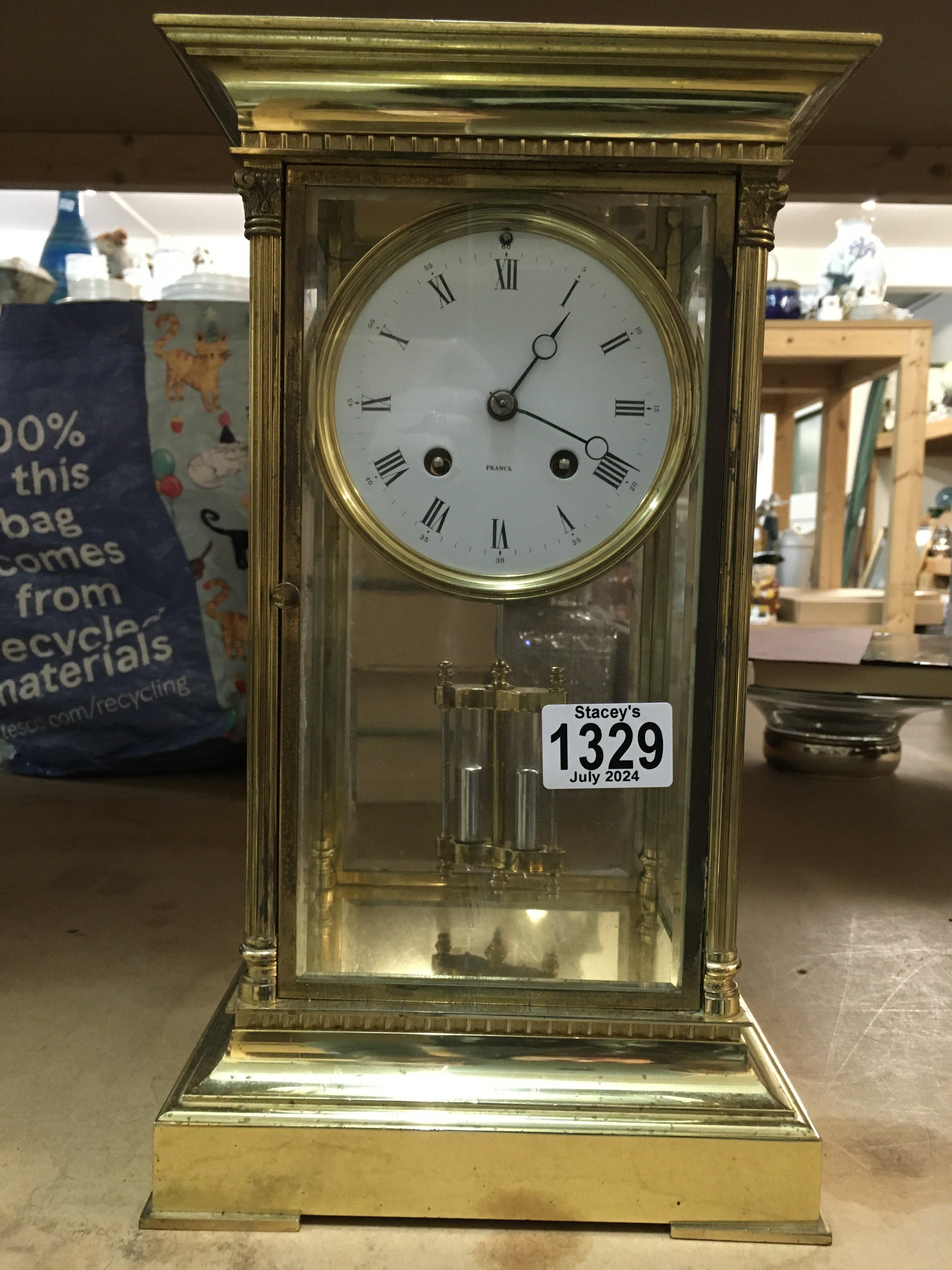 A French four glass brass mantle clock with visible mercury pendulum, the circular dial having Roman Numerals