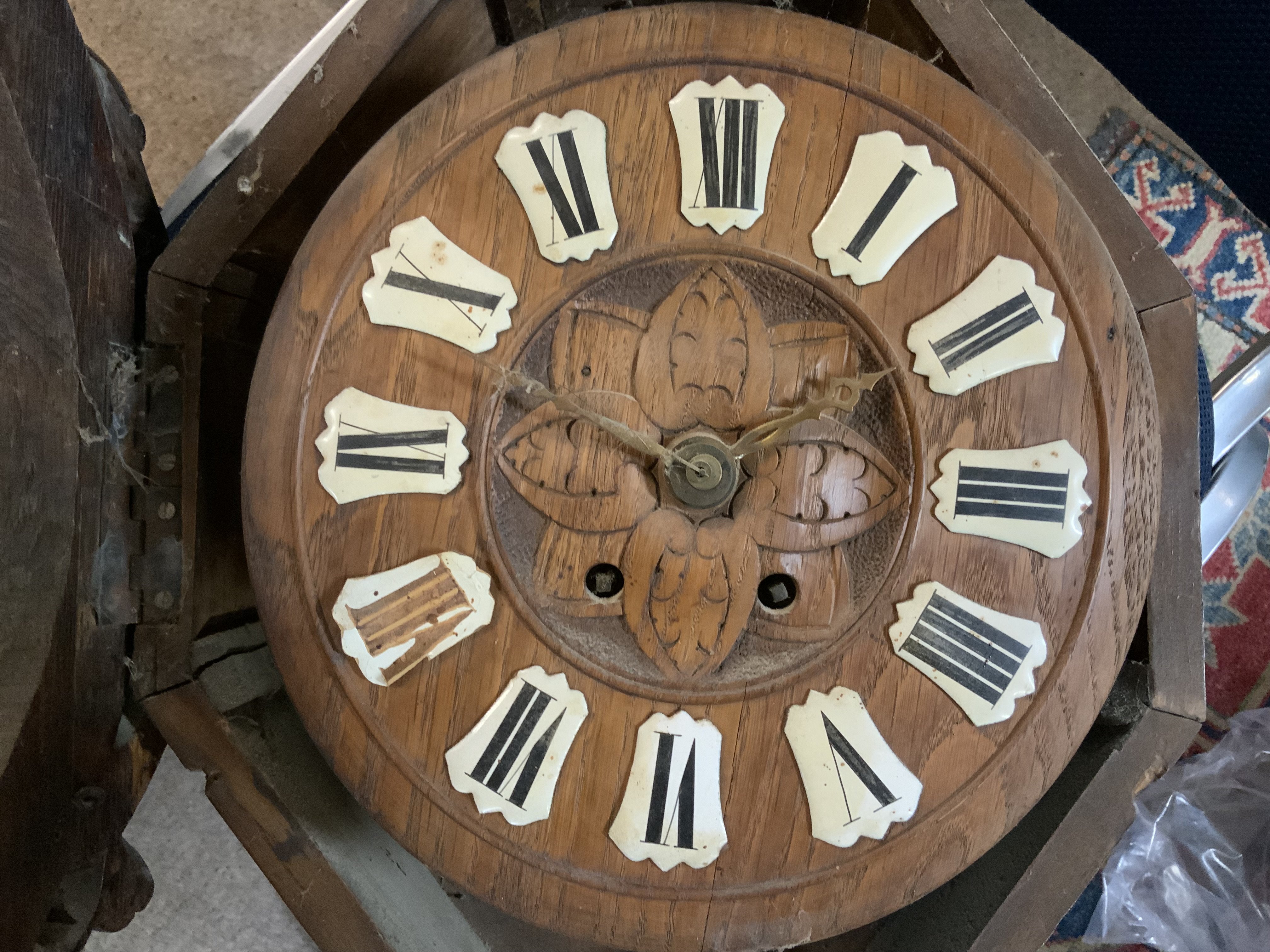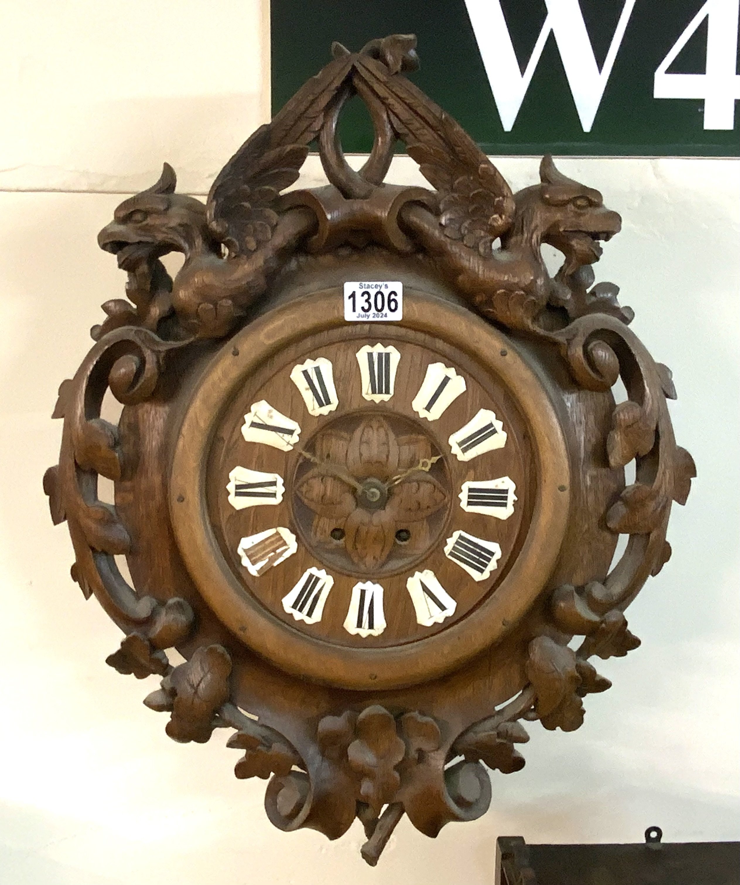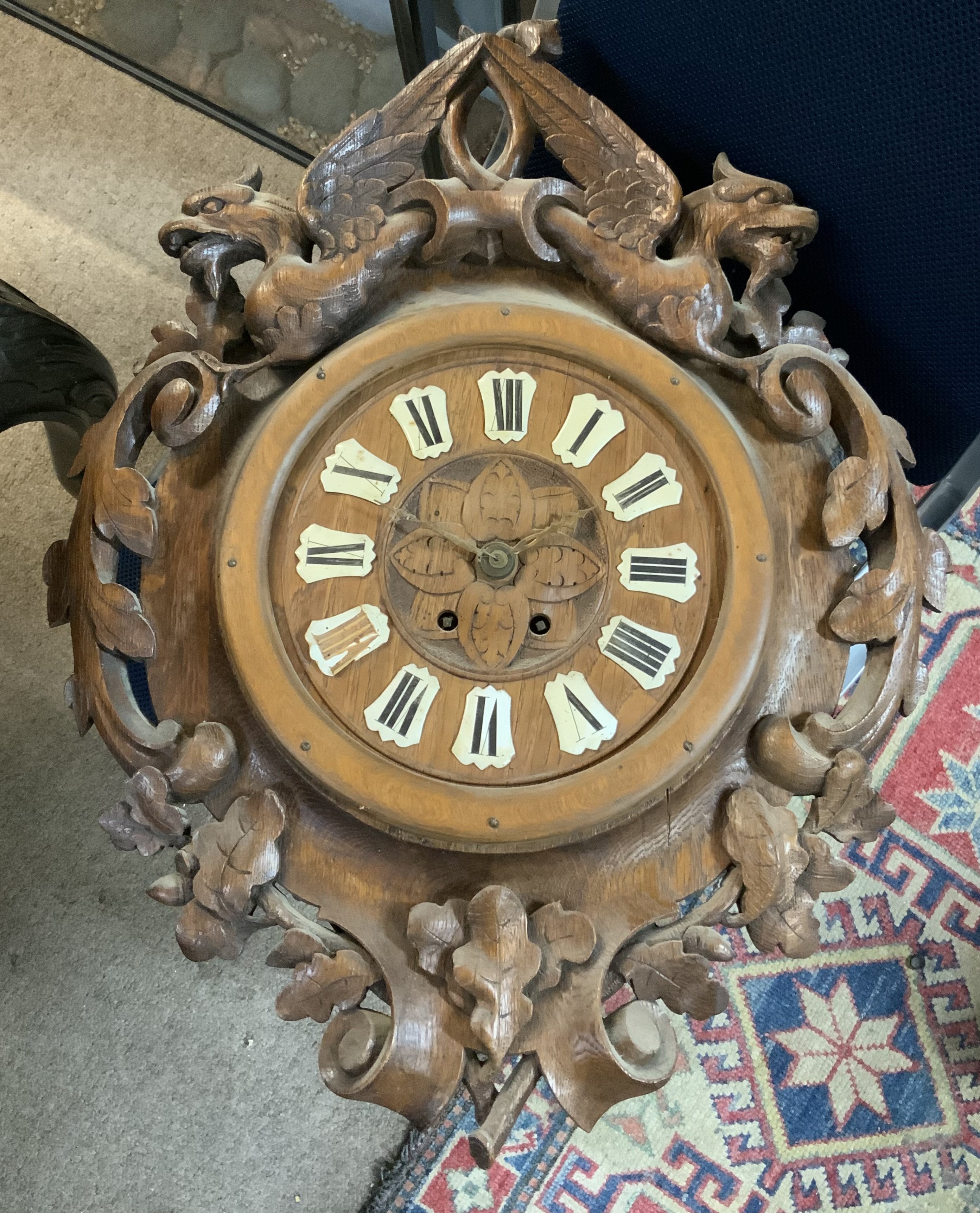 A 19thC Black Forest oak carved oak wall clock. (D)