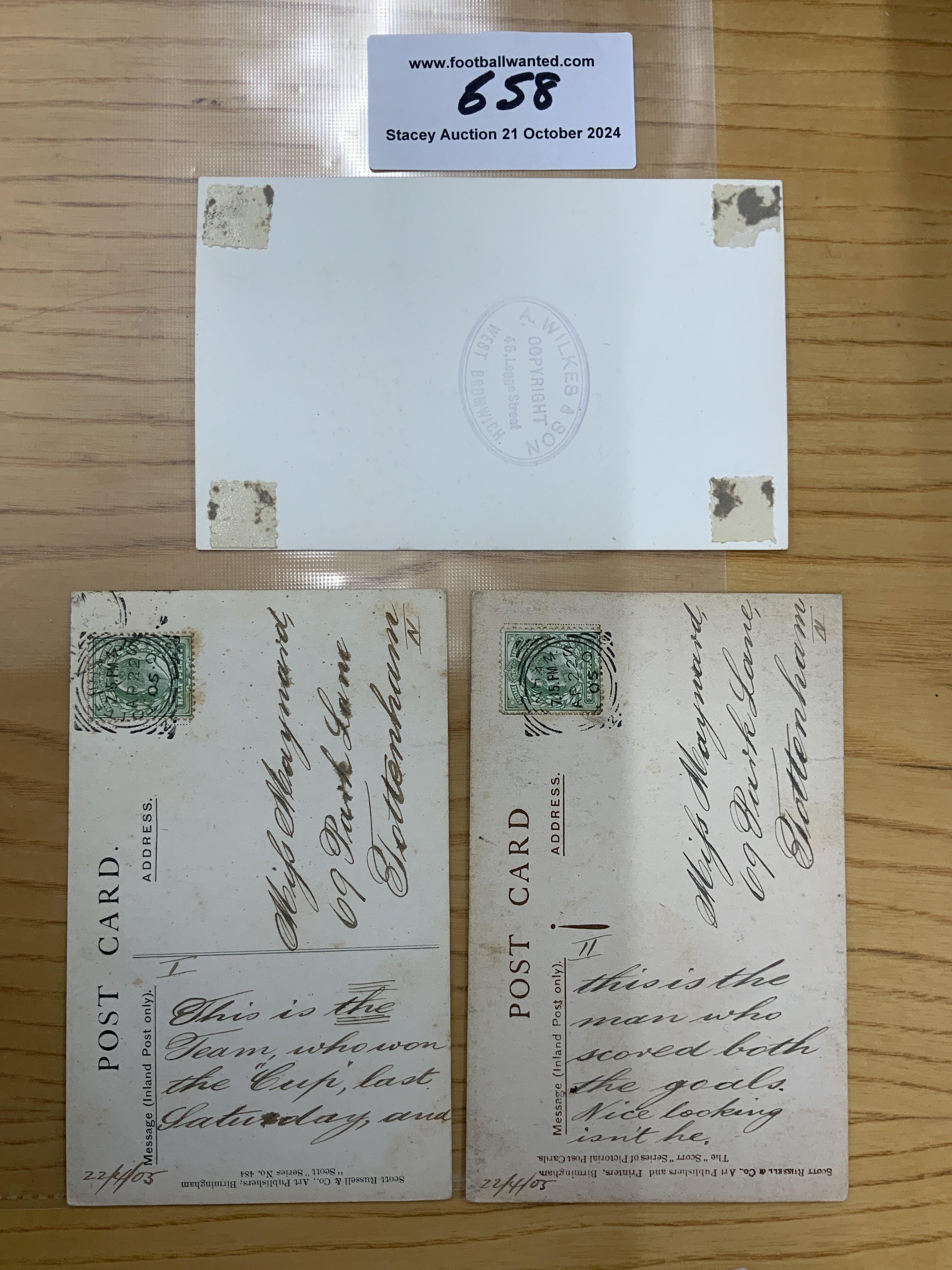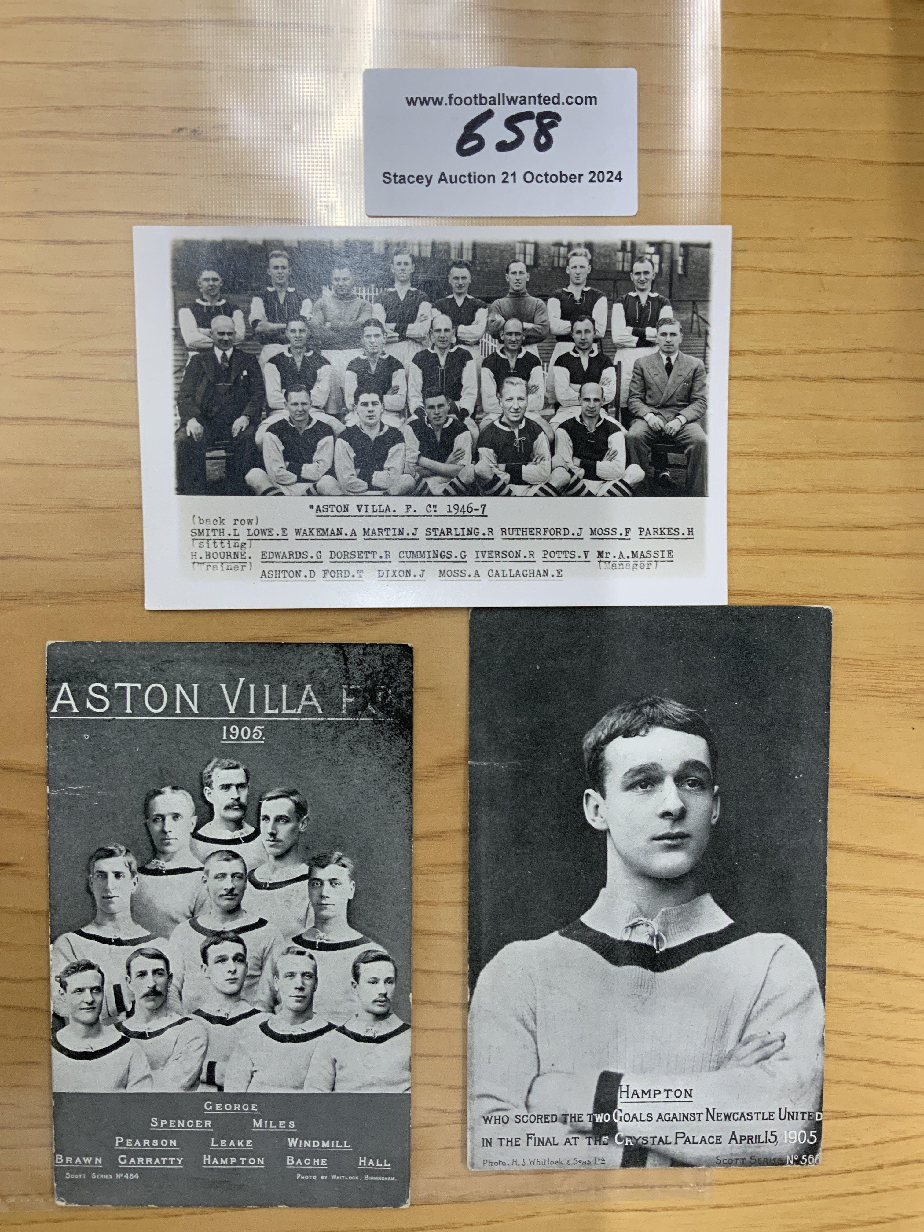 Aston Villa 1905 FA Cup Winners Football Postcards: Original postcard with message to rear reading This is the team that won the FA Cup last Saturday. Also a postcard of Hampton the player that scored two goals in the final. C/W 46/47 Villa team group which is a Wilkes picture that has been previously stuck down. (3)