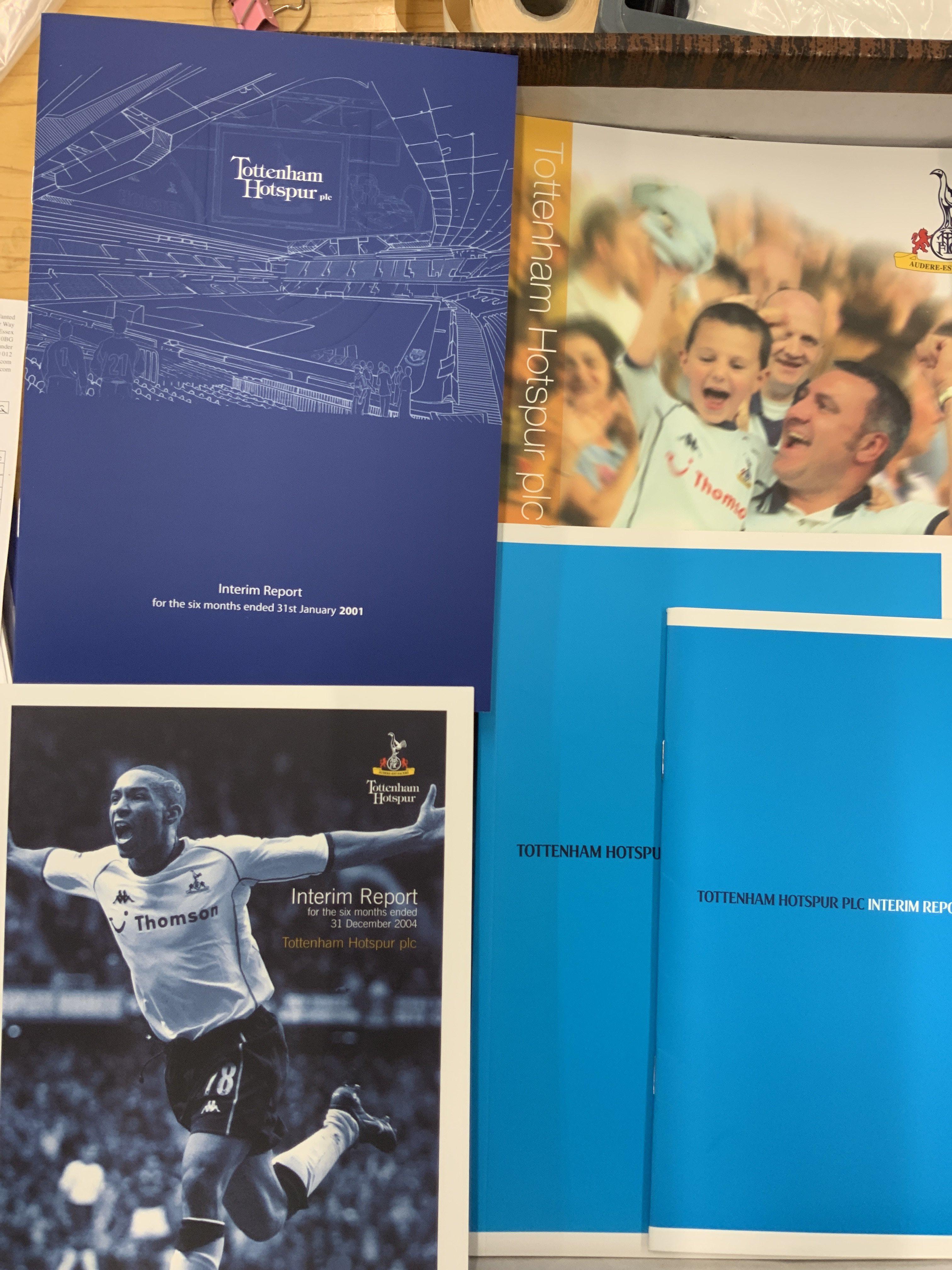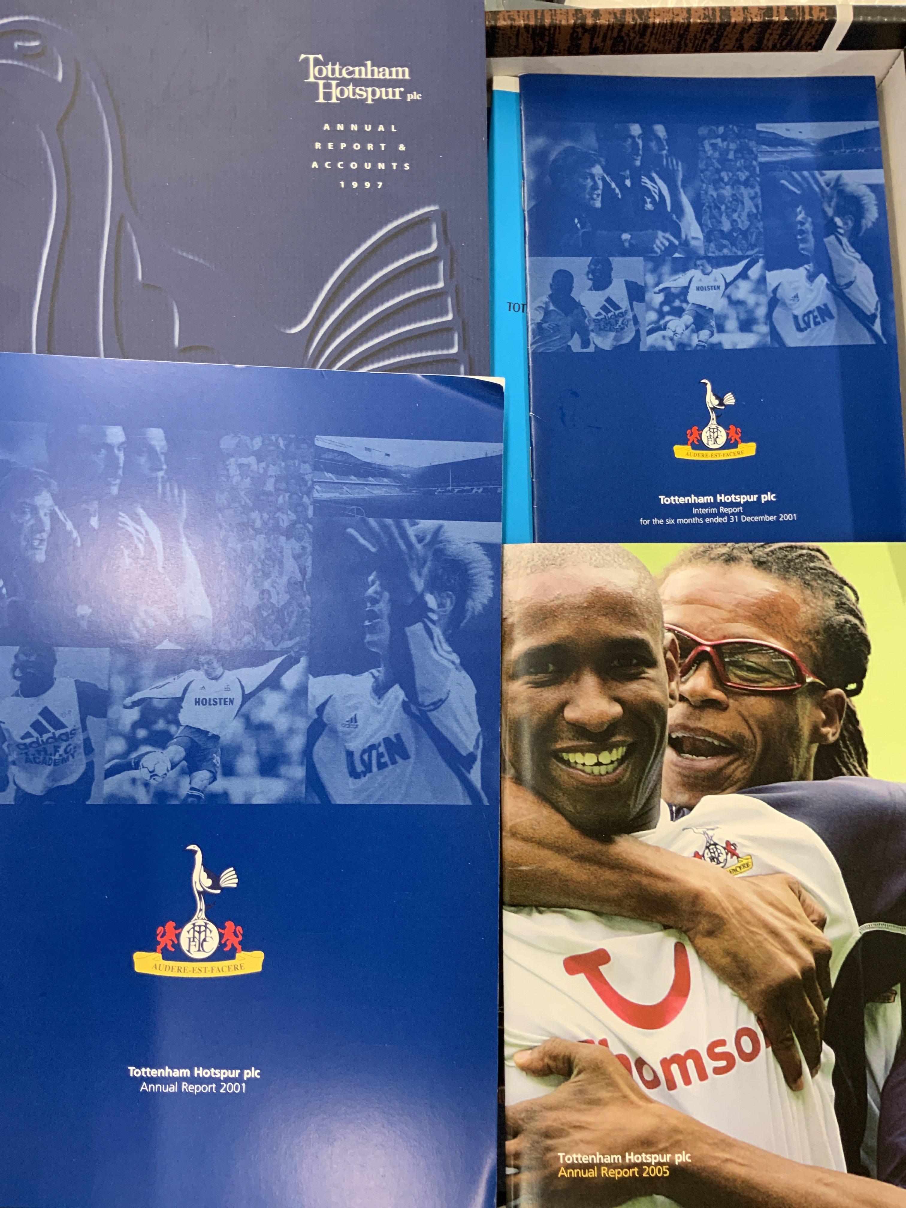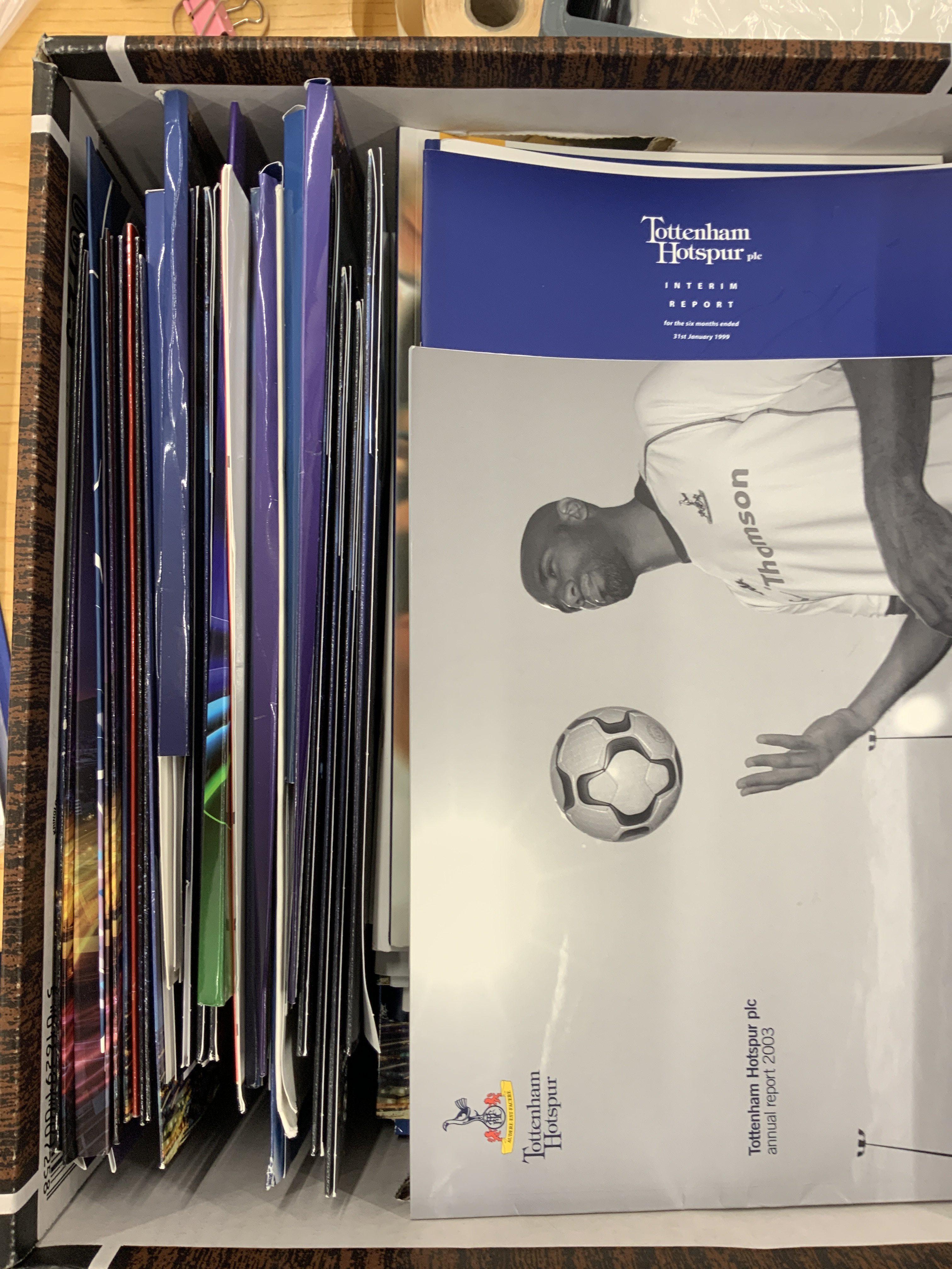 Tottenham Annual Reports + Football Press Packs: Large box containing possibly 100 paper items including Share Prospectuses, Champions League press packs, Interim reports and annual reports. Mint condition and an interesting lot.