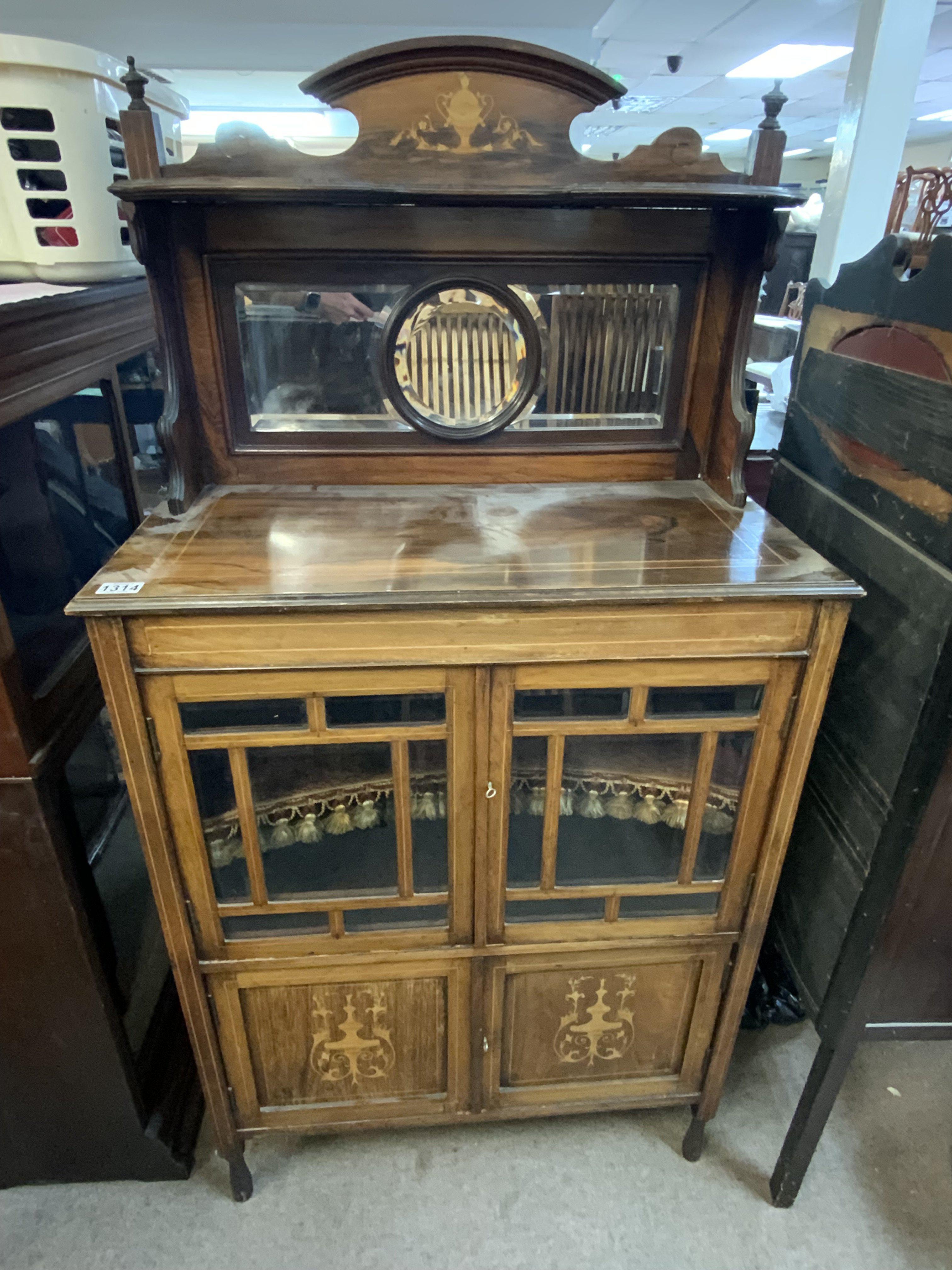 An Edwardian inlaid music cabinet with mirrored top section, 147cm x 76cm x 39cm