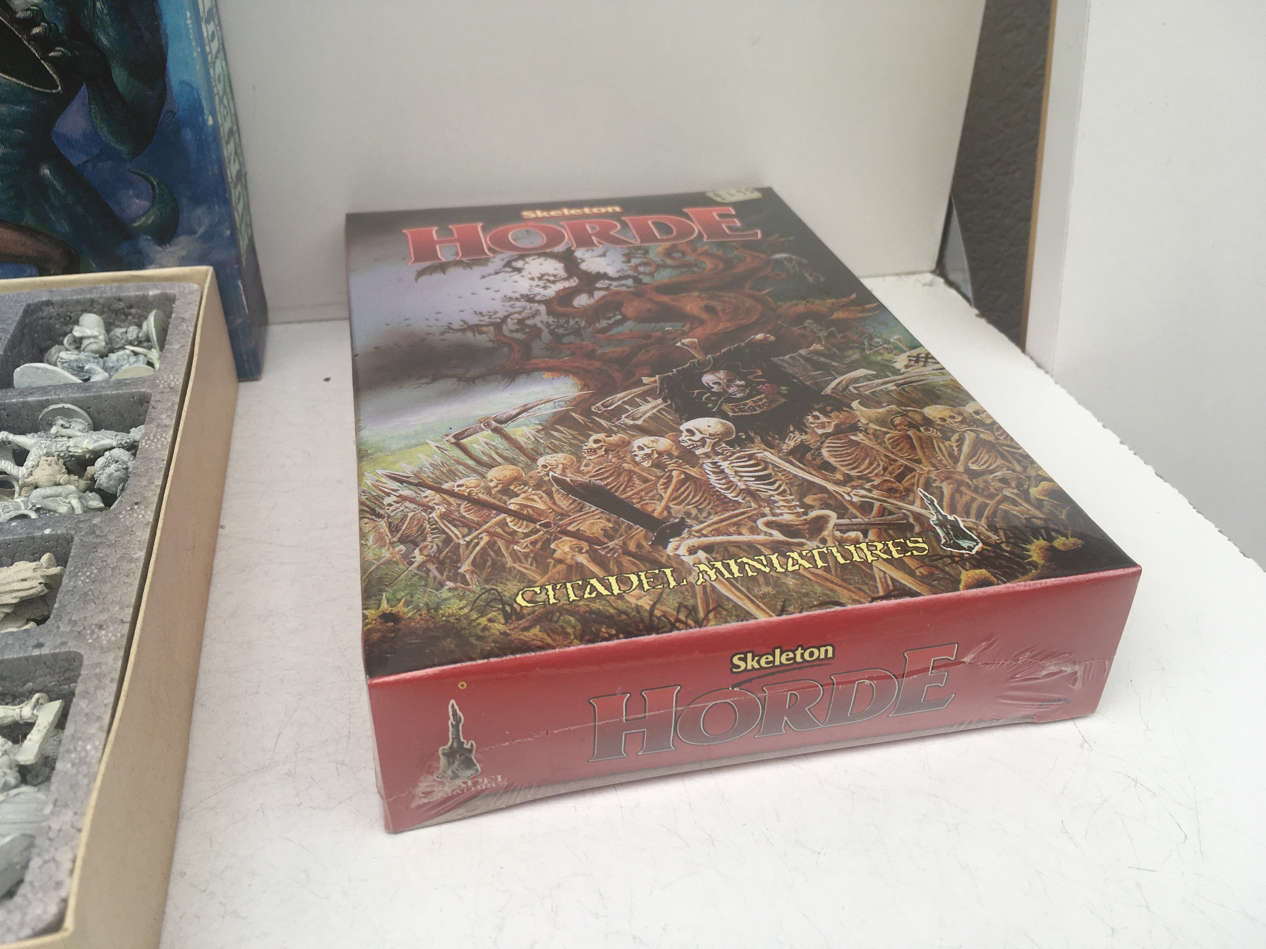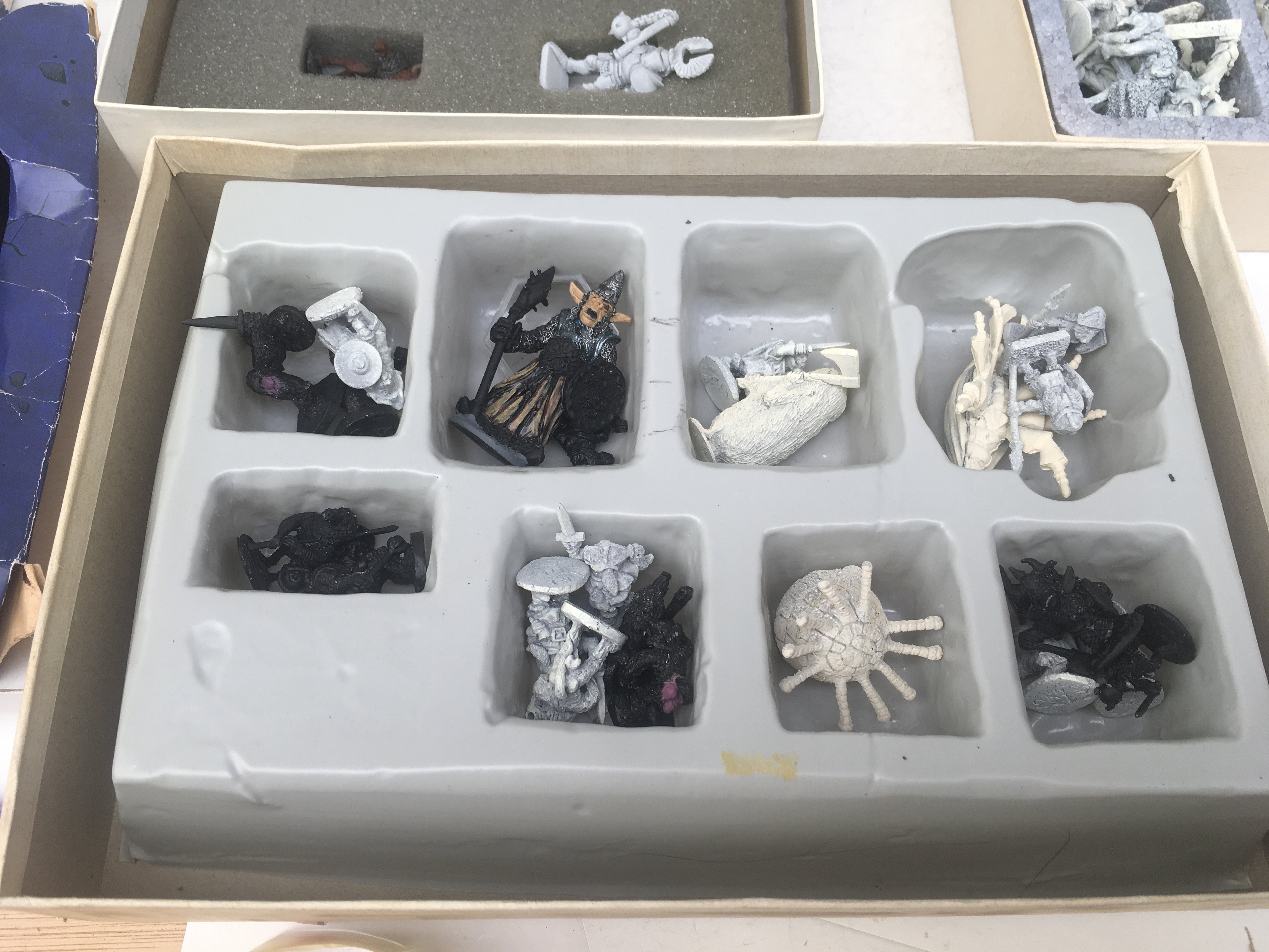 A group of 5 boxes containing metal and plastic model figures from a warhammer collection. Also includes resin stone dragon and box hobby starter set.