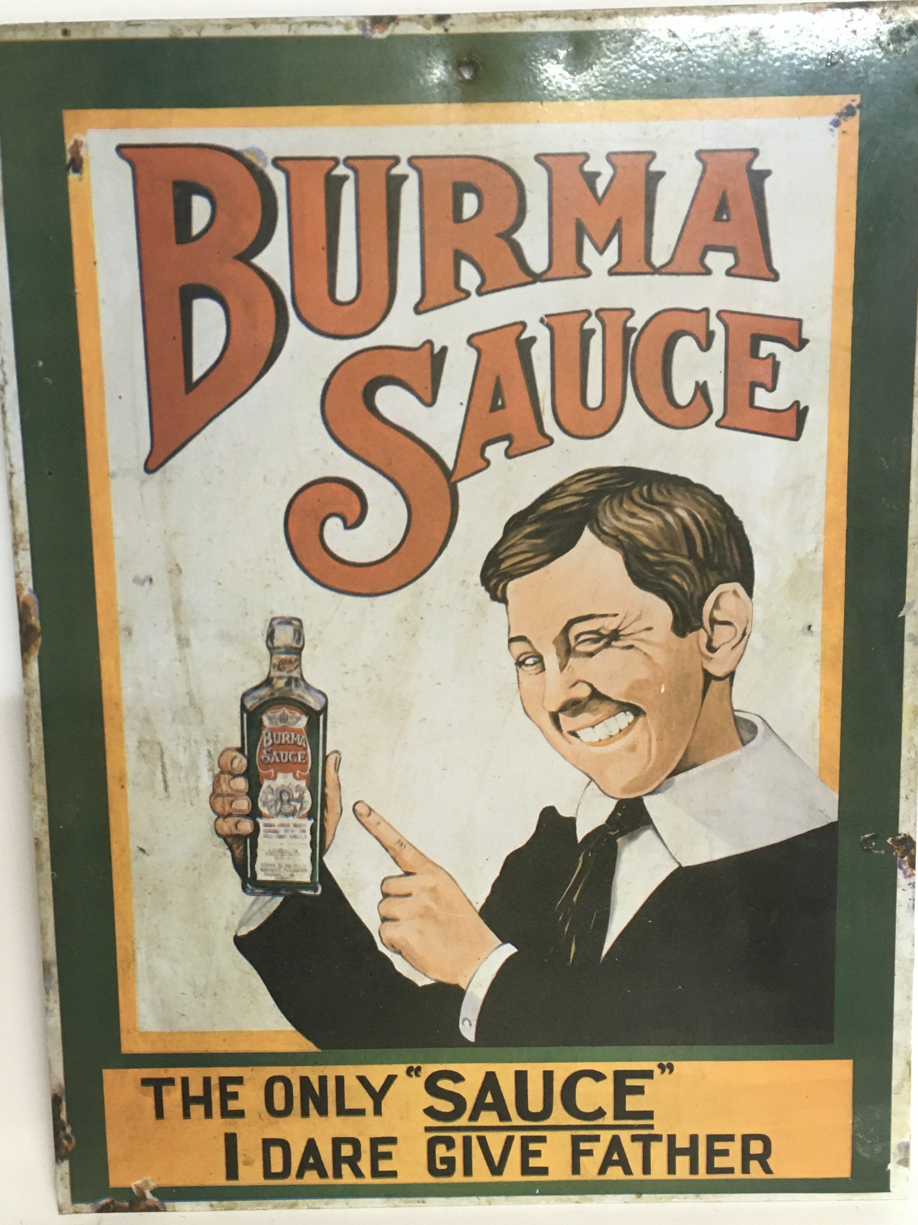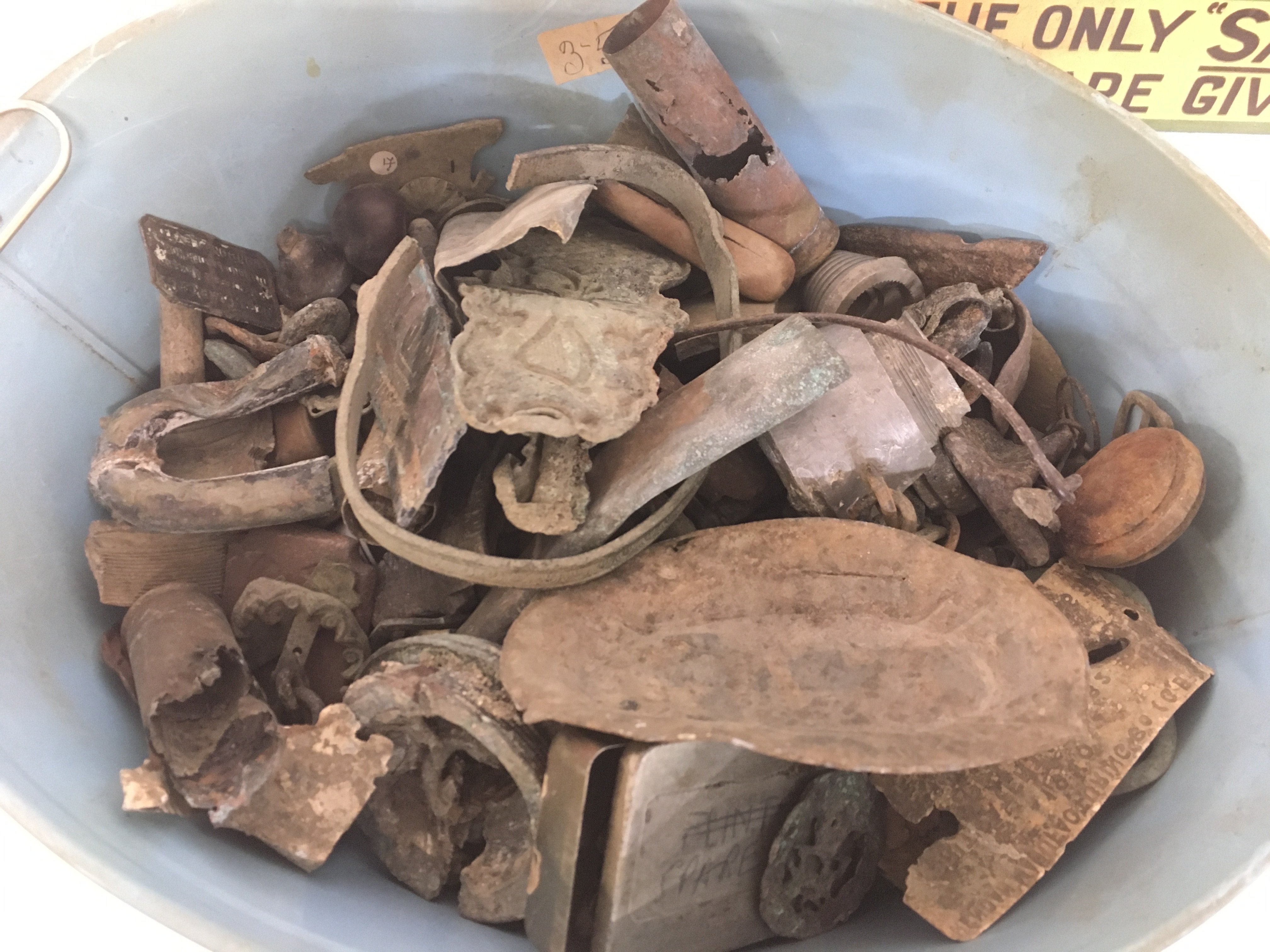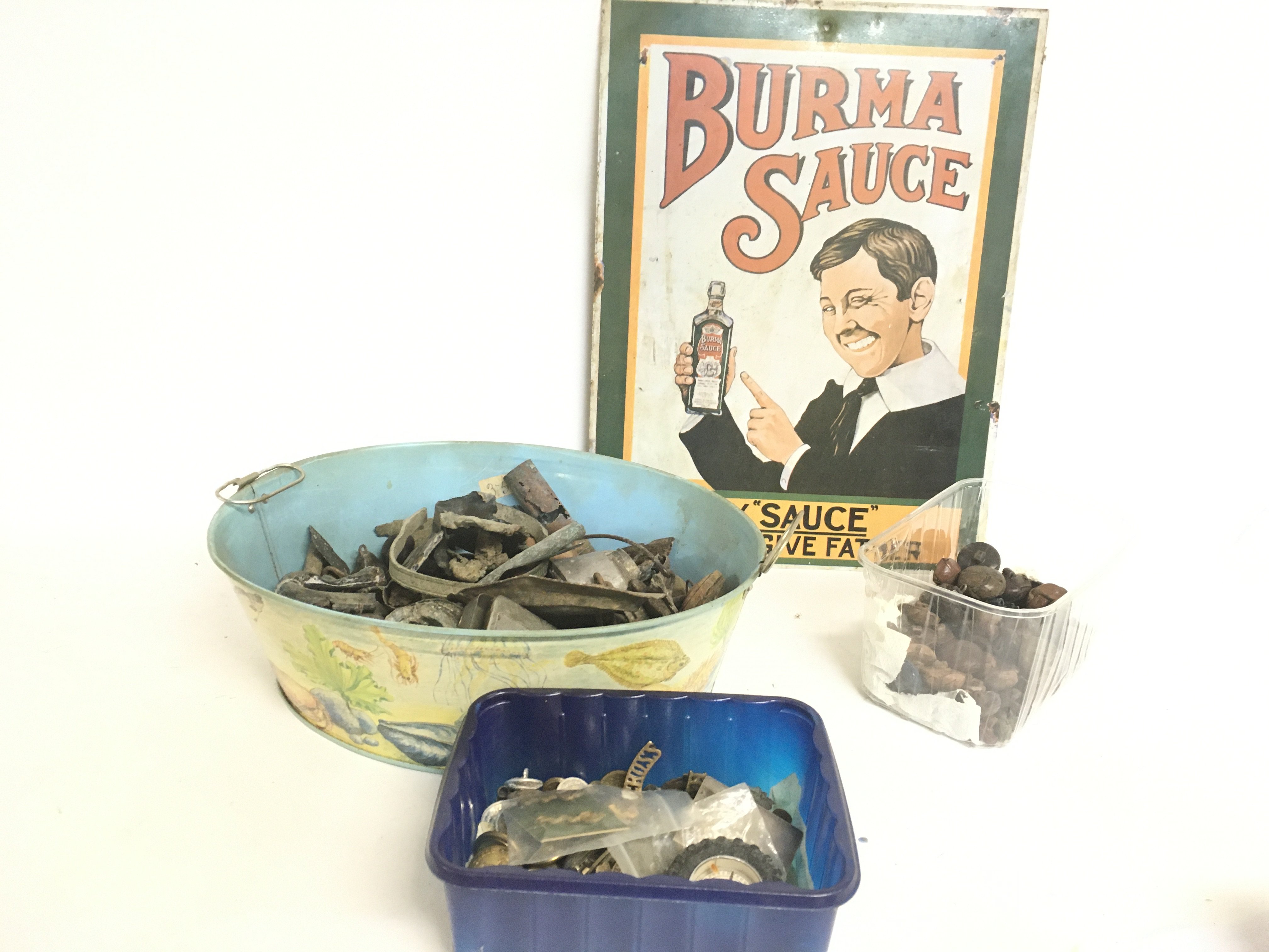 A collection of metal detector finds, a vintage enamel Burma Sauce advertisement, leather buttons and military cap badges