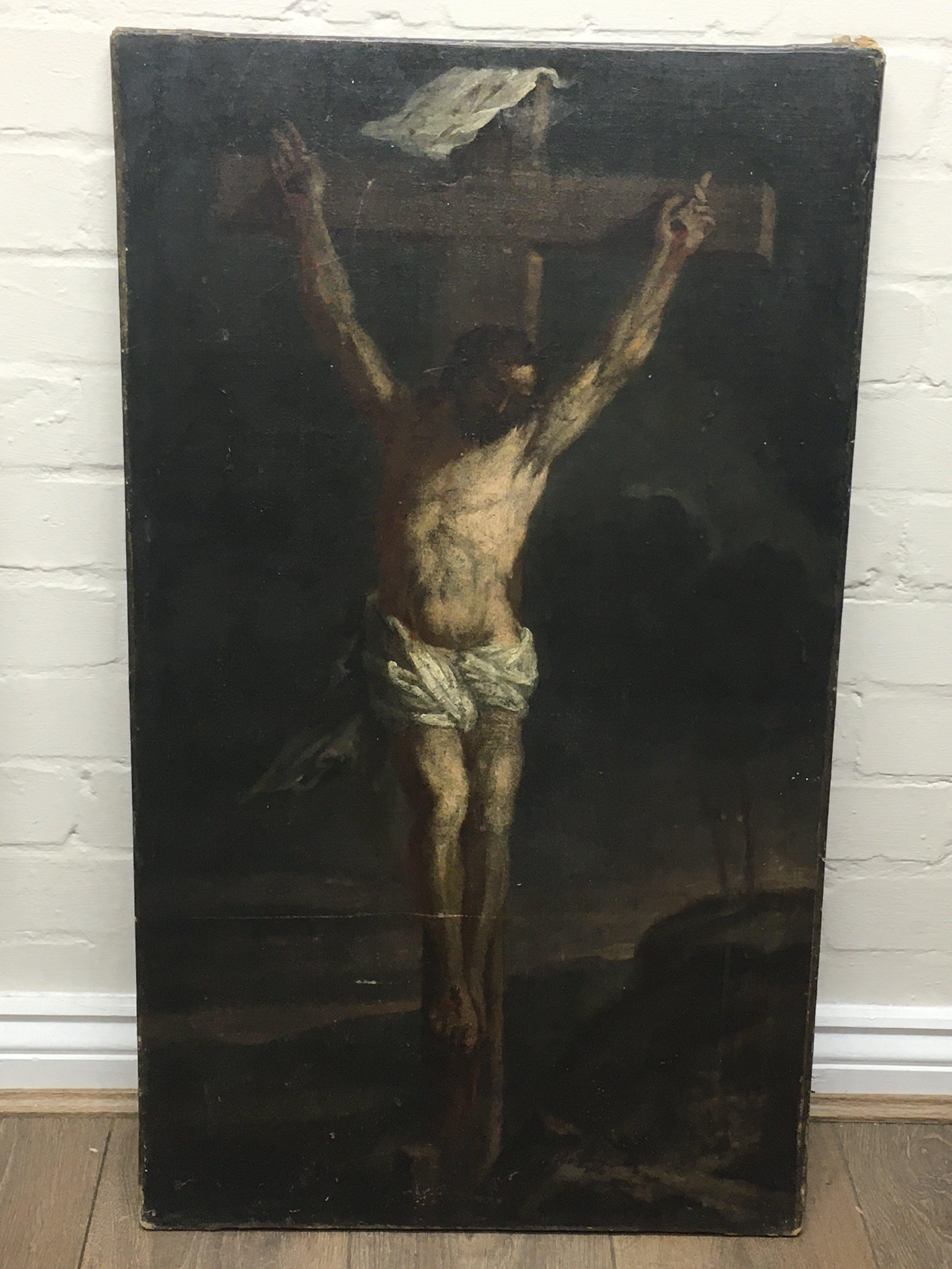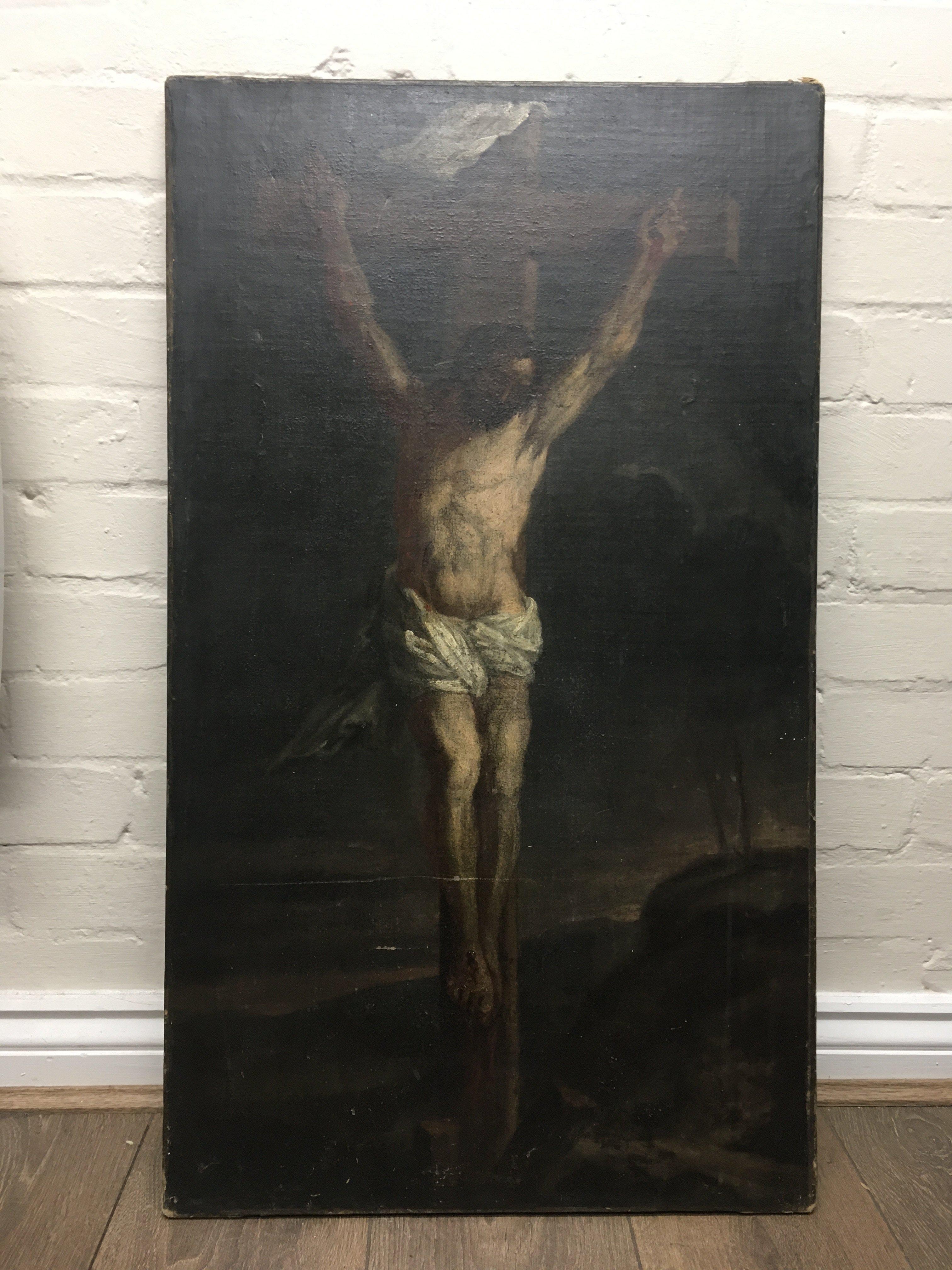 An oil on canvas depicting Jesus on the cross. Measuring 49cm x 84cm approximately