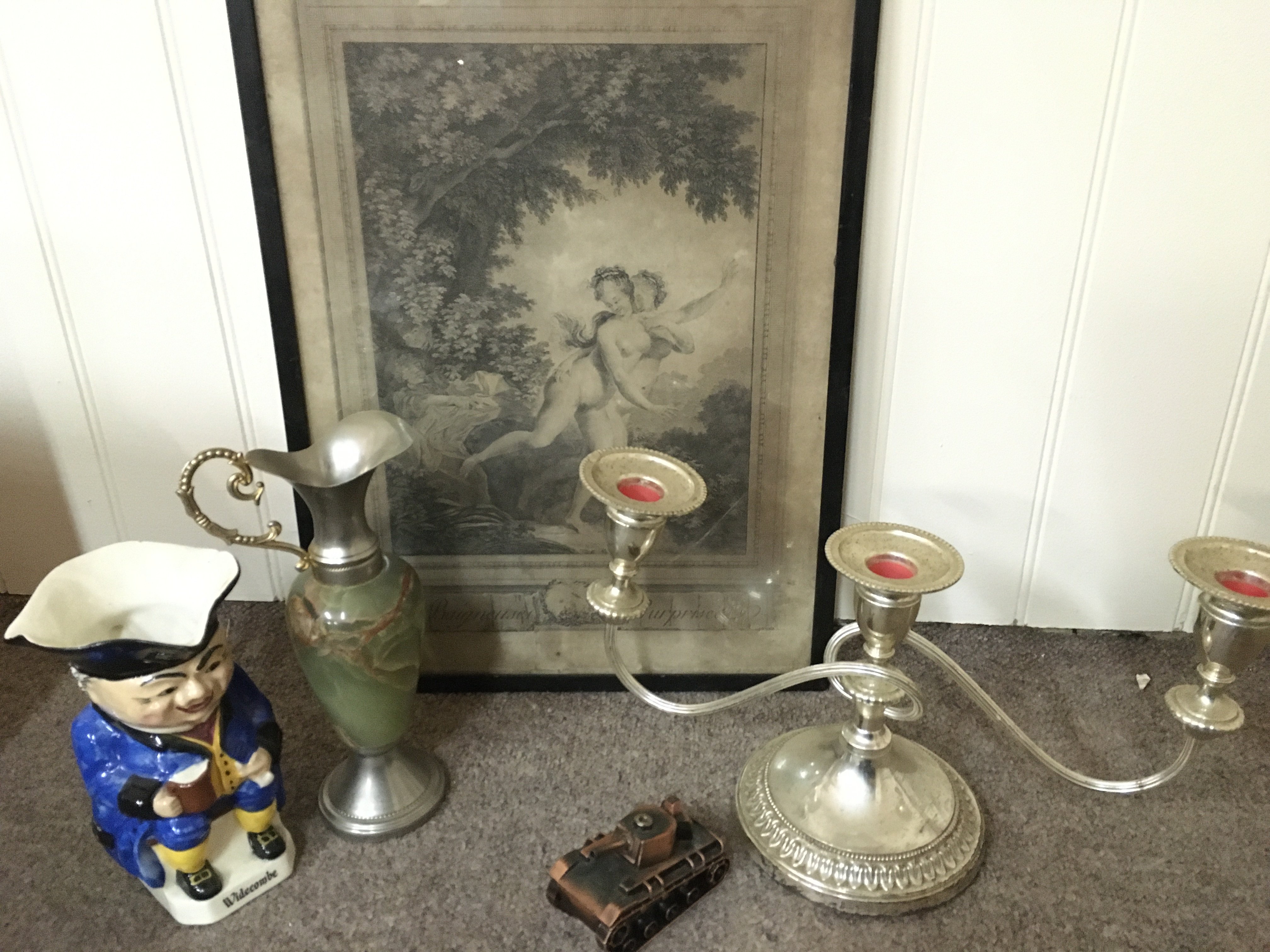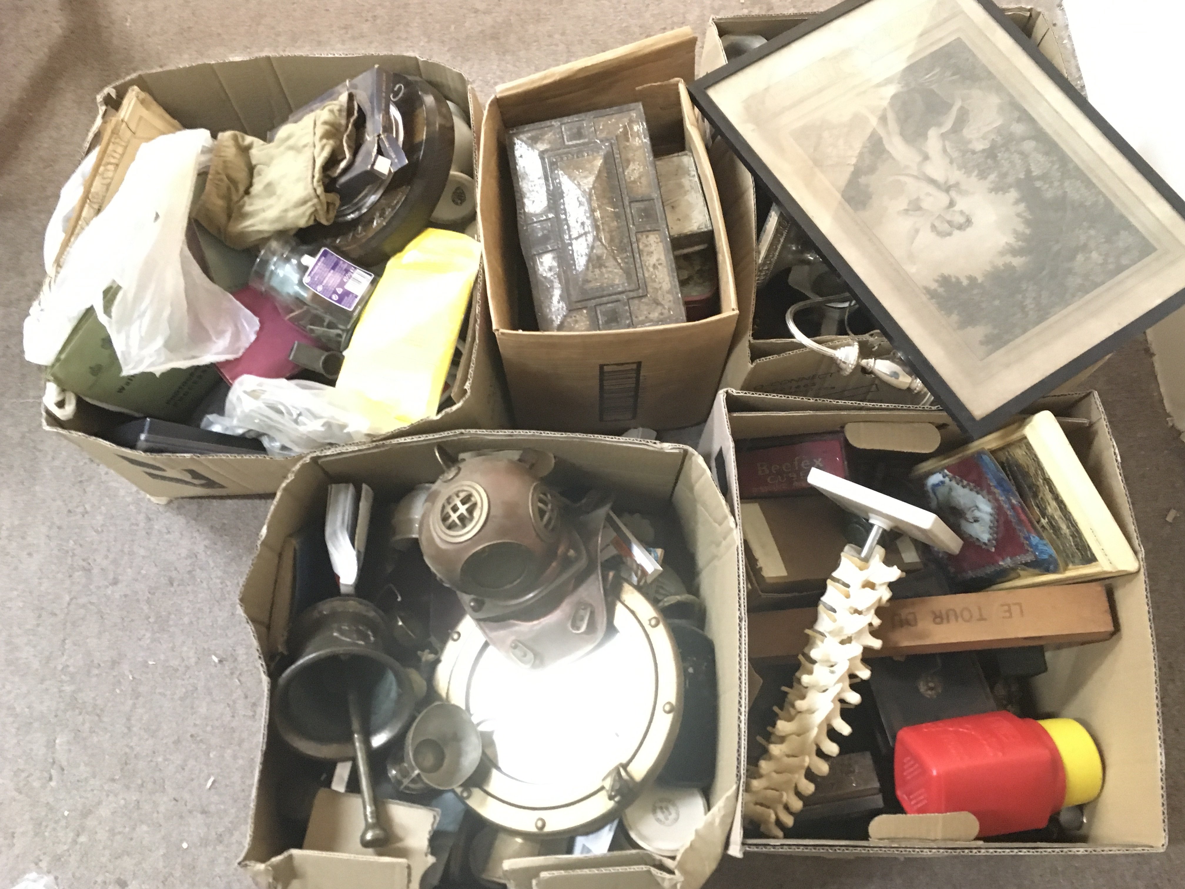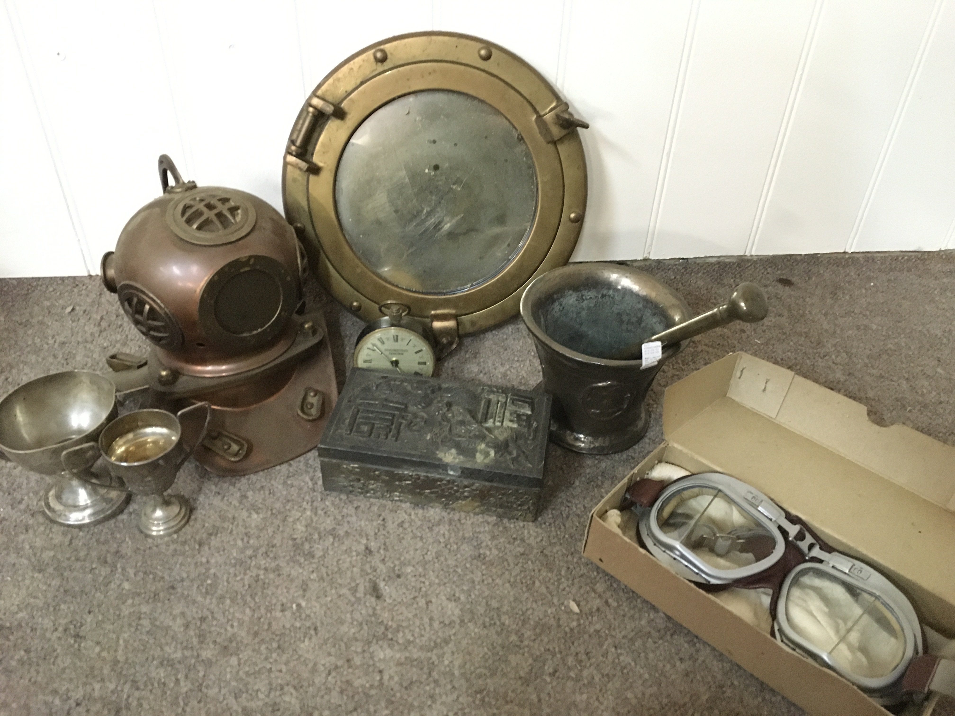 A collection of assorted items including a small brass and copper scuba diver helmet, a bronze mortar and pestle, Japanese dragon box etc.