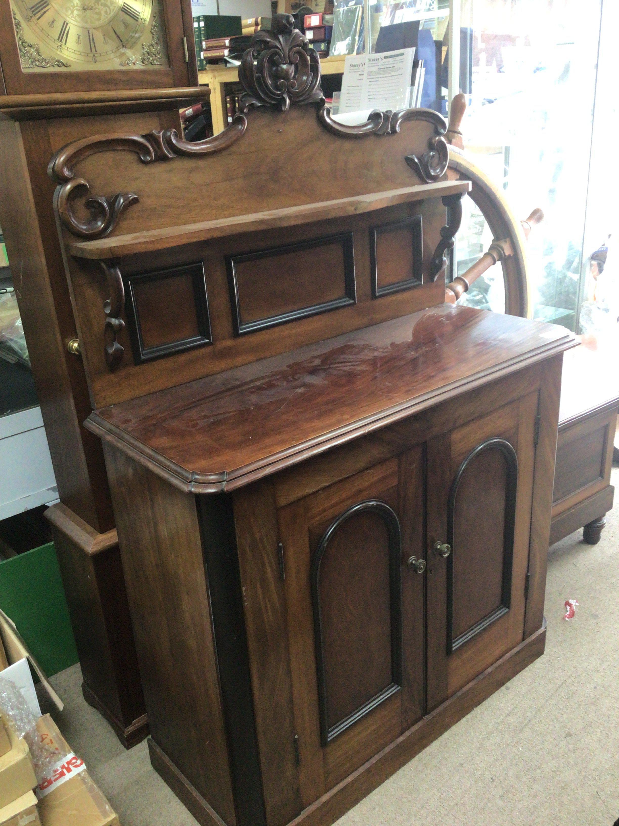 A Victorian walnut chiffonier with a raised back and applied scroll mouldings above cupboards. Width 94cm height 142cm