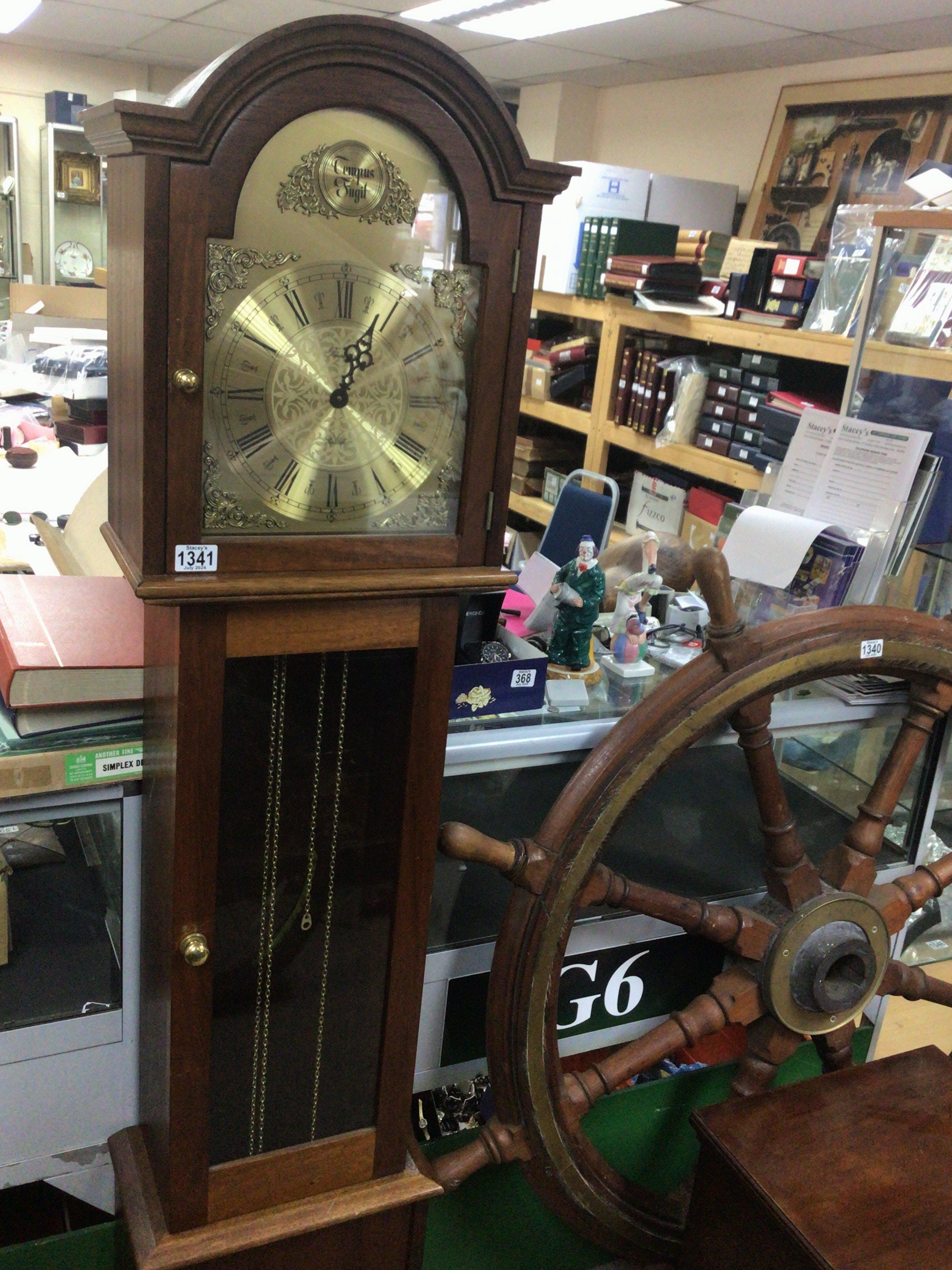 A Mahogany longcase clock with a brass dial and visible brass weights.