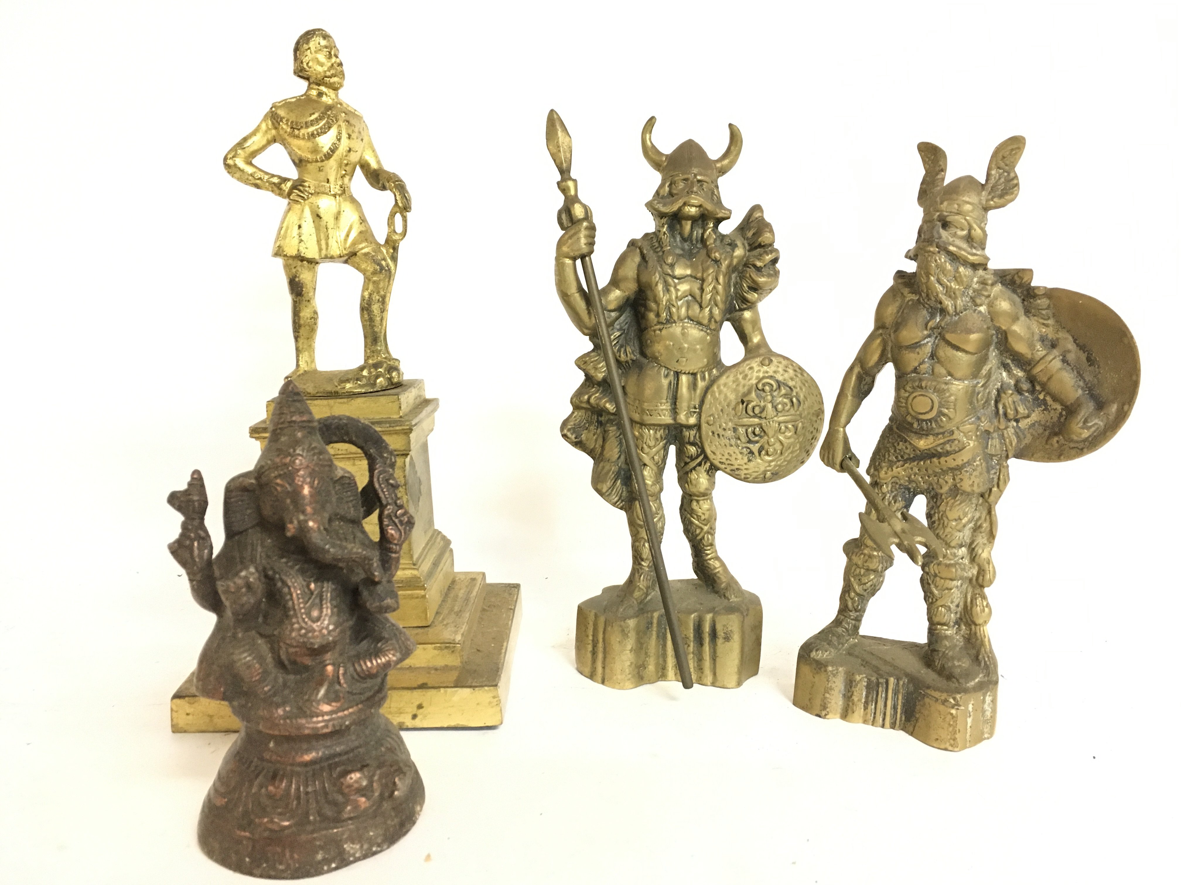 A collection of figures including A pair of gilt bronze viking figures, Ganesh, Francis Drake.