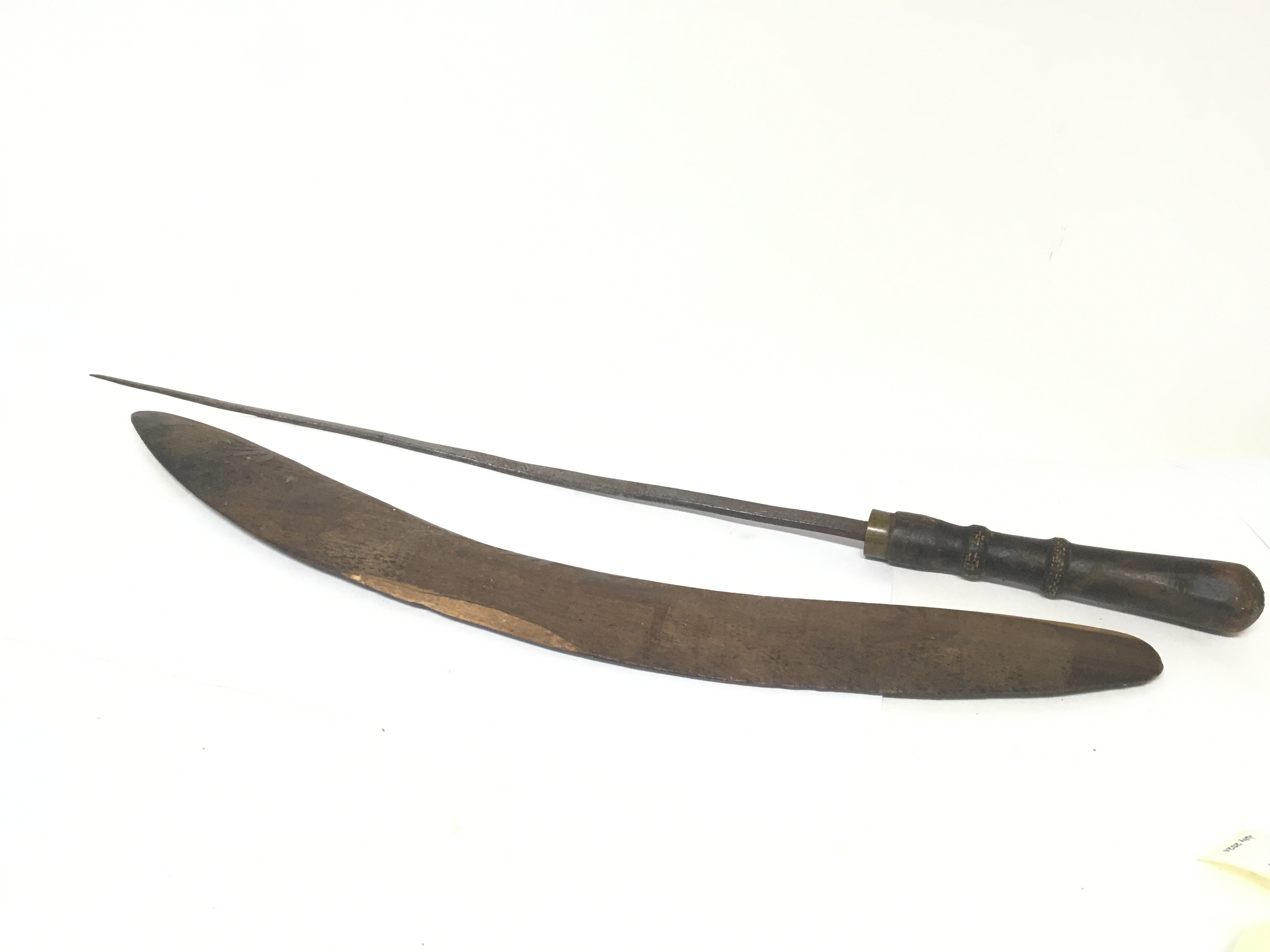 A carved hardwood Aboriginal boomerang and an African sword with leather grip and steel blade.