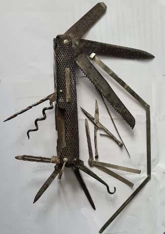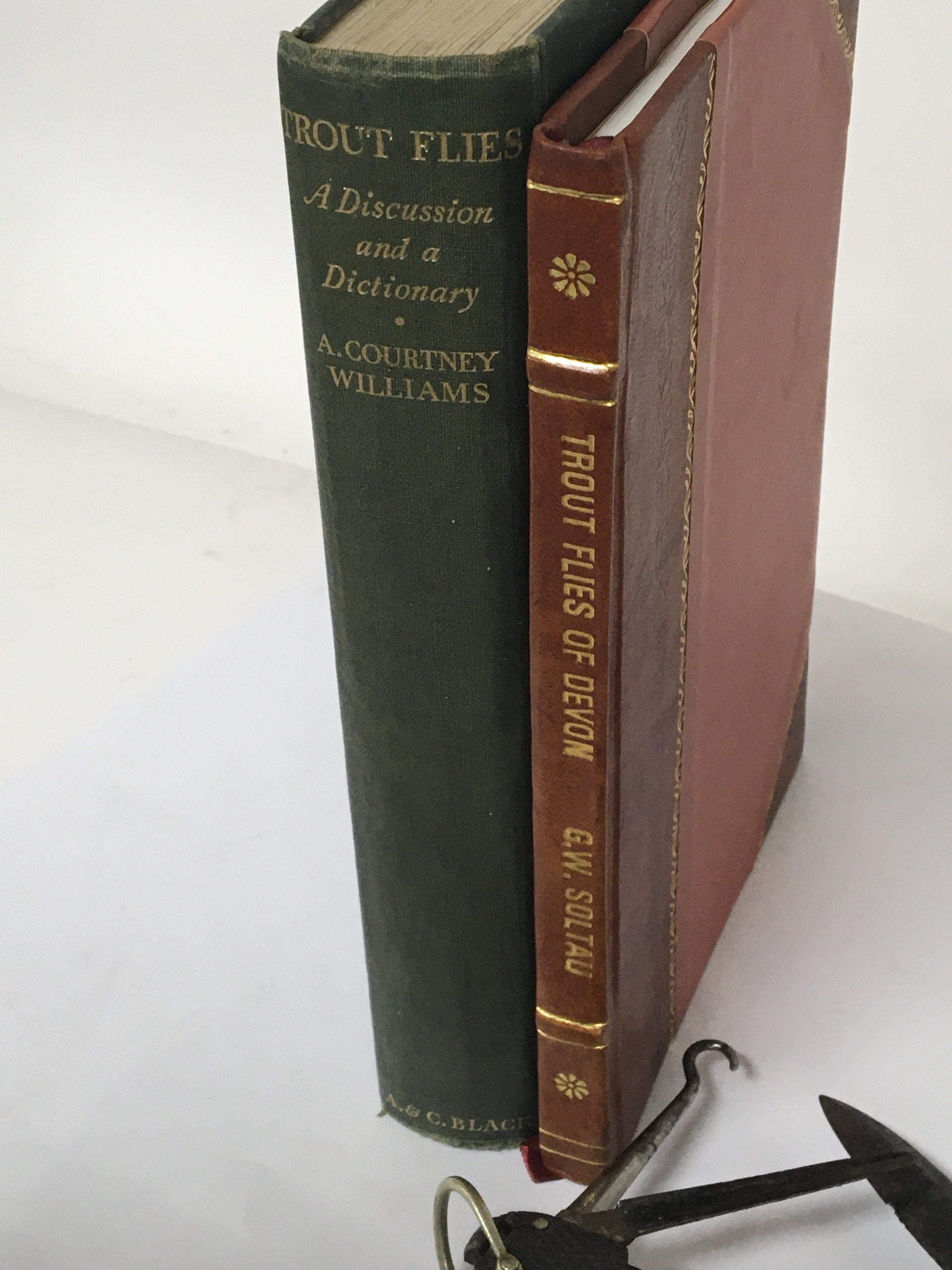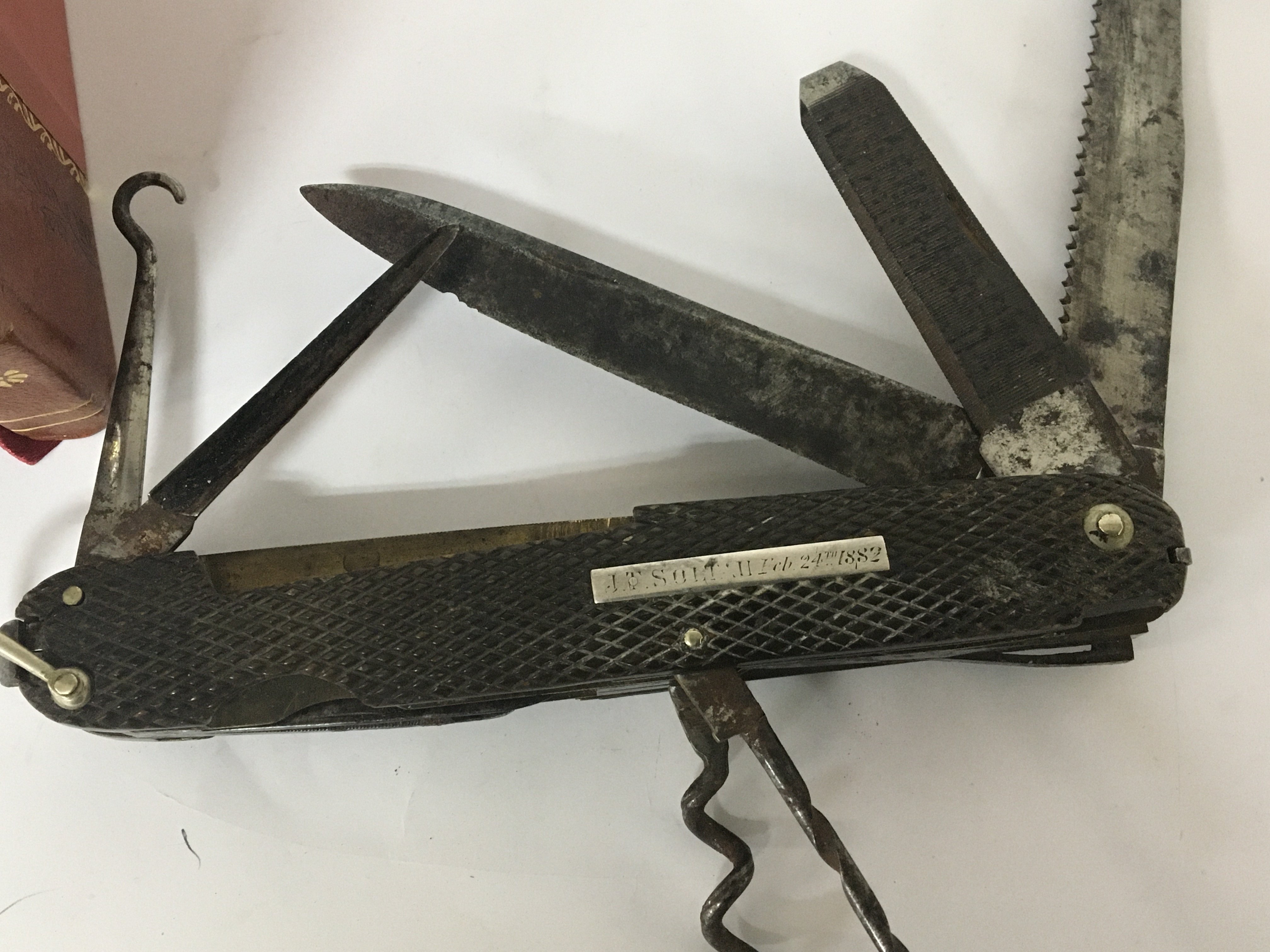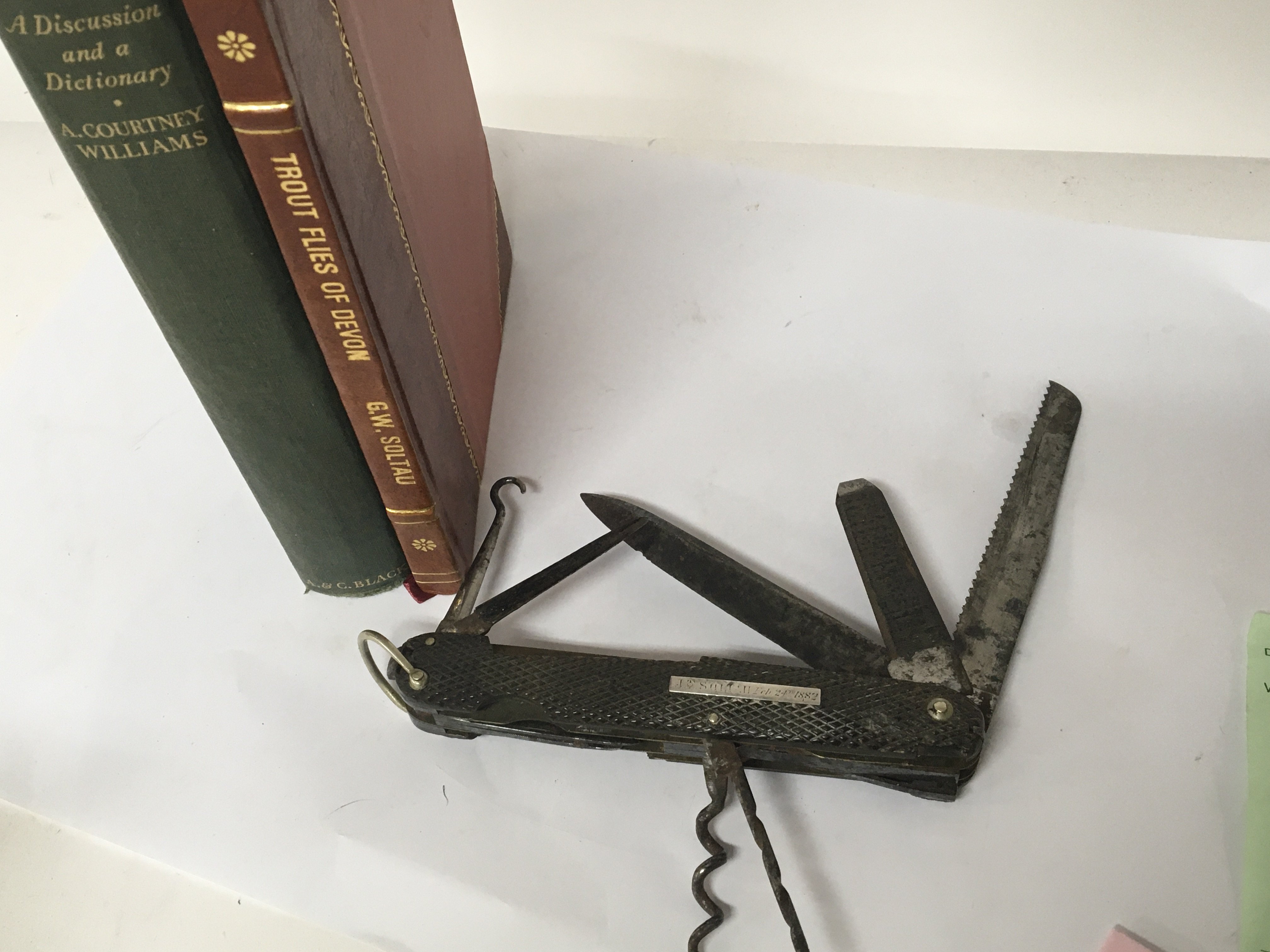 An Extremely rare and interesting 19th Century circa 1860 multi blade folding knife the multi purpose knife owned by the 19th Century esteemed fly fishermen G W Soltau and JT Soltau owned 1882. Knife length 15.5cm sold with two books including Trout Flies a discussion and Dictionary by ACourtney Williams and a leather bound book Trout flies of Devon by GW Soltau.