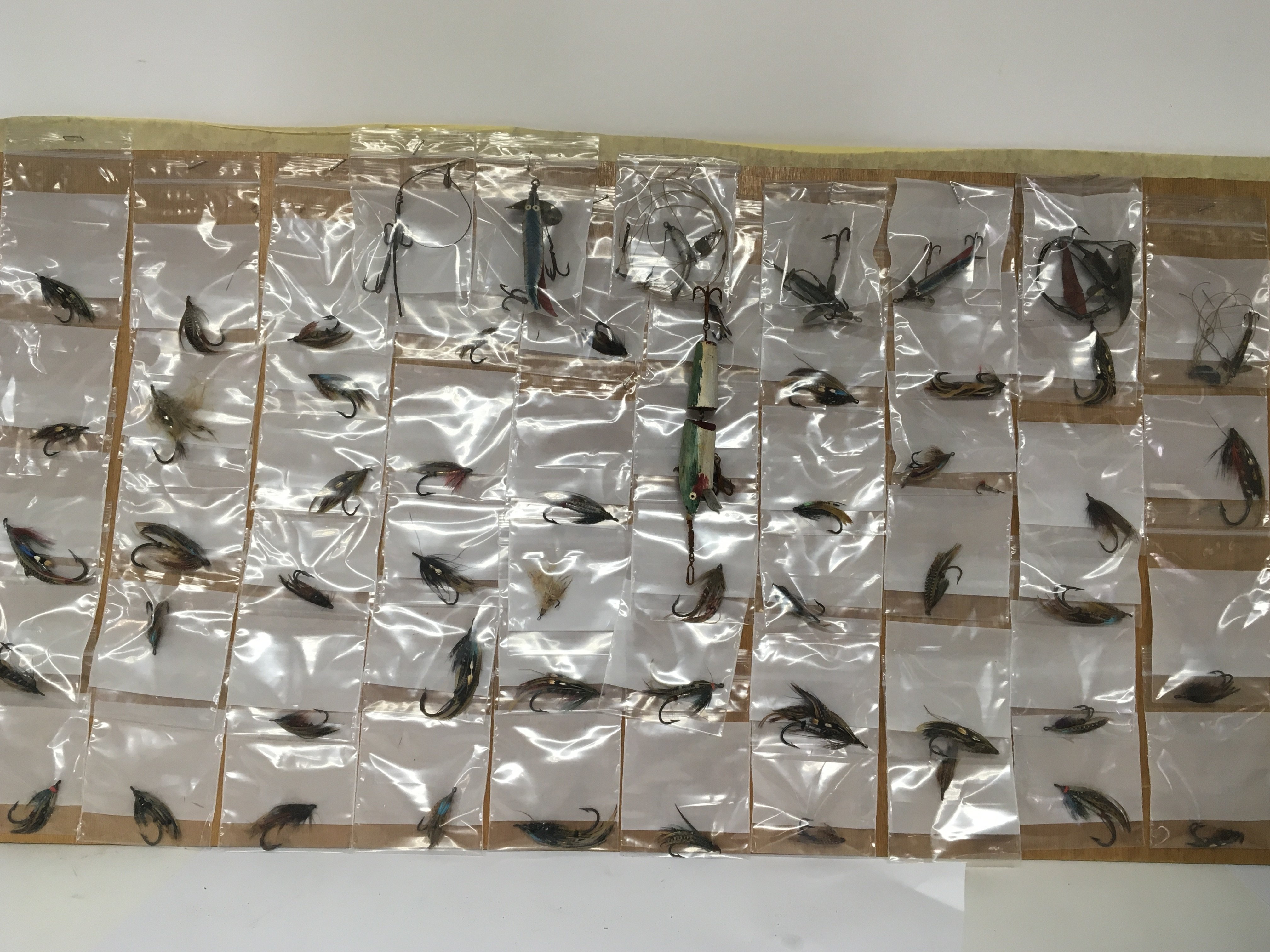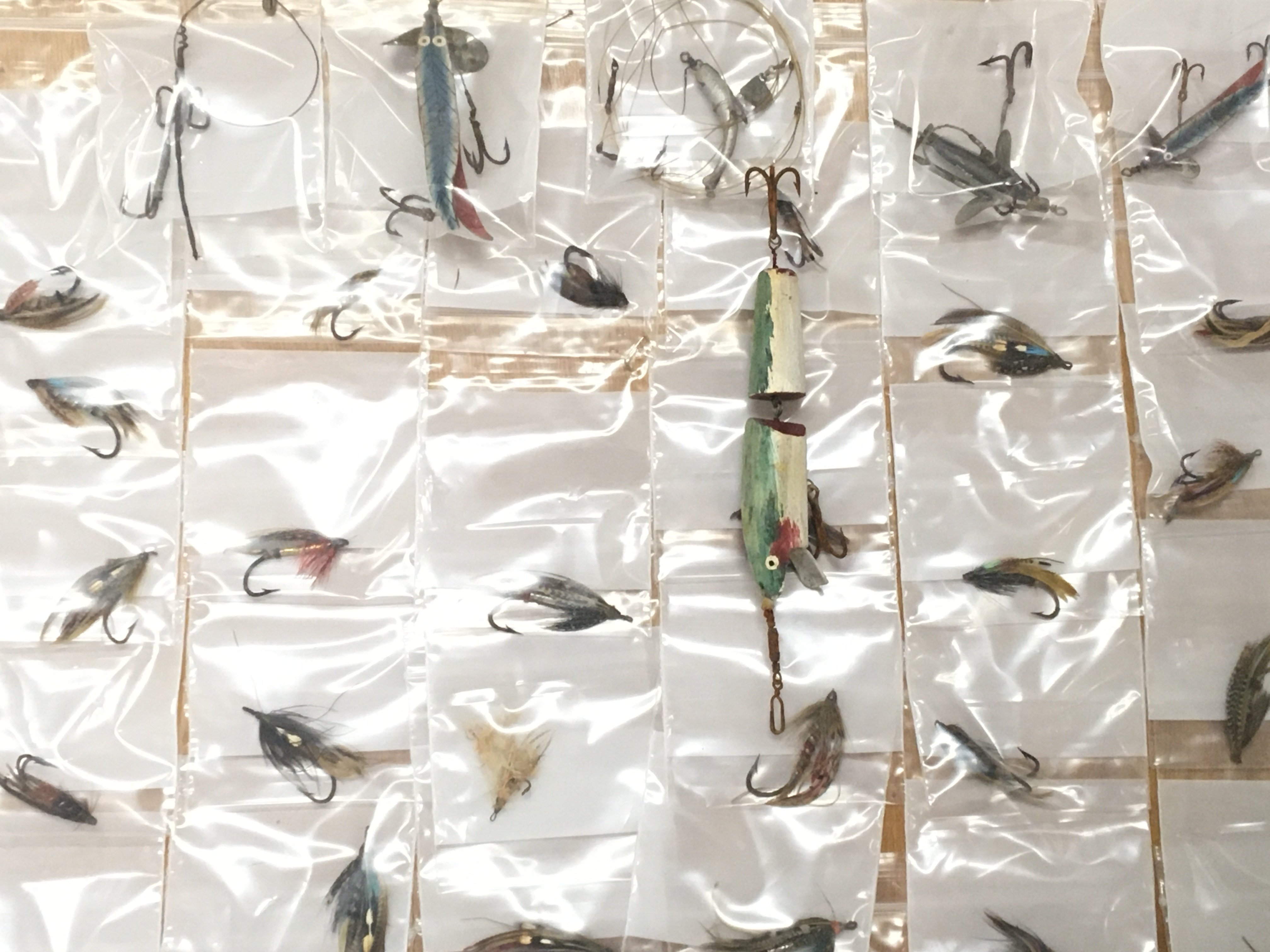A collection of Antique fly fishing flies and painted wood fishing lures presumed for pike fishing. All well presented on a board.