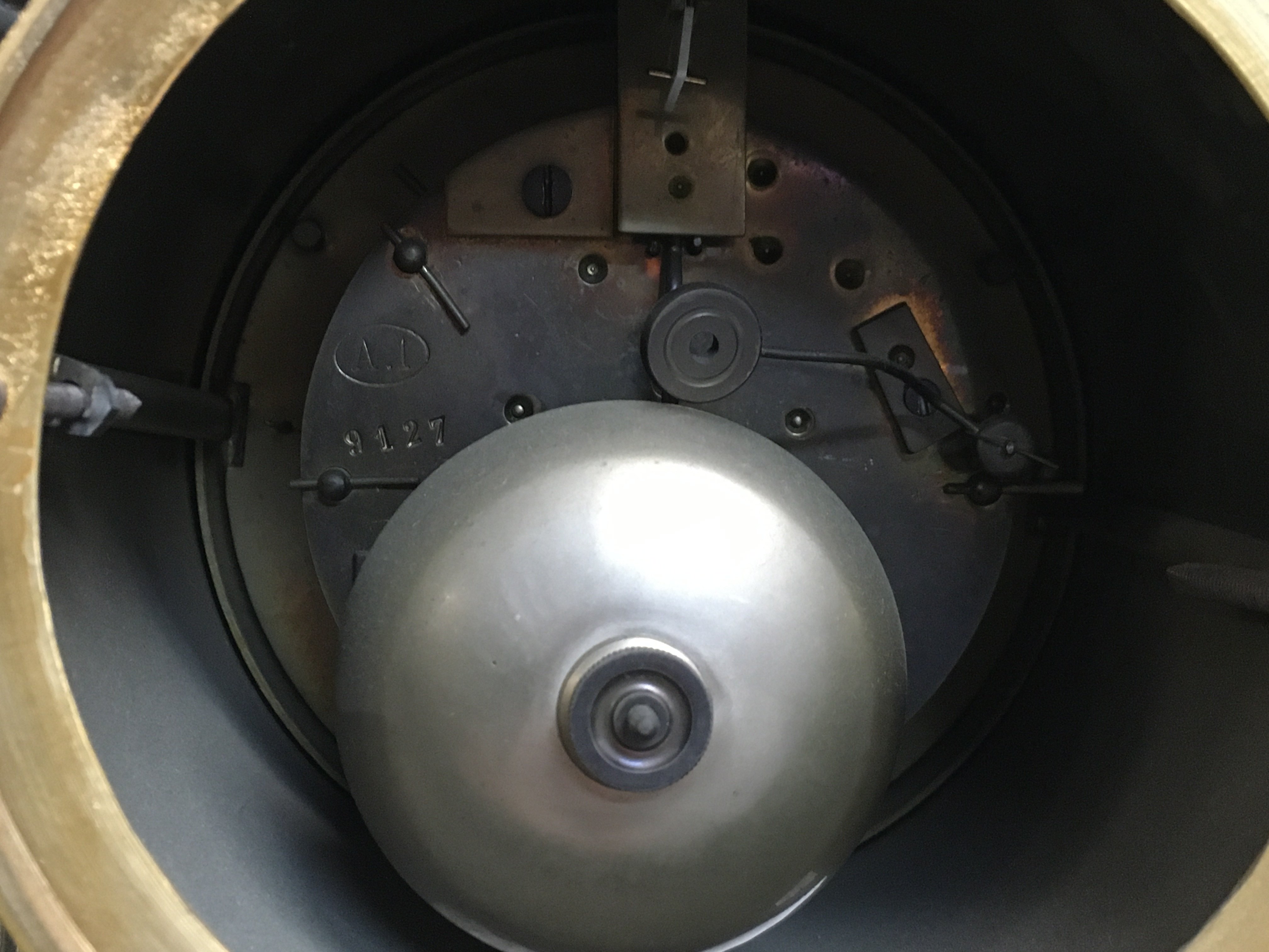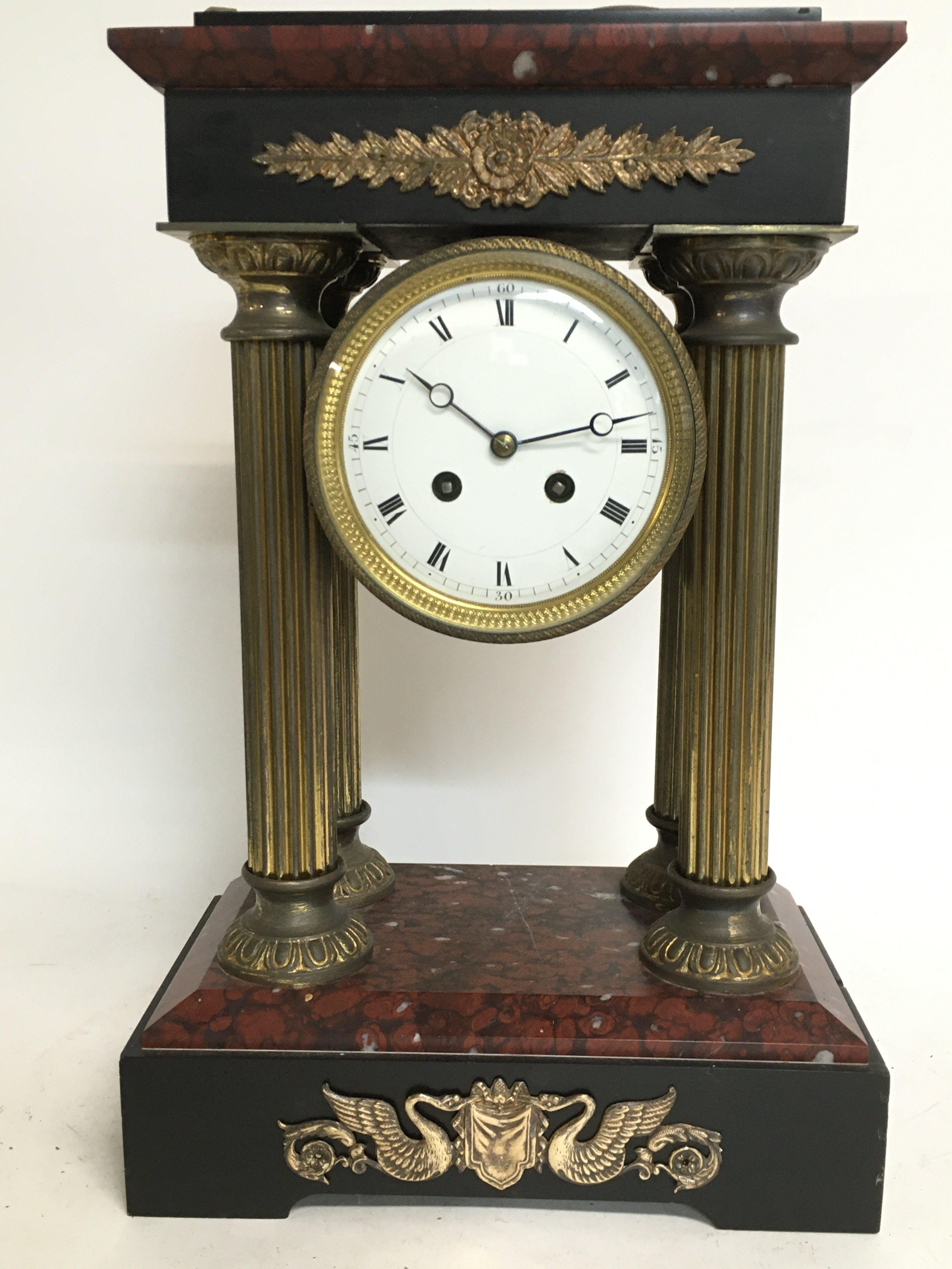 French Empire red marble, slate and gilt clock, 40cm tall.
