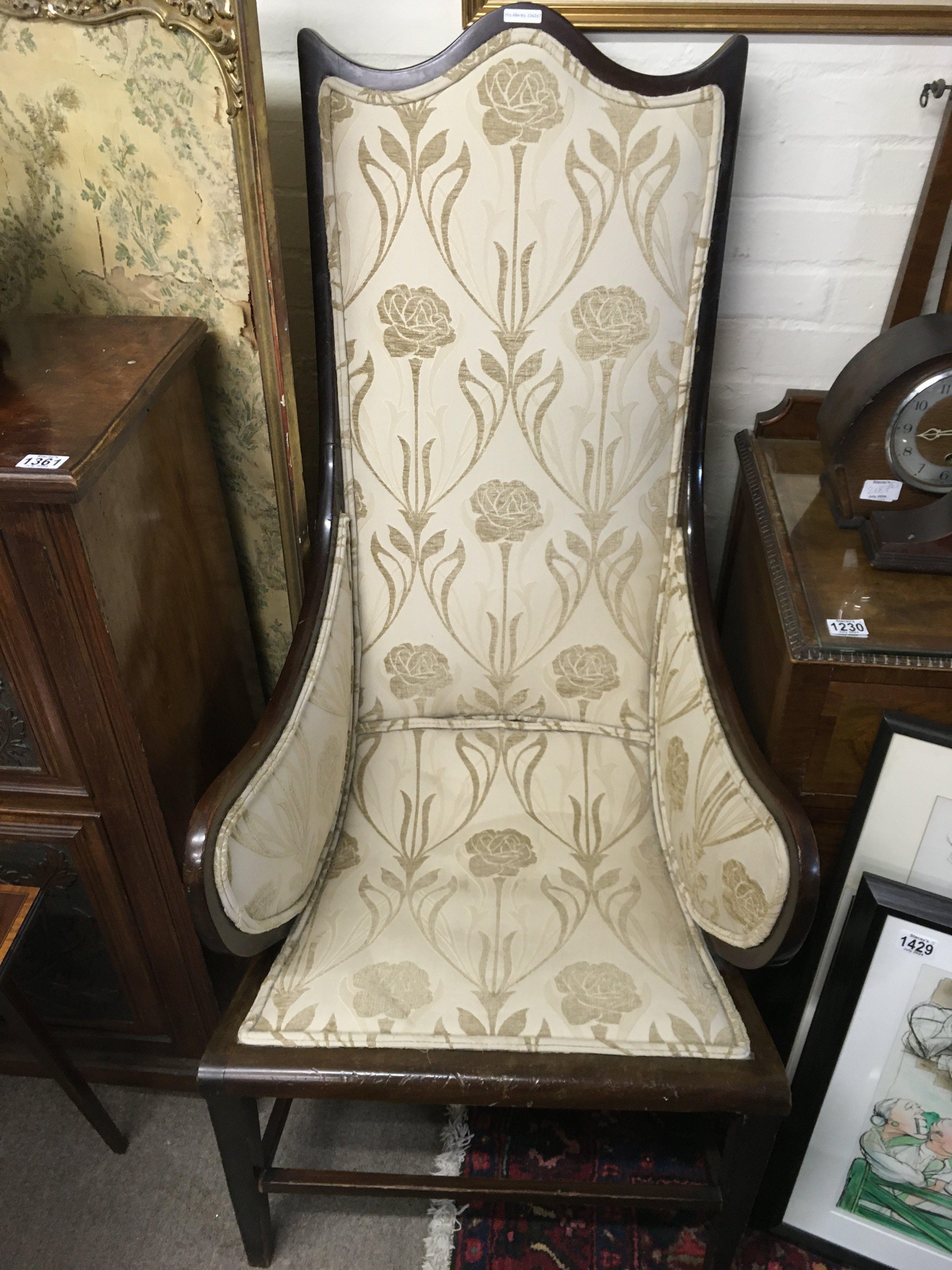 An oak wood Edwardian chair with light beige floral design upholstery. 130cm tall.