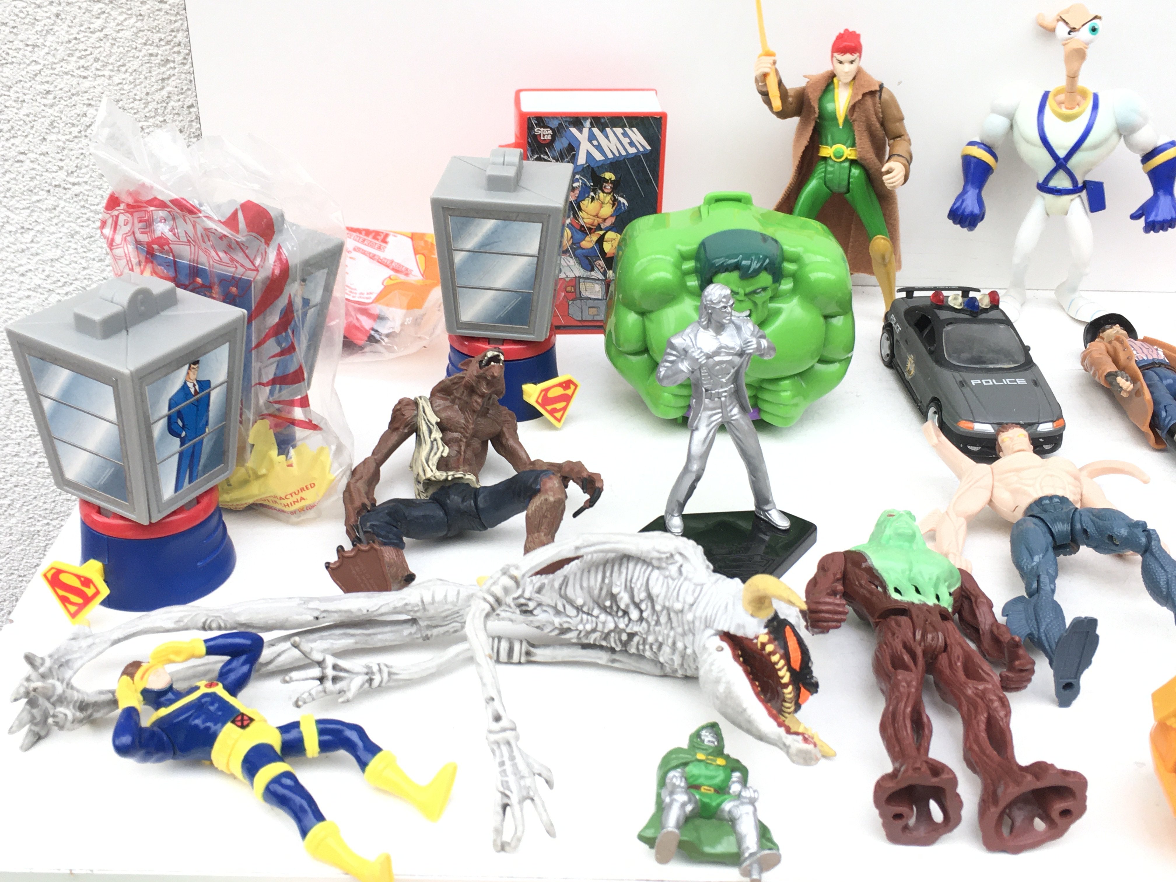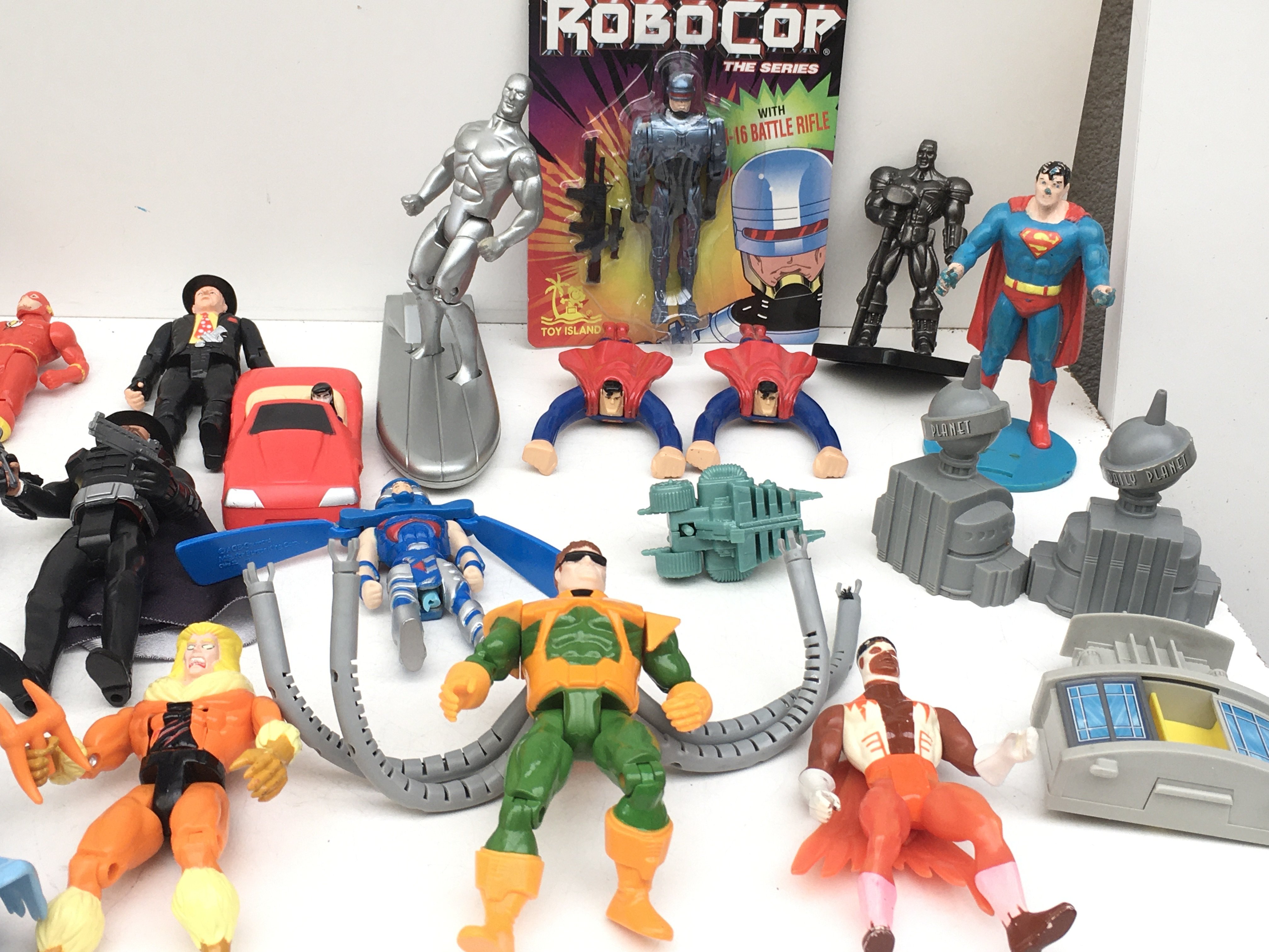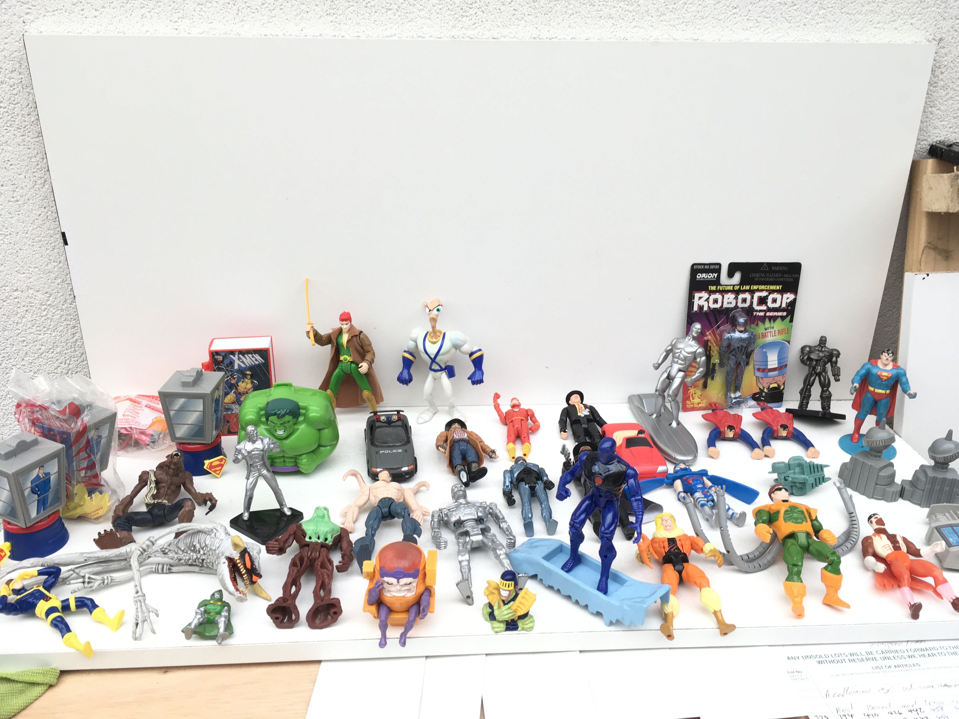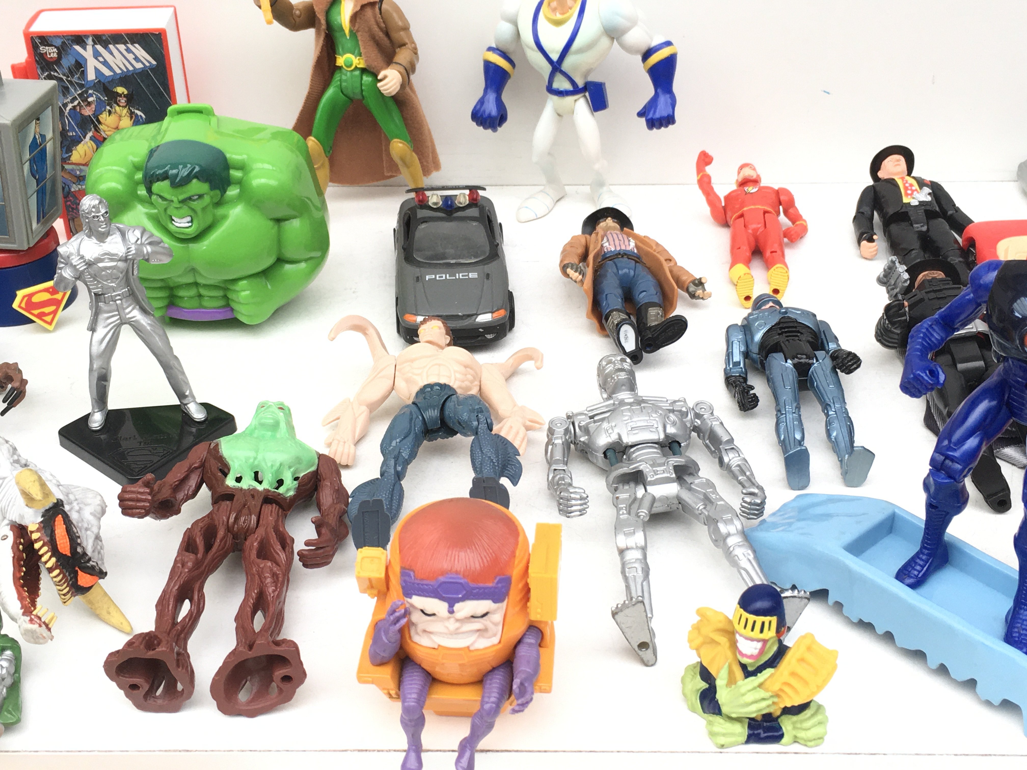 A varied collection in excess of 40 pieces super hero related items mostly figures but some accessories by various manufacturers.