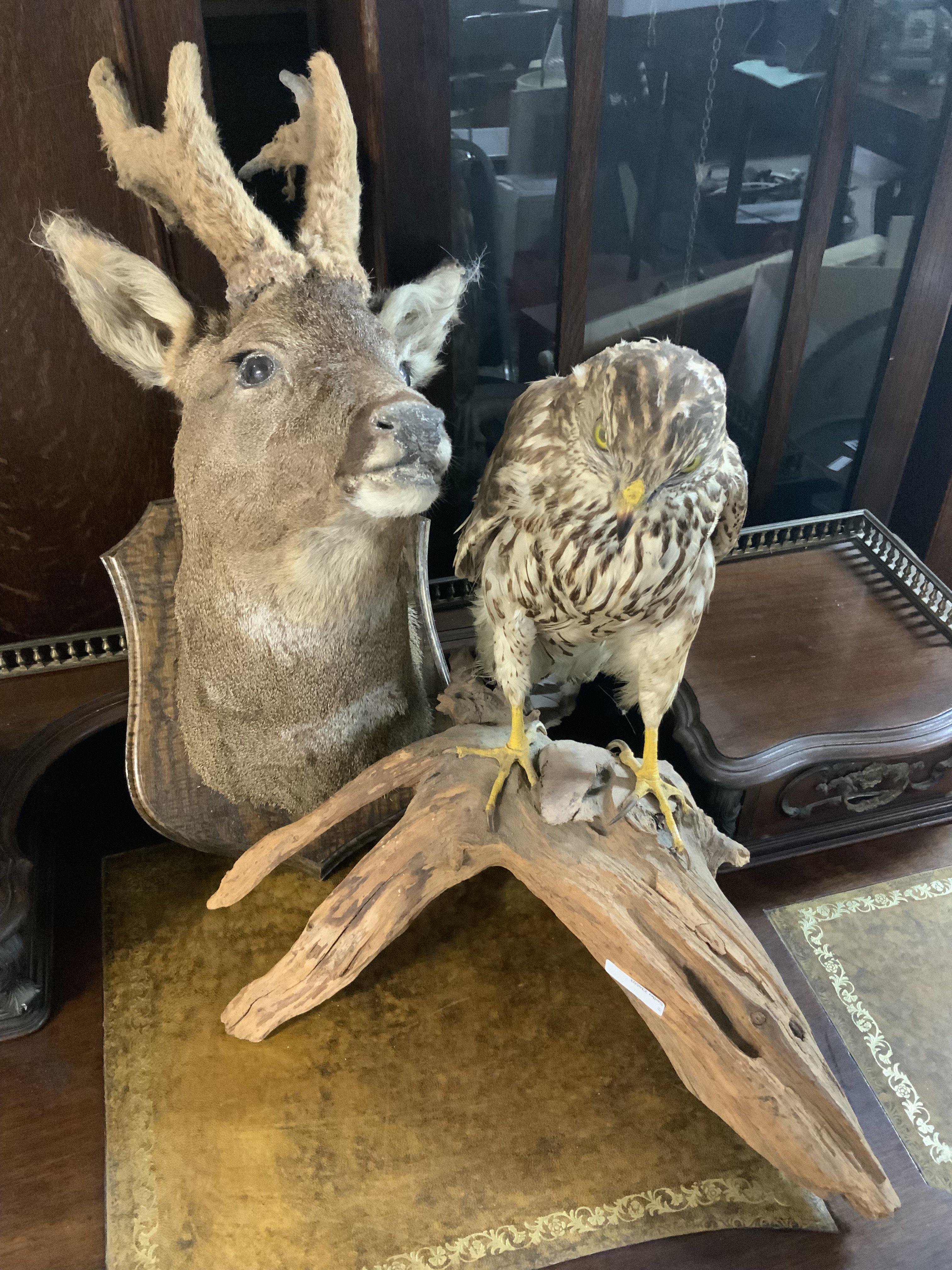 Taxidermy Roe deer head, Taxidermy hawk on wooden stand. (D)