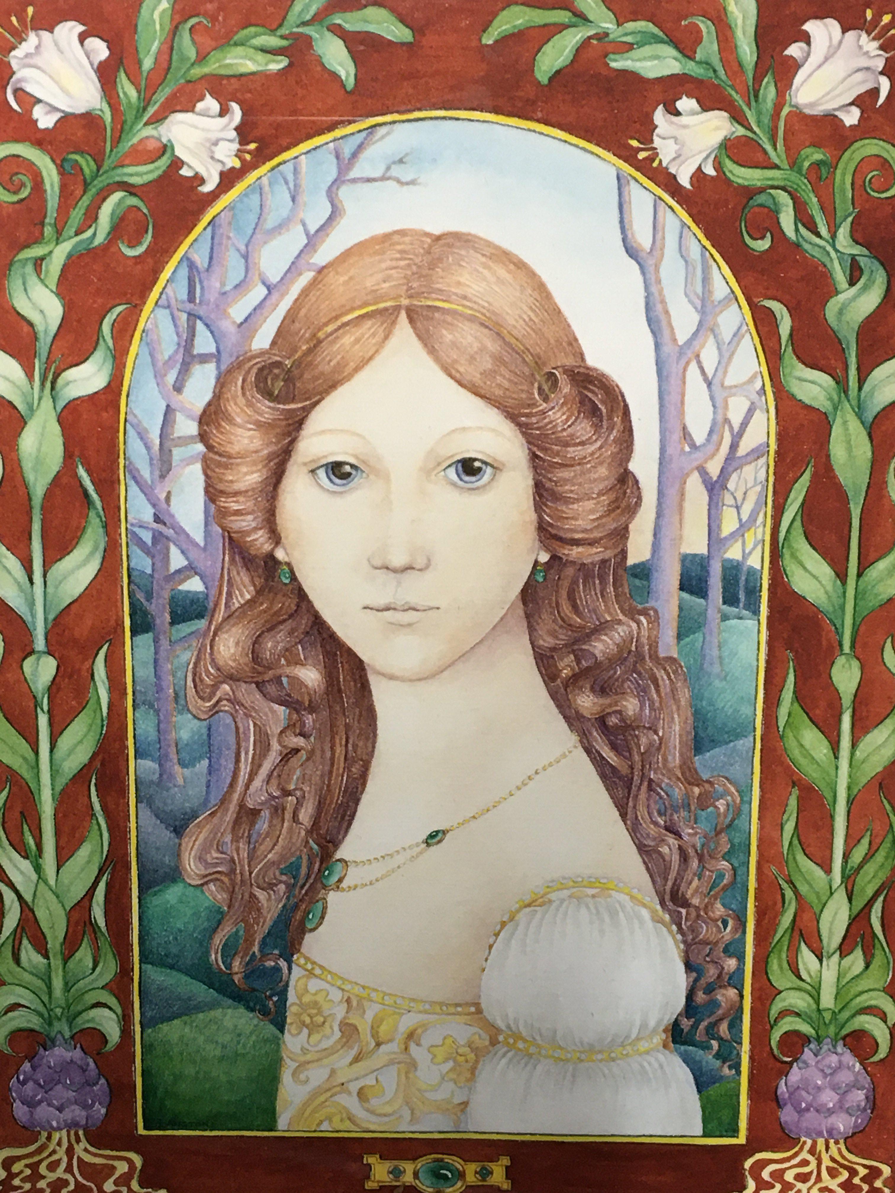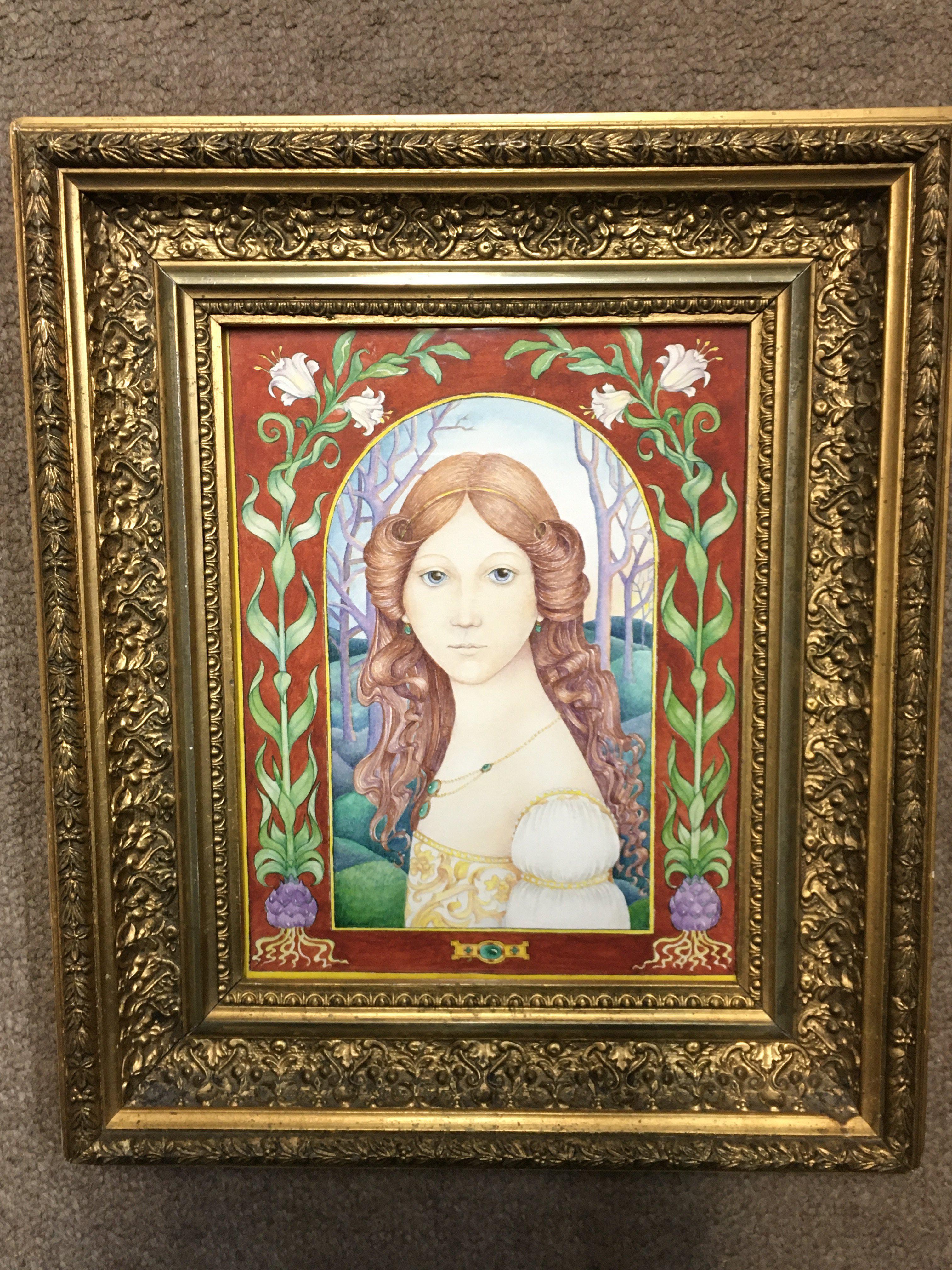 A fine Pre-Raphaelite style watercolour painting signed by E.Langton, 37cm x 31.5cm.