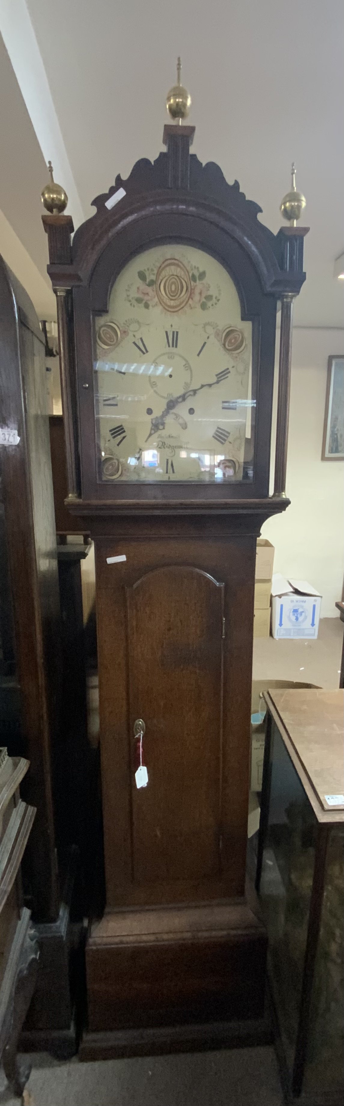 Early oak grandfather clock painted dial Thomas Smith, Ridgewell. 212cm