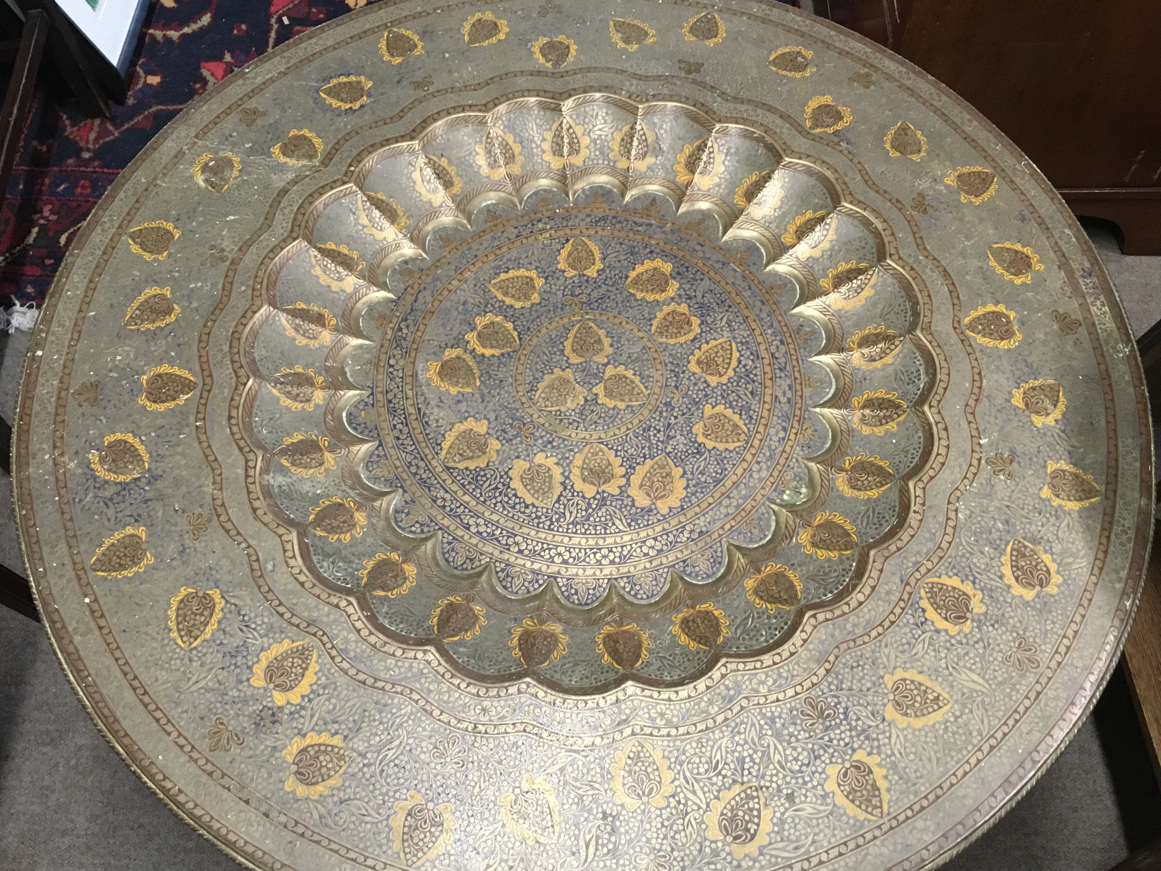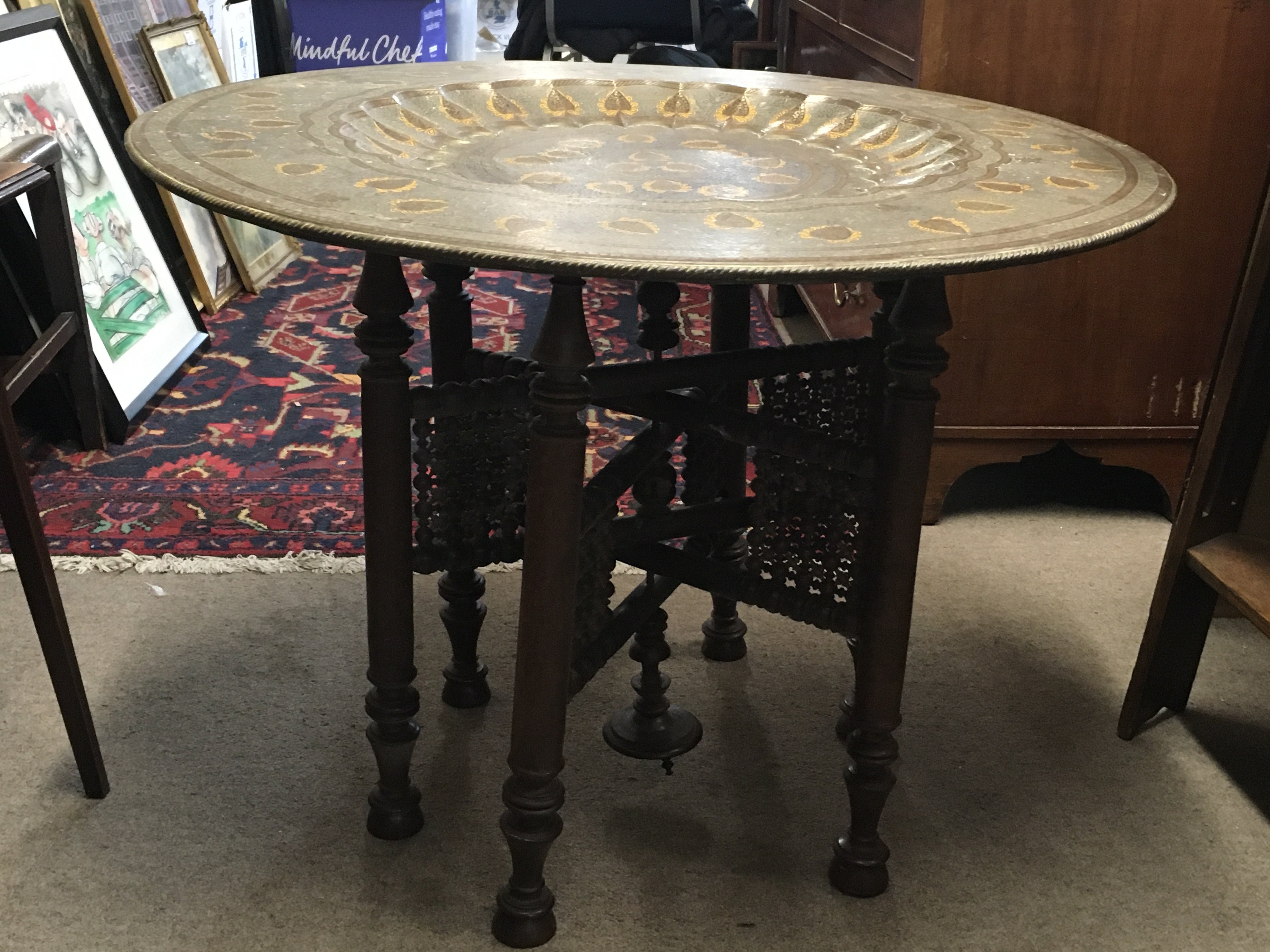 Two early 20th century Middle Eastern brass top tables with a folding base
