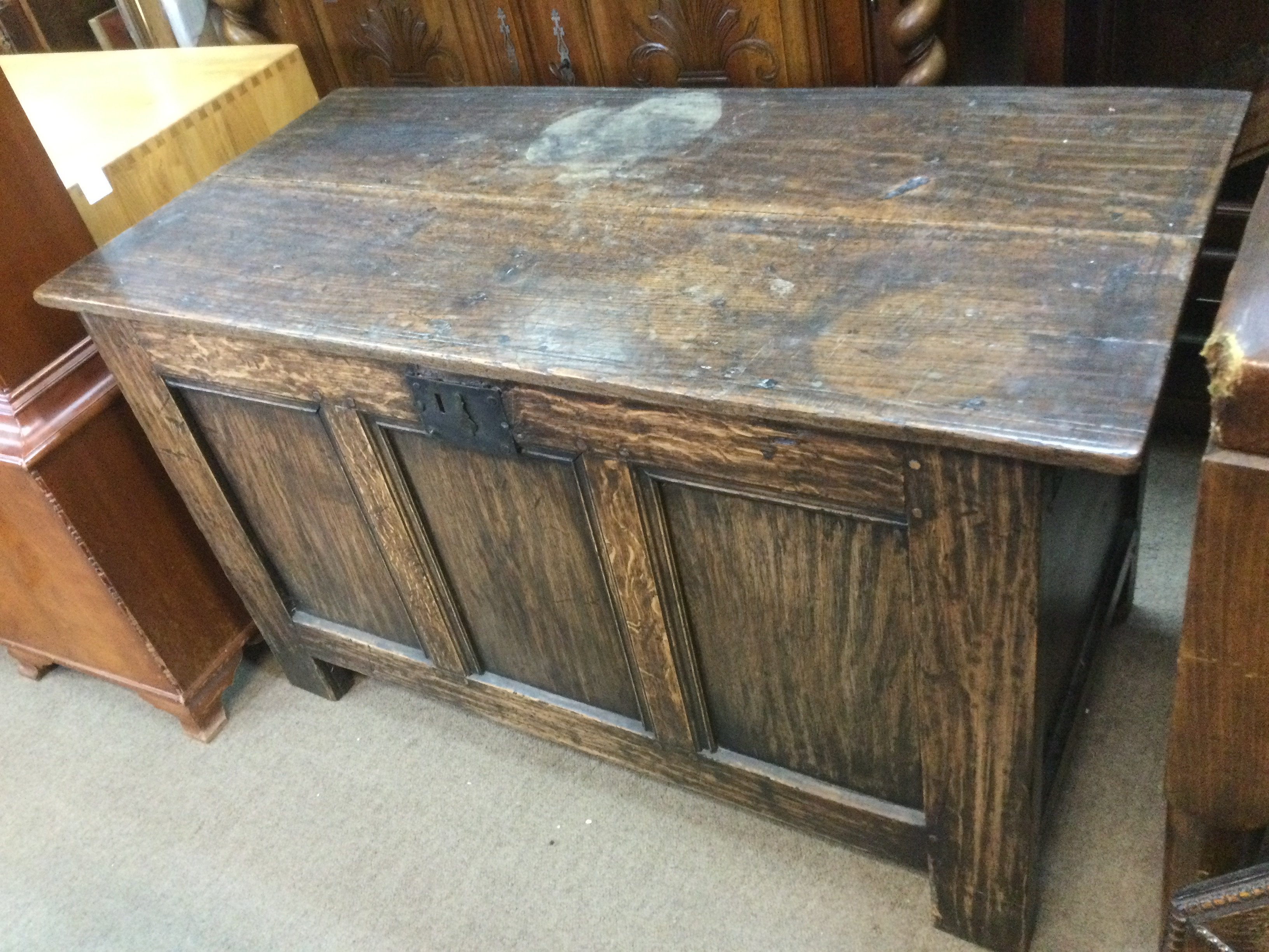 An antique oak chest, approx 112cm x 64cm x 53cm. Shipping category D